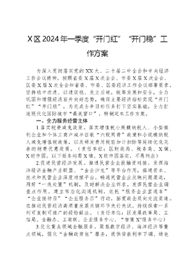X区2024年一季度开门红开门稳工作方案为深入贯彻落实党的XX大、二十届二中全会和中央经济工作会议精神,按照省委X届X次全会、市委X届X次全会、区委X届X次全会和省委、市委、区委经济工作会议部署要求,坚持稳中求进、以进促稳、先立后破,统筹发展和安全,全力巩固和增强经济回升向好态势,确保主要经济指标实现开门红开门稳,为完成全年目标任务打下坚实基础,全力打造现代化国际城市最美窗口,特制定本工作方案。一、全力服务经营主体1.落实税费减免政策。落实增值税小规模纳税人、小型微利企业和个体工商户减半征收六税两费政策和小规模纳税人减免增值税政策,以及研发费用税前加计扣除等延续优化完善的税费优惠政策。(责任单位:区财政局、税务局、X镇、X软件园。以下任务均需X镇、X软件园落实,不再列出)2.促进民营经济发展。推进民营企业投融资对接,发挥海洋经济金融产业联盟、金企沙龙等平台作用,搭建资本、技术和民营企业深度对接平台。畅通民营企业反映问题渠道,用好一线处置机制,及时解决企业诉求。发挥民营企业调查点作用,建立常态化沟通机制,依托服务企业直通车企业接待日企业服务日行动,拓宽政企双向交流渠道。在推动民营经济高质量发展关键环节先行先试,持续探索一系列可复制可推广的经验做法。(责任单位:区发展改革局、工信局、金融办、工商联、企业服务中心、智慧X服务中心)3.优化重点领域金融服务。聚焦数字经济、海洋经济等重点领域,强化金融政策包服务,提供贷款利率下调、绿色审批通道等专项金融支持。加大中小微企业金融支持,依托省金服云平台,帮助企业申请增产增效贷等专项贷款,助力企业纾困解难。鼓励金融机构扩大小微企业首贷、信用贷投放,量身打造快易贷、科技贷等多种普惠金融产品,更好满足中小微企业贷款需求。发挥产业基金作用,持续扩大朱紫坊基金港能级,聚焦重点产业链,引导产业基金投向本土优质企业,大力服务实体经济。(责任单位:区金融办、国投集团)4.推动企业上市融资。持续实施榕树计划,鼓励企业通过资本市场做大做强,做好阶梯式培育,为企业提供全流程综合上市解决方案。建立跟踪服务上市机制,加大上市后备企业服务力度,推进华电新能、誉凯贸易等企业加速上市。(责任单位:区金融办)5.推动营商环境升级。深度融入全国统一大市场,围绕营造更加公平的市场环境,全面落实公平竞争制度,持续做好市场准入隐性壁垒破除工作。深化一件事一次办改革,推动一件事事项全部纳入区政务服务大厅综合受理窗口,精简办事环节,提高一件事办理服务质量和效率。融入两岸融合发展示范区建设大局,加快谋划一批闽台融合项目,依托海丝中央法务区X片区,推进X涉台公共法律服务中心落地,打造涉台司法服务优选地。推进信用体系建设,推行市场主体以专项信用报告替代无违法记录证明,归集、更新和上传涉及我区市场主体无违法记录证明需核查的信用信息。(责任单位:区委台港澳办、区市场监管局、行政服务中心、司法局、发展改革局)二、加快推动产业增效6.促进工业稳定提升。鼓励工业企业生产,积极宣传省、市一季度增产增效奖励政策,对符合条件的规上工业企业,及时落实奖励政策。深入实施榕升计划,积极引导企业入驻省工业企业供需平台小升规培育库,对2024年新投产纳统的规上、规下转规上、第一季度新投产纳统的规上等入库工业企业,在省市财政奖励基础上,区级财政按照榕升计划奖补政策给予奖励。(责任单位:区工信局、财政局、X供电公司)7.加快建筑业恢复向好。扶持培育龙头企业,支持企业资质升级、增项,积极推荐年度突出贡献企业参评市级表彰,激励企业增产增效。稳步推进项目建设,强化项目统筹协调力度,进一步提升生产效率,确保建筑业平稳增长。(责任单位:区建设局)8.增强服务业支撑能力。加大商贸服务业市场主体培育力度,落实促进服务业稳增长、商贸行业稳增长等各项政策措施,促进更多中小微企业限下转限上。推动营利性服务业有序增长,发挥人力资源、软件信息、专业技术服务、广告业四大支柱行业支撑作用,带动更多企业扩大经营、加快发展。稳步发展其他服务业,建立健全房地产中介行业风险管理和预警机制,精简房地产经纪机构备案流程;优化交通运输、邮政快递等资源整合,鼓励寄递业企业高质量发展,推动物流智能化、网络化、数字化,增强产业发展后劲。(责任单位:区商务局、发展改革局、工信局、人社局、市场监管局、房管局、建设局、数字办)9.推动产业链延链强链补链。供应链平台经济产业链,鼓励商贸供应链数字化转型,持续做强永辉生活等平台企业,加快打造跨境电商产业园,助力数字贸易发展。文创旅游产业链,融入国家文化产业和旅游产业融合发展示范区建设大局,深化文创走廊建设,优化一核二廊五片区产业布局,打响西湖—白马河—东西河有福之州内河游品牌。光电信息