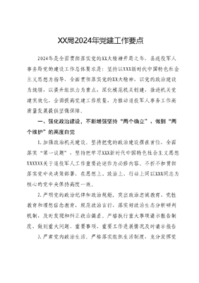 XX局2024年党建工作要点2024年是全面贯彻落实党的XX大精神开局之年,县退役军人事务局党的建设工作总体要求是:坚持以XXX新时代中国特色社会主义思想为指导,全面贯彻落实党的XX大精神,以党的政治建设为统领,以提升组织力为重点,深化模范机关创建,推进机关党建实效化,全面提高党建工作质量,为推动退役军人事务工作高质量发展提供坚强保障。一、强化政治建设,不断增强坚持两个确立、做到两个维护的高度自觉1.加强政治机关建设。坚持把党的政治建设摆在首位,全面落实第一议题,坚持把学习XXX新时代中国特色社会主义思想XXXXXX关于退役军人工作重要论述作为必修内容。不折不扣贯彻落实党中央决策部署,在思想上、政治上、行动上同以XXX同志为核心的党中央保持高度一致。2.严明党的政治纪律和政治规矩。突出政治忠诚教育、党性教育和理想信念教育,规范政治言行,落实好政治生态分析研判机制,及时发现和纠正政治偏差。严格执行重大事项请示报告制度,做到重大问题、重要事项、重要工作进展情况及时请示报告3.严肃党内政治生活。严格落实组织生活制度,充分发挥党内政治生活熔炉作用。每月开展1次主题党日活动,推动与三会一课、民主生活会、组织生活会、民主评议党员等制度有机融合。党员领导干部带头过好双重组织生活,以普通党员身份参加党内活动。坚持重温入党誓词、党员过政治生日等政治仪式,增强党员荣誉感责任感。坚持讲党课制度,党组织书记全年至少讲1次党课。二、深化理论武装,深学细悟笃行XXX新时代中国特色社会主义思想4.加强理论武装。按照上级部署,扎实开展好主题教育。制订并落实党组中心组学习计划,把学习XXX新时代中国特色社会主义思想作为首要政治任务,不断增强四个意识、坚定四个自信、做到两个维护、捍卫两个确立,切实提高政治判断力、政治领悟力、政治执行力。继续推行党组理论学习中心组学习带全局干部职工理论学习、党支部集中学习等方式,努力营造浓厚的学习氛围。5.深入学习宣传贯彻党的XX大精神。紧密结合主题教育制定好学习方案,全面准确学习领会党的XX大精神。通过党组书记讲党课、举办读书班、交流研讨等方式,切实把思想和行动统一到党的XX大精神上来,高举思想旗帜、汇聚奋进力量,进一步推动各项决策部署落地生根。6.巩固拓展党史学习教育成果。巩固拓展不忘初心、牢记使命主题教育、党史学习教育成果,大力弘扬伟大建党精神。加强四史宣传教育,组织老兵宣讲团进校园、进社区、进企业、进军营的等地深入开展XX红色故事,切实将党史学习教育激发出来的热情转化为攻坚克难、干事创业的精气神,持续深化党旗在基层一线高高飘扬我为群众办实事等实践活动,形成常态化长效化机制,以实实在在的行动提升退役军人获得感幸福感荣誉感。7.加强意识形态工作。充分认识意识形态工作极端重要性,将意识形态工作列入党组重要议事日程。坚决落实党组书记牵头抓、分管领导具体抓、其他班子成员抓分管领域的意识形态工作责任体系,落实意识形态工作责任制,定期专题研究意识形态工作,紧盯重要时间节点,加强意识形态领域形势分析研判,防范化解风险隐患特别是政治风险,及时报告意识形态工作情况三、夯实基层基础,深入推动机关党组织全面进步全面过硬8.筑牢支部战斗堡垒。对标落实支部工作条例、机关基层组织工作条例及贯彻落实的具体措施,以三化建设为载体,从思想教育、基础建设、作用发挥等方面推进党支部标准化规范化建设,着力打造政治坚定、组织健全、队伍过硬、机制完善、服务优良、保障有力的党支部。9.加强党员教育管理。加强对入党积极分子的教育、培养和考察,规范党员发展程序,坚持把政治标准摆在首位,严把党员发展入口关,提高发展党员质量。规范党费收缴、使用和管理。坚持教育、管理、监督、服务相结合,推动党员教育管理抓在日常、严在经常。加强流动退役军人党员管理,与xx、xx等发达地区对口试点开展流动服务站建设,增强在外退役军人党员服务。10.发挥党员先锋模范作用。着眼全局、立足岗位,充分发挥党员模范带头作用,在急难险重工作中冲锋在前。持续做好机关支部与社区党组织结对共建工作,常态化组织在职党员到社区报到开展志愿服务活动,帮助群众解决实际困难。四、服务中心大局,以高质量党建引领全局工作高质量发展11.始终牢记国之大者。把党建工作成效体现在贯彻党中央和省委、市委、县委决策部署和工作要求上,体现在提升人民群众满意度上。切实找准党建服务中心大局的切入点和结合点,探索推动党支部、广大党员发挥作用的有效载体和工作抓手。12.深入推进抓党建促乡村振兴。持续派强用好驻村第一书记和工作队,全面落实待遇保障和关心关爱政策。整合单位资源力量助推村级发展,党组书记每年至少到村调研1次,指导发展壮大集体经济和美丽村庄建设,推动联系村做好产业振兴、文