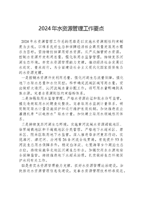 2024年水资源管理工作要点2024年水资源管理工作总的思路是以实施水资源刚性约束制度为主线,以维系良好生态和保障经济社会高质量发展用水需求为目标,坚持精打细算用好水资源,从严从细管好水资源,控制水资源开发利用总量,强化取用水监督管理,持续复苏河湖生态环境,夯实水资源管理能力支撑,推动经济社会发展以水而定、量水而行,为全面建设社会主义现代化国家提供有力的水资源支撑。一是控制水资源开发利用总量。强化河湖生态流量保障,强化地下水取水总量和水位双控,科学确定流域区域可用水量,突出做好大通河、沁河流域水量分配工作,将可用水量明确到具体水源,完善水资源刚性约束指标体系。二是加强取用水监督管理。严格水资源论证和取水许可监管,强化违规取用水问题查处整改,完善取用水监测计量体系,研究制定取水计量设施保护和运行维护长效机制,加快推进农业灌溉机井以电折水取水计量,加快建立取用水领域信用体系。三是持续复苏河湖生态环境。实施黄河流域水资源超载地区、临界超载地区和不超载地区分类管理,严格地下水超采区、禁采区、限采区取用地下水监管,深入推进母亲河复苏行动,实现漳河、滹沱河、汾河等26条河流全线贯通,有效提升53条河流生态用水保障条件,稳定白洋淀、七里海等9个湖泊生态水位,持续实施华北地区河湖生态补水,加强饮用水水源地安全保障监管,持续推进地下水超采治理,扎实做好生态环境保护水利有关工作。四是夯实水资源管理能力支撑。抓好水资源管理法治建设,加快推进水资源管理信息化建设,完善水资源管理技术标准规范,深入推进用水权改革,积极推进水资源税改革,提升用水统计调查能力水平,做好水资源考核工作。