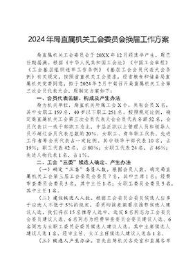 2024年局直属机关工会委员会换届工作方案局直属机关工会委员会于20XX年12月经选举产生,现已任期届满。根据《中华人民共和国工会法》《中国工会章程》《工会基层组织选举工作条例》《基层工会会员代表大会条例》有关规定,按照省直机关工会要求,经省粮食和储备局直属机关党委同意,拟于2024年2月中旬召开局直属机关工会第三次会员代表大会,现制定方案如下:一、会员代表名额、构成及产生办法局为机关单位,局直机关所属工会X个,共有会员X名,其中女职工159名,40岁以下职工251名。按照规定比例,确定局直属机关工会第三次会员代表大会会员代表名额52名,会员代表以一线干部职工为主,中层正职以上管理人员和领导人员不超过会员代表总数的20%。女职工、青年职工代表、先进工作者等会员代表占一定比例。其中领导干部代表10名,占19%;职工代表42名,占80%;女职工代表24名,占46%;先进人物代表1名,占1%。二、工会三委候选人确定、产生办法(一)确定三委委员人数。根据会员人数,确定局直属机关工会第三届工会委员会委员7名,其中主席1名;经费审查委员会委员5名,其中主任1名;女职工委员会委员5名,其中主任1名。(二)建议候选人人数。根据工会委员会委员候选人应多于应选人不低于5%的规定,委员均按差额要求推荐候选人建议人选。我们将在15名推荐人选中,选定8名同志为工会委员会委员建议人选、6名同志为经费审查委员会委员建议人选、6名同志为女职工委员会委员候选人建议人选。其中主席候选人建议人选1名,经审主任、女工主任候选人建议人选各1名。(三)候选人产生办法。首先由局机关各处室和直属各单位工会民主推荐,本届局直属机关工会综合推荐意见并研究讨论,提出局直属机关工会第三届工会委员、经费审查委员和女职工委员候选人建议名单,征求驻局纪检组(机关纪委)意见后,在一定范围内进行公示,再经局党组审查同意,报省直机关工会审定。最后提交会员代表大会进行差额选举。)。三、大会的主要议程大会由筹备工作领导小组组长主持,主要议程是:1.宣布开会,全体起立,奏《国歌》;2.报告会员代表到会情况;3.局直属机关工会第二届工会主席作工作报告;6.审议局直属机关工会第三届经费审查委员会工作报告;7.审议局直属机关工会第三届会员代表大会选举办法;8.审议大会总监票人、监票人名单,宣布大会计票人名单;9.审议三委候选人名单及基本情况(工作人员宣读);10.以无记名投票方式进行选举。(休会30分钟,统计选票情况)11.总监票人公布计票结果;12.主持人宣布三委当选名单;13.表决确定第三届工会委员会任期;14.审议《省粮食和储备局直属机关工会第三次会员代表大会关于省粮食和储备局直属机关工会第二届委员会报告的决议(草案)》;15.审议《省粮食和储备局直属机关工会第三次会员代表大会关于省粮食和储备局直属机关工会第二届经费审查委员会报告的决议(草案)》;16.省直机关工会领导讲话;17.局党委领导讲话;18.全体起立,奏《国际歌》;19.宣布会议闭幕。(大会结束后,三委召开会议,确定工作分工)四、大会选举办法为了确保大会依法依规顺利进行,根据有关规定研究制定了《省粮食和储备局机关工会第三次会员代表大会选举办法(草案)》,提交大会审议通过后生效。