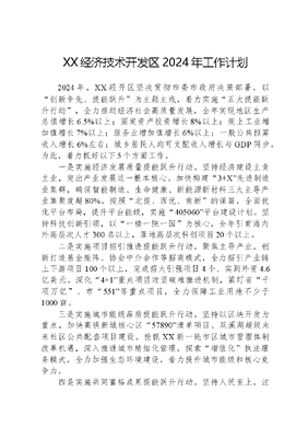 XX经济技术开发区2024年工作计划2024年,XX经开区坚决贯彻市委市政府决策部署,以创新争先、提能跃升为主题主线,着力实施五大提能跃升行动,全力推动经济社会高质量发展,全年实现地区生产总值增长6.5%以上;固定资产投资增长8%以上;规上工业增加值增长7%以上;服务业增加值增长6%以上;一般公共预算收入增长6%左右;城乡居民人均可支配收入增长与GDP同步。为此,着力抓好以下5个方面工作。一是实施经济发展质量提能跃升行动。坚持经济建设主责主业,突出产业发展这一根本核心。加快构建3+X先进制造业集群,确保智能制造、生命健康、新能源新材料三大主导产业集聚度超80%。按照北提、西优、南新的谋篇,全面优化平台布局,提升平台能级,实施405060平台建设计划。坚持科技创新引领,以一楼一院一园为核心,全年引育海内外高层次人才300名以上,落地高层次科创项目20个以上。二是实施项目招引推进提能跃升行动。聚焦主导产业,创新打造基金矩阵、协会中介合作等招商模式,全力招引产业链上下游项目100个以上,完成招大引强项目4个、实到外资4.6亿美元。深化4+1重点项目攻坚破难推进机制,紧盯省千项万亿、市551等重点项目,全力保障工业用地不少于1000亩。三是实施城市能级品质提能跃升行动。坚持以区块开发为重点,加快高铁新城核心区57890清单项目、双溪湖超级未来社区公共配套项目建设。抢抓XX新一轮市区城市管理体制改革机遇,深入推进城市精细化管理,探索增值化执法服务模式,全力加强生态环境建设,着力提升城市能级和核心竞争力。四是实施共同富裕成果提能跃升行动。坚持人民至上,注重扩大就业容量,全年新增城镇就业4600人以上;持续推动教育优质均衡发展,开工建设4所中小学,新增学位6960个;深化医联体建设以及沪杭名医到经开活动;加强141基层社会治理体系建设,全力维护社会和谐稳定。五是实施干部队伍建设提能跃升行动。坚持全面加强党的领导和全面从严治党,强化党建引领,持续巩固拓展省委巡视整改和主题教育成效,夯实基层基础,深化国企改革、招商体制改革、区街管理体制改革,不断激发干部活力,着力打造以勤政廉政为导向的干部铁军。