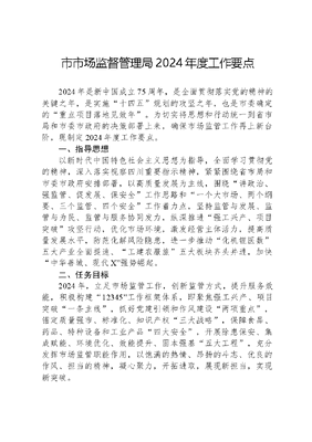 市市场监督管理局2024年度工作要点2024年是新中国成立75周年,是全面贯彻落实党的精神的关键之年,是实施十四五规划的攻坚之年,也是市委确定的重点项目落地见效年。为切实将思想和行动统一到省市局和市委市政府的决策部署上来,确保市场监管工作再上新台阶,现制定2024年度工作要点。一、指导思想以新时代中国特色社会主义思想为指导,全面学习贯彻党的精神,深入落实视察四川重要指示精神,紧紧围绕省市局和市委市政府安排部署,以高质量发展为主线,围绕讲政治、强监管、促发展、保安全工作思路和一个大市场、两个纲要、三个监管、四个安全工作着力点,坚持监管与发展、监管与为民、监管与服务协同发力,纵深推进强工兴产、项目突破攻坚行动,优化市场环境,激发经营主体活力,提高质量发展水平,防范化解风险隐患,进一步推动化机锂医数五大产业全面提速、工建农服旅五大板块齐头并进,加快中华善城、现代X强势崛起。二、任务目标2024年,立足市场监管工作,创新监管方式,提升服务效能,积极构建12345工作框架体系,即聚焦强工兴产、项目突破一条主线,抓好党建引领和作风建设两项重点,锚定质量强市、标准化、知识产权三大战略,保障食品、药品、特种设备和工业产品四大安全,开展除患保安、集成赋能、环境优化、效能提升、固本强基五大工程,充分发挥市场监管职能作用,以饱满的热情、昂扬的斗志、优良的作风、担当的精神,凝心聚力,开拓进取,展现新担当,实现新突破。(一)高质量发展能力更加强劲。积极争创省质量强市,争取省政府、国务院督查激励,争创省级以上知名品牌5件,争取获评X对区(市)级政府质量工作评议A级;加快省级高档数控机床创新中心—鲁班实验室建设,扩大国家机床检验检测中心在全国的影响力和重点项目参与度。(二)知识产权工作成效更加突出。新增授权发明专利200件,其中高价值发明专利60件,新增商标注册量2600件,新增马德里国际商标注册量8件,知识产权质押融资金额超过5亿元。到2024年底,我市发明专利拥有量突破1000件,万人发明专利拥有量超过6.35件,商标累计注册量达到2.6万件,高价值发明专利拥有量达到380件,万人高价值发明专利拥有量2.36件。(三)安全监管效能更加彰显。完成21个镇街食药安办规范化建设,完成(本)级食品安全抽检4300批次,(承担市级以上抽检2500批次以上,辖区每千人抽检量达到4批次,)不合格食品后处置及时率达到100%。实现学校、养老机构餐饮单位互联网+明厨亮灶100%全覆盖,使用山餐安系统对餐饮服务提供者培训考核100%全覆盖。(四)营商环境优化打造更加有效。积极对上争取揭榜挂帅试点工作,完成个转企540户,实现12315投诉按时初查率、投诉按时办结率和举报按时核查率三个100%,枣解决·枣满意诉求办理按时办结率100%。三、工作措施(一)聚焦聚力全市中心工作,秉承精益求精的信念突出要素支撑,坚定不移推进高质量发展实现新跃升。主动服务和融入新发展格局,坚持系统观念、改革创新,锚定化机锂医数五大产业,强化质量对构建现代产业体系的基础支撑,突出标准对社会发展的引领带动,提升知识产权促进创新发展的内生动能,强化平台支撑作用,全面提高发展实效。1.深入实施质量强市战略。开展质量提升行动,进一步发挥市质量强市及品牌战略推进工作领导小组牵头抓总作用,持续完善质量基础设施一站式服务平台;加强企业培育,按照好品X建设要求,围绕X制造,深入开展企业调研与品牌培育,组织开展好品X品牌、省高端品牌培育企业、省优质品牌、省知名品牌等品牌宣传发动及推荐申报工作,启动市市长质量奖评选活动;充分发挥新闻媒体的舆论导向作用,深入开展中国品牌日、质量月等系列宣传活动,进一步宣传我市质量形象,展示我市品牌风采。2.深入实施知识产权战略。加强知识产权高质量创造,利用专利预审快速通道,积极挖掘培育高价值专利,提升企业知识产权创造水平;以专利贷为抓手,精心打造政企银保服五位一体知识产权金融生态体系,提高知识产权成果转化效率;深入推进蓝天整治行动和铁拳专项行动,严厉打击侵犯商标、专利、地理标志等违法行为;加强对知识产权服务机构的依法监管,规范代理服务行为,维护公平营商环境;积极培育和引进一批高端知识产权服务机构,拓展知识产权资产增值服务;加强知识产权工作队伍建设,为建设知识产权强市提供人才支撑。3.深入实施标准化战略。持续跟进两家企业申报国家级标准化试点项目进度,抓好两个试点单位建设稳步推进,总结推广试点工作经验,夯实区域标准化基础,实现效益全方位跃升;加快推进数字乡村标准体系建设,实施乡村振兴标准化行动,指导小党山村产业引领、综合整治美丽乡村标准化试点建设;积极引导企事业单位和社