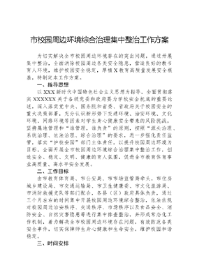 市校园周边环境综合治理集中整治工作方案为切实解决全市校园周边环境存在的突出问题,通过开展集中整治,全面消除校园周边各类安全隐患,营造良好的教书育人环境,维护校园安全稳定,厚植X教育高质量发展安全根基,特制定本工作方案。一、指导思想以XXX新时代中国特色社会主义思想为指导,全面贯彻落实XXXXXX关于各级党委和政府要为学校安全托底的重要论述,深入落实党中央、国务院和省委、省政府关于校园安全的重大决策部署,充分认识新形势下交通环境、治安环境、文化环境、网络环境等因素对学生身心健康安全带来的风险挑战,坚持属地管理和谁管理,谁负责的原则,按照源头治理、系统治理、依法治理、综合治理的要求,进一步强化责任监管,落实护校安园部门主体责任,以提升校园周边环境为目标,全面开展全市校园周边环境综合治理集中整治工作,创造安全、稳定、文明、健康的育人氛围,促进全市教育体育事业高质量、高水平安全发展。二、工作目标由市教育体育局、市公安局、市市场监管局牵头,市住房城乡建设局、市交通运输局、市卫生健康委、市文化旅游局、市消防救援支队等部门配合,各县(区)政府具体负责,通过三个月左右的时间集中开展校园周边环境综合整治,依法依规对校园周边治安秩序、交通秩序、市场秩序以及食品安全、消防安全、自然灾害隐患等进行集中排查整治,并形成常态化工作机制,着力解决全市校园周边环境存在问题,有效防范各类安全事件,切实保障师生身心健康和生命安全,维护校园和谐稳定。三、时间安排集中整治工作从2024年3月1日起至2024年5月31日,分三个阶段组织实施。(一)宣传发动阶段(2024年3月1日至3月15日)召开全市校园周边环境综合治理集中整治工作动员会,通过电视、广播、宣传栏以及宣传材料等方式,集中宣传《中华人民共和国未成年人保护法》《中小学幼儿园安全管理办法》《国务院办公厅关于加强中小学幼儿园安全风险防控体系建设的意见》《省人民政府办公厅关于加强中小学幼儿园安全风险防控体系建设的实施意见》等法律法规和文件要求,推动全社会广泛知晓校园周边环境整治工作的重要意义,动员全社会力量积极参与校园周边环境综合治理。(二)隐患排查阶段(2024年3月16日至3月31日)市级各有关部门、各县(区)按照集中整治工作要求,深入开展行业领域和县(区)所辖学校周边隐患排查工作,梳理《问题隐患清单》,建立《问题隐患整改责任清单》,按照边排查边整治边规范的要求,同步推进问题整改。(三)集中整治阶段(2024年4月1日至5月31日)1.县(区)、学校自查自纠(4月1日至5月20日)。由各县(区)、省属在临高校、市直各类学校对标《问题隐患清单》《问题隐患整改责任清单》,形成《问题隐患整改销号清单》,明确责任主体,落实整改责任,限时整改销号。2.市级督查整改(5月21日至5月31日)。由市级牵头部门组织相关部门,对各县(区)、省属在临高校、市直各类学校自查自纠情况进行督查,对工作推动缓慢、措施不力、效果不明显的,下达《督查整改通知书》,确保所有问题隐患得到有效整治。四、整治重点及任务分工(一)开展校园周边治安秩序专项整治。深入排查整治校园周边治安隐患,重点排查管控校园周边易肇事肇祸精神病、刑释解教、因涉校涉生矛盾纠纷扬言报复、吸毒前科等重点人文可居文库——海量学习资料,手机电脑均可下载www.wenkeju.com员,严防造成现实危害。强化对校园周边宾馆旅社、出租屋、娱乐场所、会所、酒吧、烧烤摊等的安全检查,严防发生涉校涉生案件。从严开展公安部关于未成年人入住五必须工作,依法严厉打击查处涉嫌对未成年学生实施性侵、猥亵、暴力伤害等各类违法犯罪行为。牵头部门:市公安局配合部门:市教育体育局、市民政局、市司法局、市文化旅游局、市卫生健康委、市市场监管局责任单位:各县(区)人民政府(二)开展校园周边交通秩序专项整治。深入开展交通安全隐患排查整治,对交通标志标线、信号灯、人行设施、分隔设施等不符合设置规范的,一校一策建立排查整治清单和工作台账,协调相关部门进行联合整改。科学优化道路交通组织,规范停车秩序,缓解校园门口交通拥堵和集中通行压力。上下学高峰时段安排警力加强校园门口交通指挥疏导,组织发动学校教职员工、学生家长、志愿者等,加强学生出行引导和秩序维护。严格交通违法行为查处,紧盯周末、节假日等学生离返校、上下学、集中出行的重要时段和路段,加强路面巡逻管控和执勤执法。加强校车安全监管,推进公交专线建设,方便学生及家长出行。牵头部门:市公安局配合部门:市教育体育局、市住房城乡建设局、市交通运输局、市农业农村局、X公路局责任单位:各县(区)人民政府(三)开展校园周边各类营业性娱乐场所专项整治。严禁在中小学校园及幼儿园周边200米内设立网吧,县级及以上城市严禁在中小学校园及幼儿园周边150米内设立