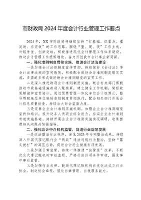 市财政局2024年度会计行业管理工作要点2024年,XX市财政局将继续坚持打基础、抓重点、重实效、求突破的工作思路,围绕整、建、促工作主线,补短争优、创新突破,积极推进现代会计管理工作体系建设,推动会计管理工作提质增效,奋力开创我市会计事业新局面。一、强化准则制度贯彻实施,推进会计法治建设一是加强会计法规制度宣传贯彻。持续做好《会计法》等会计法律法规的宣传教育,积极配合做好会计准则制度制定实施,多渠道多形式做好新会计准则制度的宣贯工作。二是深入推进政府会计准则制度实施。联合有关部门积极推动市政基础设施政府入账核算,建立健全工作机制,做好政策解读和宣贯培训。通过预算管理一体化单位会计核算云,指导帮助基层单位做好准则制度贯彻执行。配合相关部门开展会计信息质量检查,持续加大财会监督力度。三是完善企业会计准则实施机制。加强企业会计准则制度宣传和培训,提升财务人员职业综合能力,夯实企业会计准则有效实施基础。持续开展企业会计准则实施情况调研,收集整理相关问题并加强指导。二、强化会计中介机构监管,促进行业规范发展一是依法整治行业秩序。深化2023年专项整治成果,持续深入开展代理记账行业两类违法违规行为整治,坚持露头就打的高压态势,促进会计行业健康有序发展。二是加强日常监管。持续一体推进放管服改革,不断优化代理记账机构审批流程,严格行政许可条件审核,强化事中事后监管。三是加强行业自律。鼓励代理记账机构自发依法成立行业协会,制定协会章程,强化自律管理、自我服务能力。三、强化会计人才培养,提升专业能力素质一是做好2024年度会计职称和注册会计师考试工作。我们将认真落实省会考办通知精神,严格按照全国统一考试报名条件审核报名人员考试资格,认真做好报名和资格审核工作。紧前制定考试工作方案,成立考试领导小组,与人社、公安等部门建立协调机制,扎实做好考前准备工作。强化监考巡考人员职责,充分利用金属感应器、屏蔽器、无线电监测车等现代技术手段,净化考点周边环境,突出抓好考风考纪考场管理工作。二是抓好高端会计人才选拔推荐工作。积极组织参加省级高层次财会人才岗位能力培训和中青年人才选拔推荐工作。制定出台我市高端会计后备人才培养工作实施意见,扎实做好市级高端会计后备人才选拔培养工作。依法依规扎实做好2024年度我市高级会计师资格评审材料审核工作。三是加强会计人员继续教育管理。认真组织开展我市会计人员继续教育,统一会计人员继续教育管理,规范视同教育登记审核,突出继续教育过程监管。另外,我们科还计划组织1期财务能力提升班。四、强化会计核算考核机制,力争考核争先进位2024年度会计核算考核力争位列全省第一方阵。会计科将坚持以问题为导向,始终把集体荣誉放在第一位,以强烈的事业心和责任感,扎实推进考核工作,确保争先进位。五、强化内控报告主体责任,推动行政事业单位内控建设加强内控编报审核力度,严格落实内控报告主体责任,加强组织领导,加大审核力度,高质量完成我市2023年度行政事业单位内部控制报告编报工作。六、强化主题教育成果,扎实推进行业党建高质量发展一是强化理论武装。深入学习贯彻XXX新时代中国特色社会主义思想和党的XXX精神,走深做实主题教育,努力以党建工作高质量发展引领保障全市注册会计师行业高质量发展。二是坚持分类指导。聚焦诚信建设、人才队伍建设、加强文可居文库——海量学习资料,手机电脑均可下载www.wenkeju.com业务监管等影响行业发展的制约因素,深入开展调查研究,瞄准行业特点打造行业特色,着力解决好行业执业环境问题、后继发展问题。三是激发组织动能。深化行业党建品牌创建,抓好行业党建工作与行业经营业务深度融合,推动工作落实,努力实现一所一品牌。文可居文库——海量学习资料,手机电脑均可下载www.wenkeju.com