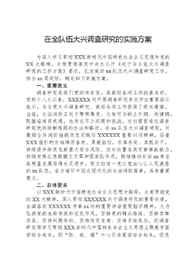 在全队伍大兴调查研究的实施方案为深入学习贯彻XXX新时代中国特色社会主义思想和党的XX大精神,全面贯彻落实中央办公厅《关于在全党大兴调查研究的工作方案》要求,扎实做好xx队伍大兴调查研究工作,结合xx局实际,制定如下实施方案。一、重要意义调查研究是我们党的传家宝,是做好各项工作的基本功。党的十八大以来,XXXXXX对开展调查研究多次作出重要指示批示,为全党大兴调查研究、做好各项工作提供了根本遵循。当前,长治消防正处于厚积薄发、大有可为的上升期、关键期,既面临难得机遇,也存在不少问题和挑战,迫切需要通过调查研究找到破解难题的办法和路径。在xx队伍大兴调查研究,对激励全体消防指战员忠实践行XXXXXX重要训词精神,沿着XXX指引的方向踔厉奋发、勇毅前行,求真务实、真抓实干,持续提升防范化解重大安全风险、应对处置各类灾害事故能力,持续发挥应急救援主力军和国家队作用,持续推动长治xx事业高质量发展取得长足进步,努力打造一支让党放心让人民满意的xx队伍,奋力谱写中国式现代化的长治消防篇章,具有重要意义。二、总体要求以XXX新时代中国特色社会主义思想为指导,全面贯彻党的XX大精神,深入贯彻XXXXXX关于调查研究的重要论述,全面落实XXXXXX考察xx时的重要讲话重要指示精神,大力弘扬党的光荣传统和优良作风,坚持党的群众路线、坚持实事求是、坚持问题导向、坚持攻坚克难、坚持系统观念,把调查研究同学习贯彻XXX新时代中国特色社会主义思想主题教育紧密结合起来,同防、救、援中心任务紧密结合起来,促进广大党员干部特别是领导干部,深刻领悟并认真掌握XXXXXX深、实、细、准、效五字诀调研方法,带头深入开展事关全局的战略性调研、破解复杂难题的对策性调研、新时代新情况的前瞻性调研、重大工作项目的跟踪性调研、典型案例的解剖式调研、推动落实的督查式调研,突出沉浸深入、突出精准靶向、突出科学有效,不断深化对党的创新理论的认识和把握,善于运用改革创新思维研究新情况、解决新问题、总结新经验、探索新规律,补短板、强弱项、扬优势、保安全、促发展,进一步健全完善与中国式现代化相适应的消防安全防范和综合应急救援体系,更好地扛起应急救援主力军和国家队的神圣使命,坚定地走好中国特色xx队伍建设新路子。三、调研内容(一)党委要着眼提升消防安全治理能力,服务保障高质量发展,重点围绕深入学习贯彻XXX新时代中国特色社会主义思想、新时代新情况下队伍发展建设、体制机制改革等事关全局的战略性问题开展调研,也可以针对具体的复杂难题开展对策研究,结合重大工作项目和典型案例进行跟踪解剖,要突出问题导向,注重解决实际问题。具体调研内容可结合实际确定。(二)支队机关各科室要立足岗位职责,聚焦条线业务和机关建设,重点围绕调研重点(内容附后),加强针对性、前瞻性调查研究,实行问题大梳理、难题大排查,着力打通贯彻执行中的堵点淤点难点,着力破解制约xx事业高质量发展的深层次体制机制障碍。涉及综合性业务的,相关科室可联合开展调研。(三)大队、站要重点围绕基层工作落实方面的堵点淤点难点问题、指战员普遍关心关注的敏感事项和重要问题,深入研究思考,真实客观反映基层心声,展示基层实践探索成果,提出符合基层实际的意见建议。要营造环境、创造条件,鼓励基层指战员讲真话、讲实话、讲心里话。四、方法步骤文可居文库——海量学习资料,手机电脑均可下载www.wenkeju.com(一)学习动员。5月15日前,各级党组织通过理论中心组学习、读书班、集体研讨、专题辅导等,组织党员、干部深入学习领会XXXXXX关于调查研究的重要论述,继承和发扬老一辈革命家深入基层调查研究的优良作风,增强做好调查研究的思想自觉、政治自觉、行动自觉。(二)制定方案。5月22日前,各级党组织要围绕调研内容,结合本地区本单位实际,广泛听取指战员意见,根据支队调查研究的具体方案,明确调研项目课题和方式方法。支队领导班子、各大队主官、站主官每人至少牵头1个重点课题带头开展调研,高质量撰写调研报告,同时针对相关领域或工作中最突出的难点问题进行专项调研。(三)开展调研。5月下旬开始,队伍各级要综合运用座谈访谈、随机走访、问卷调查、专家调查、统计分析等方式深入基层群众,掌握实情、把脉问诊,问计于群众、问计于基层。要与两代表一委员、专家学者等开展多层次、全方位、多渠道的会商调研,摸清真实情况。要根据问题逐一解剖麻雀,提出针对性措施建议,撰写调研情况分析报告。主题教育期间,党员领导干部要结合督查检查、主题党日、会议培训等,深入基层开展调研,调研时间不少于三分之一。(四)解决问题。要将解决问题贯穿调查研究全过程。对调研中发现的问题列出解决措施、责任单位、责任人、完成时限等,填写支队大兴调查研究发现问题销号单,倒排工期、挂账销号。对短期能够解决