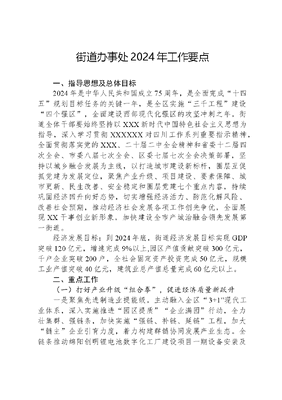 街道办事处2024年工作要点一、指导思想及总体目标2024年是中华人民共和国成立75周年,是全面完成十四五规划目标任务的关键一年,是全区实施三千工程建设四个强区,全面建设西部现代化强区的攻坚冲刺之年。街道全体干部要始终坚持以XXX新时代中国特色社会主义思想为指导,深入学习贯彻XXXXXX对四川工作系列重要指示精神,全面贯彻落实党的XXX、二十届二中全会精神和省委十二届四次全会、市委八届七次全会、区委七届七次全会决策部署,坚持以城乡融合发展为主线,以打造城市建设新标杆,圈层互促抓党建为发展定位,聚焦产业升级、项目建设、要素保障、城市更新、民生改善、安全稳定和圈层党建七个重点内容,持续巩固经济回升向好态势,切实增强经济活力、防范化解风险、改善社会预期,推动经济社会发展各项工作创先争优,全面展现XX干事创业新形象,加快建设全市产城治融合领先发展第一街道。经济发展目标:到2024年底,街道经济发展目标实现GDP突破120亿元,增速完成9%以上,园区产值贡献突破300亿元,千户企业突破200户,全社会固定资产投资完成50亿元,规模工业产值突破40亿元,建筑业总产值总量完成60亿元以上。二、重点工作(一)打好产业升级组合拳,促进经济质量新跃升一是聚焦先进制造业提能级。主动融入全区3+1现代工业体系,深入实施推进园区提质企业满园行动,全力壮集群、强链条,加快实施强链、补链、延链工程,加大链主企业引育力度,着力构建群链协同发展产业生态。全链条推动绵阳创明锂电池数字化工厂建设项目一期设备安装及验收(包括设备安装、调试)完成,实现点亮投产,爬坡满产;示润智慧显示终端智能制造总部基地项目一期爬坡满产并启动二期建设;惠科模组新增1条产线,实现爬坡满产。二是聚焦现代服务业促转型。围绕全区1+6现代服务业体系,高质量推动毅德、天泰专业市场环境升级,大力支持126等商圈全面发展,壮大美丰景泰苑、九洲江渚等城市综合体,稳住长虹佳华、科伦医贸,有效拓展市场空间。紧盯个性化、多样化、品质化需求,持续推动线上线下消费有机融合,打造特色街区、社区文化圈,沉浸式体验、主题活动等消费新模式,全力拉动消费促进辖区经济有效增长。三是聚焦平台类经济深挖潜。加快推进中南高科·涪城智能电子产业园项目一批次厂房招引满园31家(含已招引20家),二、三批次厂房完成主体建设。持续推动新媒体产业园、126文创产业园等服务业集聚区企业迭代、业态升级、商圈共建、平台共享。优化推动九洲江渚新商圈建设,谋划产业业态,实现集聚发展。加大市场主体培育,辅导企业升规入统,全年力争实现新增四上企业20家以上。四是聚焦五经普提质固基础。加大经普提质增效,高质量开展全国第五次经济普查,建立2+6+5+N联系企业工作机制,分类突出各自特点和关键,按照55家行政事业单位、4754家企业、77户协会团体、390户产活单位,高效推动街道5276家法产单位完成登记工作。牢牢抓住毅德2142家和天泰475家重点单位,全面提升数据质量和普查实效,最大化争取企业理解、企业认可、企业支持,确保应统尽统、颗粒归仓,全力推动街道五经普工作做出更大均值和总量贡献。(二)突出项目建设主攻点,增强区域发展新动能一是以更大力度加速项目建设。狠抓手续快办、要素必保政策直达、节点贯通,专班包保推进、专人全程服务,全力配合涪创公司完成绵阳市六一学校新建项目建设工作,完成科技城临港经济发展区医疗基础设施项目建设60%工作;配合绵投文可居文库——海量学习资料,手机电脑均可下载www.wenkeju.com集团完成创业大道南延线工程项目拆迁和建设50%工作;配合富诚集团完成古井家园建设30%工作,完成范家御飞路15米宽,600米长道路修建。二是以更大力度抓实招商引资。强化精准招商、专业招商平台招商,围绕新型显示、新能源等重点产业,配合区级部门加快构建富有竞争力的现代化产业体系。依托中南高科、新媒体产业园、126和燕景堂等园区载体精准绘制产业全景图,盘活用好既有资源,腾笼换鸟增容扩质,强化载体平台集聚势能,力争全年招引高质量企业10家以上。打造专业化招商队伍,以服务企业专员为主,常态开展专题业务培训,努力营造人人挖掘资源、合力招商引资良好氛围。三是以更大力度推进改革创新。坚持以改革增动力、开放添活力、载体强引力,持续深化镇街抓经济激励试点,聚焦一镇街一特色发展定位,沿链发展XX配套产业。坚持创新服务重点项目,在政务服务、社会事务、行政审批、空间规划、要素供给等方面全方位支持、百分百保障,力争在建项目早投产早达效。强化对上争取,抓住有利机遇,全面梳理区域空间规划、闲置土地、已报征土地现状,密切跟进城中村、园区开发、城市旧改、海绵城市等政策支持,想方设法争取更多资金和项目扶持。(三)当好