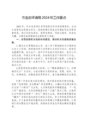 市生态环境局2024年工作要点2024年,机关党委将认真贯彻落实好市委部署要求,坚决扛起管党治党政治责任,坚持党建引领生态环境各项业务高质量发展,通过系统化谋划、星级化建设、项目化推进、信息化支撑,为建设美丽暖城作出新的更大贡献。一、全面加强机关党的各项建设,推动机关党建高质量发展。 1.强化机关思想政治工作。深入学习贯彻新时代中国特色社会主义思想,持续推动学习成果转化为实际行动力。统筹优化营商环境、安全生产、筑牢中华民族共同体意识、党务公开、法纪法规、环保业务等方面,系统规划党员干部的学习计划,充分利用党组理论中心组学习、青年理论学习组等,以科室为单元组织安排一周一次集中学习,把学习成果用于指导实践,推动工作。 2.坚持党的政治建设为统领,以锻造最强执行力,创建模范机关为目标,全面加强机关党的政治、思想、组织、作风、纪律建设,把制度建设贯穿其中,着力推进模范机关建设。 3.进一步深化党内组织建设,提升基层党组织建设质量。坚持党建领航 生态暖城的党建理念,以融合式党建为抓手,以支部六联动为主线,大力推进组织共建强堡垒、一线工作强担当、示范创建强服务的三强聚力工程,以推进生态环境系统党建一体化建设为主线,积极创建坚强堡垒模范支部标准化规范化建设为目标,努力夯实基层党组织基础,扩大基层党组织整体效应和党建工作覆盖和影响,以党建引领加强生态环境治理,助推高品质生态环境支撑高质量发展。 4.全心全意为民办实事。结合双报到双服务双融入和乡村振兴工作,常态化开展感党恩、听党话、跟党走群众教育实践活动,教育引导生态环境系统党员干部群众增强维人民至上服务意识,建设服务型机关。 5.加强党员队伍建设,持续提升党员素质,结合红色研学,组织党员干部开展走出去实践性集中培训,开展党员培训计划。 6.坚持党建带团建群建,与妇联、工会等群团组织联合开展志愿服务等共建活动。巩固青年主题教育成果,发挥青年力量。 二、严格贯彻落实全面从严治党要求,一体推进三不腐。 7.强化思想教育,开展廉政教育,常态化开展警示教育。深化廉洁文化建设,以廉洁文化促进自律,着力构建廉洁型模范机关。严格监督执纪问责。巩固教育整顿成果,全市生态环境系统开展常态化明察暗访和监督检查。加强制度机制建设。紧盯督察执法、环评审批、危废管理、选人用人、资金项目和政府采购等廉政风险点和监督薄弱点,加强重点领域监督督查,规范权力运行。持续优化机关各科室、二级单位重点岗位廉政风险点,推动廉政监督全覆盖。 三、强化意识形态工作管理。 8.以铸牢中华民族共同体意识为主线,加强教育宣传,持续开展民族团结进机关,互融互促双提升活动,把民族团结进步创建有效融入模范机关创建,作为全年党建工作任务的重点内容,贯穿党建工作全过程。 9.加强舆情研判工作,针对网络意识形态工作的新情况、新问题,研究和改进方式方法,提高意识形态把控能力和网络舆论引导能力建设。文可居文库——海量学习资料,手机电脑均可下载www.wenkeju.com