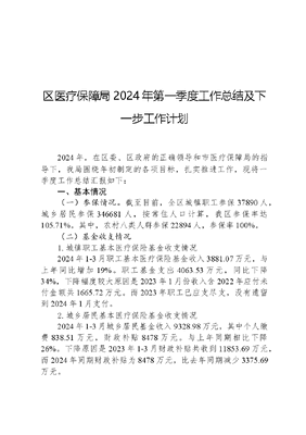 区医疗保障局2024年第一季度工作总结及下一步工作计划2024年,在区委、区政府的正确领导和市医疗保障局的指导下,我局围绕年初制定的各项目标,扎实推进工作,现将一季度工作总结汇报如下:一、基本情况(一)参保情况。截至目前,全区城镇职工参保37890人,城乡居民参保346681人,按常住人口计算,我区参保率达105.71%。其中,农村八类人群参保22894人,参保率100%。(二)基金收支情况1.城镇职工基本医疗保险基金收支情况2024年1-3月职工基本医疗保险基金收入3881.07万元,与上年同比增加19%。职工基金支出4063.53万元,同比下降34%,下降幅度较大原因是2023年1月份收入含2022年应付未付金额共1665.72万元。而2023年职工已应支尽支,没有遗留到2024年1月支付。2.城乡居民基本医疗保险基金收支情况2024年1-3月城乡居民基金收入9328.98万元,其中个人缴费838.51万元,财政补贴8478万元。与上年同期相比下降26%。下降原因是2023年1-3月财政补贴共收到11853.69万元,而2024年同期财政补贴为8478万元,比去年同期减少3375.69万元。2024年1-3月基金支出16385.51万元,与上年同期相比增加37%,增幅较大原因:一是因为2023年同期支出含2022年应付未付3442.95万元,而2024年同期支出含2023年应付未付5825.46万元,比上年多支付2382.51万元上年遗留费用;二是2023年一季度异地就医费用一共4408.46万元,而2024年同期异地就医费用一共5115.71万元,比上年增加707.25万元。(三)药品集中带量采购情况全面落实了八批次国家组织、江西两批次、十八省联盟中成药、十四省联盟药品等多批次药品集中带量采购,截至目前已采购中选药品品种达419余个,占集采总品种的74.8%;截至24年2月份中选药品采购金额为845万,占总采购金额(中药饮片外)的30%。(四)基金监管方面截至2024年3月底,对全区医保定点医药机构进行检查,追回医保基金179.94万元(公立定点医疗机构16.48万元、非公立定点医疗机构160.49万元、定点药店2.73万元、个人0.24万元)。二、工作做法及成效(一)经办服务方面一是常态化做好参保人员的门诊统筹医保定点、异地就医特殊药品使用、慢性病办理备案登记等工作;二是核查医保基金审计疑似数据;三是按照区政府关于做好国有企业改制时距离法定退休5年以上人员补缴医疗保险费用享受职工医保待遇的相关工作,截至3月31日共有300人办理补缴手续,补缴总金额1215.26万元,补缴人员已享受职工医保待遇。(二)扩面征缴方面全力做好2024年城乡居民基本医疗保险费征缴收尾工作,按照前期动员部署会要求,压实责任,主动作为,履职尽责。一是进一步加大宣传力度。联合财政、税务、教体等部门撒网式宣传,依托XX发布公众号、公交站台等载体加强医保文可居文库——海量学习资料,手机电脑均可下载www.wenkeju.com公益广告宣传。同时,以赶集日为契机,联合乡政府在乡镇集市进行面对面宣传。截至目前,发放参保宣传单4万余份,发放《致学生家长的一封信》7万余份,发放《致困难人员参保一封信》1.2万份。二是进一步加大监督检查力度,每周统计各乡镇(场)和金峰街道城乡居民参保缴费进度,实行一周一反馈、一月一调度,有力推进医保征缴工作走深走实。(三)网络安全方面严守网络安全工作规章,根据《XX区网络安全管理制度》,严格落实专机专网制度,凡连接医保专网的电脑,一律通过物理隔离的方式严禁接入外网,严禁医保终端电脑内、外网混用;严禁在医保专网内接入其他系统;进一步做好安全生产排查工作,全面排查医保业务电脑是否存在内外网混用情况。(四)政策宣传方面开展医保政策进万家、为民服务我最优活动,组织业务骨干进社区、进企业、进乡村,坚持以人民健康为中心,把提升人民群众对医保政策的知晓率、享受经办服务的便捷度、对医保工作的获得感作为工作出发点和落脚点,突出目标导向和结果导向,以实际行动解民忧、纾民困、暖民心,不断优服务、强管理、抓宣传,打通政策中的盲点、经办中的堵点、服务中的冷点,有效解决阻碍人民群众享受医保的各类问题,增加人民群众对医保工作的满意度,持续增强人民群众获得感、幸福感、安全感。(五)抚惠保工作推进方面制定了《XX区抚惠保宣传推动实施方案》,召开全区普惠型商业补充保险抚惠保宣传推动会,各乡镇、各部门、各单位不畏艰难,勇于创新,不断增强抚惠保宣传和推动工作的紧迫感和责任感,截至3月底,区抚惠保参保排名除市本级外,列县区第一。三、下一步工作打算下一步,在做好各项医保经办服务的基础上,重点做好以文可居文库——海