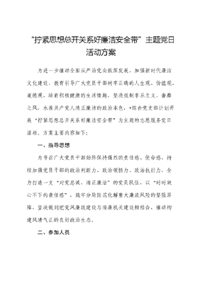 拧紧思想总开关系好廉洁安全带主题党日活动方案为进一步推动全面从严治党向纵深发展、加强新时代廉洁文化建设,教育引导广大党员干部树牢正确的人生观、价值观、道德观,培育积极健康的生活情趣,坚决抵制享乐主义、奢靡之风,永葆共产党人清正廉洁的政治本色,*综合党支部计划开展拧紧思想总开关系好廉洁安全带为主题的志愿服务党日活动。方案主要内容如下:一、指导思想为号召广大党员干部始终保持强烈的责任感、使命感,持续加强党员干部的政治判断力、政治领悟力、政治执行力,全力打造一支对党忠诚、清正廉洁的党员队伍,以时时放心不下的责任感,筑牢分局防范化解重大廉政风险的坚强屏障,坚决做到把党风廉政建设与清廉机关建设相结合,推动构建风清气正的良好政治生态。二、参加人员全体党员、预备党员、入党积极分子以及部门负责人,局领导以普通党员身份参加。三、活动时间*月15日-*月18日四、活动内容(一)组织参观*廉洁文化作品展。本次展览作品包含征文、微电影、微视频、创意设计、书画摄影作品共计50余件。展览将艺术创作和廉洁教育融合在一起,让每一位党员深刻体会到遵纪守法、廉洁自律的重要性和必要性,更加坚定理想信念,恪守道德底线。党员们在一幅幅苍劲有力的书法作品里感悟格言警句的力量,在一张张意蕴深远的绘画作品中品味廉洁文化的魅力。(二)诵读红色家书,涵养清正廉洁朗诵活动。党员代表朗诵《廉洁家书》,一幕幕逼真感人活灵活现的故事情景,一句句饱含深情铿锵有力的倾诉告白,生动还原红色家书蕴含的丰富内涵和精神力量,引导广大党员干部重温革命先辈、先进模范艰苦奋斗、献身革命的高尚情怀,激励传承革命精神,文可居文库——海量学习资料,手机电脑均可下载www.wenkeju.com涵养清廉检风,踔厉奋发、勇毅前行,以昂扬姿态奋力开*高质量发展新征程。(三)政治体检活动。组织党员干部填写《政治体检单》,标榜样,围绕思想建设、政治建设、组织建设、作风建设等4个方面开展自我检视,及时发现问题,纠治偏差,做到边查边改、立查立改。在思想得到升华,精神受到洗礼的同时,自觉强化廉洁自律意识,带头树立良好家风,做家风、检风建设的表率。五、活动要求(一)明确责任,加强组织领导。办公室负责统筹协调,各支部要积极主动配合,领导干部和青年职工等重点人群要先学一步,学深一层,积极营造风清气正良好从业氛围;各支部要提高政治站位,以此次党日活动为契机,切实将廉洁学习融入日常、融入经常。(二)加强宣传,营造浓厚氛围。始终坚持舆论导向,准确把握宣传主题,各支部开展活动时要采取多种宣传方式,力文可居文库——海量学习资料,手机电脑均可下载www.wenkeju.com求在学习宣传贯彻中形成合力、统一思想,营造强大声势和浓厚氛围。(三)结合实际,科学统筹推进。各支部要按照此次活动内容合理安排时间和活动场所,严格遵守各项规定,结合实际,由办公室统筹会议、活动和学习场所时间安排,保证分层级、分项目、分阶段开展党日活动。文可居文库——海量学习资料,手机电脑均可下载www.wenkeju.com