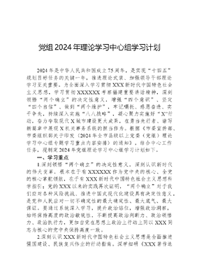 党组2024年理论学习中心组学习计划2024年是中华人民共和国成立75周年,是实现十四五规划目标任务的关键一年,推进理论武装、加强领导干部理论学习至关重要。为全面深入学习贯彻XXX新时代中国特色社会主义思想,学习贯彻XXXXXX考察福建重要讲话精神,深刻领悟两个确立的决定性意义,增强四个意识、坚定四个自信、做到两个维护,牢记嘱托、感恩奋进、实干争先,持续深入实施八八战略,凝心聚力实施好X行动,奋力夺取现代X城市建设更大成果,在勇当先行者、谱写新篇章中展现X机关事务系统的担当作为。根据《市委宣传部、市委组织部关于印发〈2024年全市县级以上党委(党组)理论学习中心组专题学习重点内容安排〉的通知》,结合中心工作任务,现制定2024年党组理论学习中心组学习计划如下。一、学习重点1.深刻领悟两个确立的决定性意义。深刻认识新时代的伟大变革,根本在于有XXXXXX作为党中央的核心、全党的核心掌舵领航,在于有XXX新时代中国特色社会主义思想科学指引;党的XXX以来的实践再次证明,两个确立对于我们应对各种风险挑战、推进中国式现代化建设具有决定性意义,是党和人民应对一切不确定性的最大确定性、最大底气、最大保证。要通过系统深入学习,提升政治站位,增强政治洞察,始终保持高度的政治敏锐性,不断提高政治判断力、政治领悟力、政治执行力,更加自觉在思想上政治上行动上同以XXX同志为核心的党中央保持高度一致。2.深刻认识XXX新时代中国特色社会主义思想是全面推进强国建设、民族复兴伟业的行动指南。深学细研《XXX著作选读》等原著原文,突出体系化学理化导向,全面系统掌握XXX新时代中国特色社会主义思想的科学体系、丰富内涵、时间要求,做到整体把握、融会贯通、知行合一,不断把学习成效转化为推进中国式现代化的强大动力。深刻认识XXX新时代中国特色社会主义思想的世界观、方法论和贯穿其中的立场观点方法,为我们更好驾驭复杂局面、应对风险挑战,增强工作的原则性、系统性、预见性、创造性提供了强大的思想武器,必须不断在改进领导方法、思想方法、工作方法上下功夫,提高履职尽责的能力和水平。要结合巩固拓展主题教育成果,把学习贯彻不断向各领域各方面深化,深入学习领会XXX经济思想、XXX法治思想、XXX文化思想、XXX生态文明思想、XXX强军思想、XXX外交思想和XXXXXX关于党和国家各项工作的一系列重要思想和重要论述,更加自觉地用党的创新理论武装头脑、指导实践、推动工作。3.深刻理解两个结合是我们取得成功的最大法宝。深刻认识中国特色社会主义道路是在马克思主义指导下走出来的,也是从五千多年中华文明史中走出来的,中国特色的关键就在于两个结合,只有坚持两个结合,才能始终保持马克思主义的蓬勃生机和旺盛活力,才能推动中华文明实现从传统到现代的跨域。深刻认识第二个结合巩固了我们的文化主体性,是我们党对马克思主义中国化时代化历史经验的深刻总结,是对中华文明发展规律的深刻把握,是又一次的思想解放,让我们能够在更广阔的文化空间中,充分运用中华优秀传统文化的宝贵资源,探索面向未来的理论和制度创新。要深刻把握两个结合的实践要求,坚守好马克思主义这个魂脉和中华优秀传统文化这个根脉,坚定文化自信、秉持开放包容、坚持守正创新,有效把马克思主义思想精髓同中华优秀传统文化精华贯通起来,继续推进实践基础上的理论创新,不断谱写马克思主义中国化时代化新篇章。4.深刻把握XXX文化思想的基本精神、基本内容、基本要文可居文库——海量学习资料,手机电脑均可下载www.wenkeju.com求。深刻认识XXX文化思想是新时代党领导文化建设实践经验的理论总结,是坚持两个结合、推进马克思主义文化理论创新的重大成果,构成了XXX新时代中国特色社会主义思想的文化篇,表明我们党的历史自信、文化自信达到了新高度,为在新的起点上继续推动文化繁荣、建设文化强国、建设中华民族现代文明提供了强大思想武器和科学行动指南。深刻认识XXX文化思想既有文化理论观点上的创新和突破,又有文化工作布局上的部署要求,明体达用,体用贯通,构成了一个科学系统的思想体系,必须从整体上学习领会好、贯彻落实好,既运用这一思想中的重大创新观点来把握文化发展规律,又结合实际把这一思想提出的各项战略部署落到实处。要坚持以XXX文化思想为指引,更好担负起新的文化使命,深入推进党的理论武装,发展壮大主流价值、主流舆论、主流文化,不断巩固全党全国各族人民团结奋斗的共同思想基础,不断满足人民日益增长的精神文化需求,不断提升国家文化软实力和中华文化影响力。要牢牢掌握意识形态工作领导权,严格落实意识形态工作责任制,筑牢意识形态安全防线,巩固意识形态领域向上向好的良好态势。5.深入学习领会XXXXXX关于推进中国式现代化的