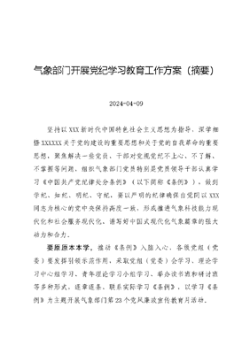 气象部门开展党纪学习教育工作方案(摘要)2024-04-09坚持以XXX新时代中国特色社会主义思想为指导,深学细悟XXXXXX关于党的建设的重要思想和关于党的自我革命的重要思想,聚焦解决一些党员、干部对党规党纪不上心、不了解、不掌握等问题,组织气象部门党员特别是党员领导干部认真学习《中国共产党纪律处分条例》(以下简称《条例》),做到学纪、知纪、明纪、守纪,要以严明的纪律确保自觉同以XXX同志为核心的党中央保持高度一致,形成推进气象科技能力现代化和社会服务现代化、谱写好中国式现代化气象篇章的强大动力和合力。要原原本本学,推动《条例》入脑入心,各级党组(党委)要发挥引领示范作用,采取党组(党委)会学习、理论学习中心组学习、青年理论学习小组学习、举办读书班和研讨班等多种形式,逐章逐条、联系实际学习《条例》,以学习《条例》为主题开展气象部门第23个党风廉政宣传教育月活动。要加强警示教育,让党员、干部受警醒、明底线、知敬畏,抓好以案促学,深化以案说德、以案说纪、以案说法、以案说责。要加强解读和培训,深化《条例》理解运用,引导党员干部准确掌握《条例》主旨要义和规定要求。要加强对照检查和整改落实,2024年度处级以上领导班子民主生活会和基层党组织组织生活会要把学习贯彻《条例》情况作为对照检查的重要内容,党员特别是党员领导干部要把自己摆进去、把职责摆进去、把工作摆进去,实事求是查摆自身不足,深入进行自我剖析,认真开展批评和自我批评,切实抓好整改落实。要加强组织领导,气象部门党纪学习教育在中国气象局党组领导下进行,各级党组(党委)要把开展党纪学习教育作为重要政治任务,精心组织实施,党员领导干部要带头学习、作出表率,特别是各级党组织书记、纪检组组长(纪委书记)、纪检委员要先学一步、学深一层,基层党委要对所辖党支部进行全覆盖、全过程指导。要加强宣传引导,深入学习宣传党中央关于党纪学习教育的部署要求,积极宣传气象部门党纪学习教育的特色做法,各级党组(党委)要及时总结党纪学习教育的经验、进展和成效,引导党员干部自觉主动学。要务求实效,坚持两手抓、两促进,力戒形式主义,各级党组(党委)要把文可居文库——海量学习资料,手机电脑均可下载www.wenkeju.com开展党纪学习教育同抓好汛期气象服务、推进年度重点工作结合起来,以党纪学习教育成效促进气象高质量发展。文可居文库——海量学习资料,手机电脑均可下载www.wenkeju.com