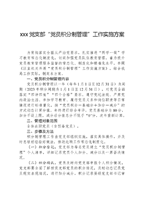 xxx党支部党员积分制管理工作实施方案为贯彻落实全面从严治党要求,扎实推进两学一做学习教育常态化制度化,切实加强党员队伍教育管理,着力提升党员教育管理服务监督的常态化、制度化和精准化水平。参照《区直机关开展党员积分制管理工作实施方案》,结合我局工作实际,制定本方案。一、党员积分制管理内容党员积分制管理以一年(每年1月1日至12月31日)为周期(2023年积分周期为1月1日至12月31日),对党员全面落实四讲四有四个合格要求,遵守党纪法规、严肃党内政治生活、参加学习教育、履行党员义务和岗位职责等日常情况进行标准量化,按党员积分=基础分+加分-减分的方式动态计算分值,年终进行综合考评。党员基础分为80分,加分不设上限,减分后分值总分不低于0分,次年重新计算。二、管理对象范围全体在职党员(含预备党员)。三、步骤及方法积分制管理工作由党支部组织实施,落实具体操作,并及时总结好经验好做法,推动此项工作常态化制度化。(一)积分登记。党支部为每名党员建立党员积分制管理个人清单,详细记录党员个人加分、减分以及一票否决情况。(二)积分确认。党员及时向党支部申报个人积分情况,党支部要全面了解核实支部党员的积分情况,及时动态记录党员现实表现情况,进行加分减分。积分记录要经党支部书记审核和党员签字确认。(三)积分公示。党支部每季度将党员积分制管理个人清单、工作台账在一定范围内公示3个工作日,接受党员干部监督。每年年底要对党员全年积分在一定范围内进行公示。党支部对党员季度积分和年度积分情况均应在支部党员大会上通报。(四)积分申诉。党员对积分情况有异议的,可向党支部提出申诉,党支部应在3个工作日内作出答复。(五)教育整改。党支部对积分出现减分项目的党员,要及时谈心谈话、教育整改。(六)结果运用。强化结果运用,将积分情况作为党员民主评议、评先评优、绩效奖惩、提拔使用等的重要依据,并与党员所在部门评先评优、奖励惩处挂钩。1.年度民主评议党员时,80分(含80分)以上且排名靠前的,可评为优秀等次;年积分在80(含80分)以上未评为优秀的,应评为合格;年积分在79分—70分(含70分)的,应评为基本合格;年积分在70分以下的,应评为不合格。2.预备党员年积分低于80分的,不得按期转为正式党员,并根据实际情况延长预备期或取消预备党员资格3.对积分排名靠前的党员,应优先作为评先评优的推荐对象,并在干部选拔、学习培训、目标考核等方面给予激励关怀。4.对积分排名靠后的党员,取消评先评优资格,由党支部书记对其进行诚勉谈话,重点帮教,督促其限期整改提高。5.对被评定为不合格党员的,党支部要立足教育帮助,促进转化提高。如教育帮助仍未转化提高的,按照党章和党内有关规定进行处理。四、工作要求(一)加强组织领导。党员积分制管理工作由党支部负责组织实施,党支部书记是积分制管理工作的第一责任人和直接责任人。要切实履行职责,严格按照规定程序和要求抓好组织文可居文库——海量学习资料,手机电脑均可下载www.wenkeju.com实施和监督管理。党员领导干部要带头参加积分管理,确保积分制管理工作顺利推进。(二)强化宣传教育。党支部要高度重视,加强宣传,教育引导党员自觉践行四讲四有要求,立足岗位做到政治合格、执行纪律合格、品德合格、发挥作用格争当坚定信念好、学习提能好、崇德守规好、服务群众好、工作业绩好五好党员,工作、学习和生活中起示范引领作用。(三)严格督导检查。党支部每年至少开展1次全覆盖专项督查,认真查阅党员积分基础资料,走访了解党员意见建议,及时发现问题、研究对策措施,推动工作稳步开展。(四)注重统筹兼顾。要把党员积分制管理与完成单位目标任务结合起来,与干部年度考核结合起来,与党员教育管理监督服务结合起来,与争创六好基层党组织和争当五好党员活动结合起来,充分利用现代信息手段,不断探索发挥党员积分制管理的方法途径,提升时效性和精准性,努力提高党员管理科学化水平。文可居文库——海量学习资料,手机电脑均可下载www.wenkeju.com