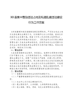 XX县集中整治违法占地及私搭乱建违法建设行为工作方案为有效整顿和规范城镇规划建设管理秩序,严厉打击违法占地及私搭乱建违法建设行为,切实维护社会公共利益,营造良好的经济社会发展环境,根据《中华人民共和国土地管理法》、《中华人民共和国城乡规划法》、《陕西省开山采石削山建房管理办法》及有关法律法规规定,县政府决定对全县范围内各类违法占地及私搭乱建违法建设行为进行集中整治,现结合我县实际,制定本工作方案:一、整治目标凡在我县城镇规划区域内,未经国土、住建和水利等相关管部门许可擅自占地、占河道建设的行为,均属违法占地及私搭乱建违法建设行为。按照发现苗头严格管、在建工程立即停、影响恶劣坚决拆的要求,建立健全查处违法占地及私搭乱建违法建设长效管理机制,依法查处各类违法建设案件,有效遏制违法占地及私搭乱建违法建设行为,规范土地使用秩序,不断优化城乡发展环境,为建设美丽富裕新XX奠定坚实基础。二、整治范围(一)城镇规划区内的违法违规用地建设行为。(二)严重影响城镇规划和不符合土地利用总体规划的违法工程。(三)违法开山采石削山建房的行为。(四)侵占国有资产、公共道路、公共场所的违法建筑。(五)侵占道路、管线、河道、违反水保管理的违法建筑。(六)县城、镇村主干道、巷道两侧的违法建筑。(七)违反规划,擅自改建、加建、扩建的违法建筑。(八)各住宅小区、居民楼、私人住宅楼内及附近的违法建筑。(九)其他严重影响居民生产生活的违法建筑。三、责任单位及职责分工各镇政府:负责各自辖区范围内的违法占地及私搭乱建违法建设的查处,重点是对城乡结合部、重要节点、主要出入口、居民小区范围内的行为进行查处。同时要摸清具体数量、面积等,归集分类、建立台账,为整治工作提供基础数据。妥善处理专项整治工作期间群众的来访、接访工作。县综合执法办:负责专项整治工作的日常事务,执行领导小组的工作部署,抓好综合协调,掌握工作动态,检查督促推进工作。对县城规划区范围内的违法占地及私搭乱建违法建设情况进行详细调查,摸清具体数量、面积等,归集分类、建立台账,为整治工作各责任单位提供基础数据。组织公安、住建、国土、水利等部门对未依法办理规划许可证和未按照规划许可证的规定进行建设、擅自施工的违法占地、占河道、私搭乱建违法建设及造成水土流失的主体进行查处。县国土局:负责依据土地管理法规及《陕西省开山采石削山建房管理办法》等法律法规,对非法转让土地、非法占地、破坏耕地等违法占地行为进行查处。县住建局:负责对未取得建设工程规划许可证或者未按照建设规划许可证的规定进行建设的,未经批准进行临时建设的,未按照批准内容进行临时建设的,临时建筑物、构筑物超过批准期限不拆除的行为的查处。县文旅广电局:负责综合整治工作的宣传报道工作,及时曝光典型案件,营造良好整治氛围。县林业局:负责对侵占或毁坏林地的私搭乱建违法建设行为的查处。文可居文库——海量学习资料,手机电脑均可下载www.wenkeju.com县交通局:负责对公路沿线的私搭乱建违法建设行为的查处。县司法局:负责对违法占地及私搭乱建违法建设主体的法律引导及纠纷的调解工作。县监察局:负责对党员干部及公职人员参与违法占地及私搭乱建违法建设行为的查处。县公安局:负责依法处置集中整治工作中出现的阻扰执行公务等危害社会治安秩序的行为。县信访局:负责对集中整治工作社会稳定风险评估,妥善处理专项整治工作期间群众的来访、接访工作。县气象局:对违法建筑不得办理防雷设施审核。县电力局:对私搭乱建违法建设及违法建筑不予供电。县水利局(供水公司):对私搭乱建违法建设及违法建筑不予供水。县环保局、安监局、文旅广电局、卫生局、工商局、质监局、食品药品监督管理局、农业局、林业局、国税局、地税局等部门,对违法建设的建筑物、构筑物以及其他设施投入经营使用的,或者擅自改变建筑物、构筑物以及其他设施使用功能的,依法不予核发相关许可证照。四、方法步骤集中整治工作采取集中部署、联合执行的方式进行,自2015年8月17日开始至11月底结束。(一)宣传动员阶段(8月17日—8月21日)。各部门要充分发挥职能优势,采取各种行之有效的宣传方式,广泛深入开展宣传。一是在县有线电视台、县政府门户网站、美丽XX微信平台及镇村组重要地段、街道社区宣传栏发布或张贴专项整治通告。二是通过电视、网络等新闻媒体及采取悬挂宣传横幅、发放宣传材料、出动宣传车等形式对整治活动及相关法律法规进行宣传,努力做到家喻户晓,为整治活动营造良好的氛围。与此同时,面向社会公开8828606、8828001投诉热线,积极引导社会各界支持和参与整治活动。文可居文库——海量学习资料,手机电脑均可下载www.wenkeju.com(二)自行整改阶段(8月22日—9月20日)。组织相关人员上门对违法占地及私搭乱建违法建设主体