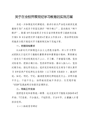 关于在全校开展党纪学习教育的实施方案为进一步加强党的纪律建设、推动全面从严治党向纵深发展教育引导广大党员干部坚定拥护两个确立、坚决做到两个维护,根据《中共D省委关于在全省开展党纪学习教育的实施方案》和《全省党纪学习教育4月重点工作提示》,结合学校实际现就在全校开展党纪学习教育制定如下实施方案。一、把握目标要求以A新时代中国特色社会主义思想为指导,深入学习贯彻AXXX关于党纪学习教育的重要讲话和重要指示精神,聚焦解决一些党员干部对党规党纪不上心、不了解、不掌握等问题,坚持对标看齐、把准正确方向,坚持深学细悟、推动入脑入心,坚持问题导向、强化学改结合,组织党员特别是党员领导干部认真学习《中国共产党纪律处分条例》(以下简称《条例》),做到学纪、知纪、明纪,守纪,搞清楚党的纪律规矩是什么,弄明白能干什么、不能干什么,始终做到忠诚干净担当,为实现学校1329发展战略目标提供坚强保证。二、明确工作安排按照党中央和省委统一部署,这次党纪学习教育从2024年4月开始、7月结束,不分批次、不划阶段、不分环节,注重融入日常抓在经常。(一)抓深学习研讨1.坚持个人自学与集中学习相结合,逐章逐条学、联系实际学,教育引导党员干部准确掌握《条例》主旨要义和规定要求。学校党委和各二级党组织至少开展1次理论学习中心组学习,学校党委举办不少于3天的学校党委领导班子读书班,各二级党组织举办为期3天的处级班子读书班,在个人自学、专题辅导的基础上,紧扣党的政治纪律、组织纪律、廉洁纪律、群众纪律、工作纪律生活纪律进行研讨,交流学习体会,提出改进举措。责任单位:党委宣传部、纪委办公室、党政办公室、各二级党组织(排序第一为牵头单位,下同)2.党支部三会一课、主题党日以学习《条例》为主题,采取交流研讨、宣讲阐释、案例教学、线上培训等方式,组织全体党员认真学习。责任单位:党委组织部、纪委办公室、各二级党组织、师生党支部3.七一前后,各二级党组织书记、师生党支部书记结合学习和工作实际讲1次纪律党课,用通俗易懂的语言、具体生动的案例,讲认识、谈体会、提措施。责任单位:党委组织部、各二级党组织、师生党支部4.引导党员紧密联系岗位职责和工作要求开展党纪学习教育加强分类指导,有针对性抓好外出毕业生党员、离退休党员等群体党纪学习教育。文可居文库——海量学习资料,手机电脑均可下载www.wenkeju.com责任单位:党委组织部、党委教师工作部、党委学生工作部离退休党总支、各二级党组织(二)抓严警示教育5.面向全校党员领导干部组织一次警示教育活动,开展以案说德、以案说纪、以案说法、以案说责,教育引导党员领导干部受警醒、明底线、知敬畏。责任单位:纪委办公室、各二级纪委6.结合实际挖掘警示教育资源,因地制宜组织开展三个一活动.(1)校院两级纪委聚焦师德师风、师生群众身边微腐败等相关领域,编印一系列违纪违法党员干部警示录、忏悔录。(2)各二级党组织、师生党支部就近参观一次沙湾郭沫若(故居)纪念馆、马边党史学习教育基地、犍为县李拔馆等法纪教育(廉洁文化)基地阵地。(3)各二级党组织、师生党支部组织全体党员观看一部现有警示教育片(从《贪欲之祸》《被网住的青春》《蝇贪之鉴》等乐山现有警示教育片中选取),深刻剖析违纪典型案例注重用身边事教育身边人,强化警示震慑效果,推动以案促改促治。责任单位:纪委办公室、各二级纪委文可居文库——海量学习资料,手机电脑均可下载www.wenkeju.com7.召开正风肃纪联席会,突出抓好对权力集中、资金密集、资源富集领域和关键岗位党员干部的警示教育,引导举一反三、引以为戒。责任单位:纪委办公室、巡察工作办公室、党委组织部、党政办公室、党委宣传部、审计处、计财处(三)抓实培训解读8.学校党校在新任处级干部薪火相传培训班、清华大学-乐山师范学院党员干部履职能力培训班纪检监察干部业务能力培训班中,安排学习新修订的《中国共产党纪律处分条例》专题,突出抓好新提拔干部、年轻干部、关键岗位干部等重点对象的纪律培训,并作为党政领导干部政治理论水平考试测试重要内容。责任单位:党委组织部、纪委办公室。9.用好廉洁D嘉廉话乐师廉享等媒体传播平台,及时组织学习中央、省委媒体及共产党员网、中国干部网络学院等平台的解读文章和网络课程,帮助党员干部准确把握《条例》精神实质。责任单位:党委宣传部、纪委办公室、各二级党组织10.运用党课开讲啦、青年党员说、微党课等载体,通过案例教学、视频讲座、情景课堂等方式,增强党纪学习教育的感染力和吸引力。责任单位:党委组织部(党校)、各二级党组织文可居文库——海量学习资料,手机电脑均可下载www.wenkeju.com11.各级党组织和广大党员干部要自觉对照《条例》