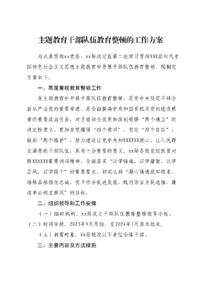 主题教育干部队伍教育整顿的工作方案为认真贯彻xx党委,xx局决定在第二批学习贯彻XXX新时代中国特色社会主义思想主题教育中开展干部队伍教育整顿,现制定方案如下。一、高度重视教育整顿工作在主题教育中开展干部队伍教育整顿,是党中央坚定不移全面从严治党的重要举措,是全面提高中央和国家机关党的建设质量的重要政治任务,对于推动全党更加深刻领悟两个确立的决定性意义,更加自觉增强四个意识、坚定四个自信、做到两个维护,努力建设让党中央和XXXXXX放心、让人民群众满意的干部队伍,具有十分重要的意义。xx局各级党组织要对照XXXXXX重要训词精神,全面落实以学铸魂、以学增智、以学正风、以学促干的重要要求,切实达到凝心铸魂筑牢根本、锤炼品格强化忠诚、实干担当促进发展、践行宗旨为民造福、廉洁奉公树立新风的目标。二、组织领导和工作安排(一)组织机构。xx局成立干部队伍教育整顿领导小组,(二)时间安排。2023年9月开始,至2024年1月基本结束。(三)教育对象。xx局级及以下单位全体干部。三、主要内容及方法措施(一)理论学习。在落实好主题教育规定动作的基础上,有针对性地开展全面从严治党、推进党的自我革命、党规党纪等方面的专题学习。重点抓好四个一:组织集中学习。xx局党委班子采取中心组学习方式开展1次集体学习,xx局机关各党组织结合三会一课、主题党日等至少开展1次集中学习。各级干部要通过集体交流研学和个人原原本本自学的方式,侧重跟进学习好全面从严治党、推进党的自我革命、党规党纪等主要学习内容。讲好主题党课。党组织主要负责同志在讲专题党课时,把全面从严治党、强化自我革命、严肃党规党纪等内容作为重要内容。组织革命传统教育。用活用好驻地红色资源,广泛开展讲红色故事、唱红色歌曲、看红色电影活动,大力学习宣传部系统先进模范、消防忠诚卫士等先进典型。开展警示提醒。注重运用中央和国家机关近年来查处的突出问题和典型案例,采取组织观看警示教育片、参观廉政教育基地、以案说法等方式,教育引导党员干部知敬畏、存戒惧、守底线。(二)调查研究。重点对消防救援队伍党的建设工作、干部队伍现状开展专项调研。结合xx局领导、各科室及专班负责人年度调研课题一并组织调研,运用座谈访谈、随机走访、蹲点解剖等方式,广泛听取各方面意见,找准找实党的建设和干部队伍中存在的突出问题和不良现象,分析根源症结,提出切合队伍实际的教育整顿具体措施。调研结束后,全面梳理汇总调研情况形成高质量调研成果。(三)推动发展。找准找实服务保障推动高质量发展的切入点,聚焦干部改革整合、增编组建、监督检查、履行使命等实际领导班子和党员、干部根据自身职责,着力查找分析干部队伍中存在的影响和制约高质量发展的突出问题,加强教育整顿。坚持三个区分开来加强对敢担当、善作为干部的激励保护,以正确用人导向引领干事创业导向。(四)检视整改。重点完成三项动作:认真查摆问题。对照需要着力解决的9个方面问题开展自查自纠,形成自查自纠报告,并将查摆问题情况作为主题教育专题民主生活会和组织生活会的重要内容。严格整改整治。坚持边查边改、立行立改,逐条逐项整改落实。对一时难以解决的问题,建立整改台账,加强跟踪问效。加强问题线索核查处理。对教育整顿期间发现的问题线索进行梳理、归口管理。对涉及党员、干部的具体问题,区分不同情形,深化运用四种形态,依规依纪依法作出处理。(五)建章立制。坚持当下改和长久立相结合,用制度形式把教育整顿中的好经验好做法固化下来,着力巩固提升教育整顿成果,推动形成严管严治的常态长效机制。特别是针对干部队伍中的共性问题和深层次问题、群众反映强烈的突出问题坚持破立并举,逐步建立健全务实管用、指导性强、能长期坚持的制度。四、有关要求(一)强化责任落实。各级党组织要坚决扛起主题教育政治责任,准确把握主题教育总要求和目标任务,认真落实党中央部署安排。党组织主要负责人要严格履行第一责任人责任,重大工作亲自部署、重大问题亲自调度,持续为主题教育增温加热。(二)突出分类施策。要坚持从实际出发,针对不同层级、不同类型、不同对象特点,改进组织指导方式,做到在内容上求精,措施上踩实,方法上抓活。xx局主题教育领导小组及其办公室要加强政治把关和政策指导,不搞不必要的形式创新,不随意增加自选动作,不增加基层负担,坚决防止形式化、套路化、表面化。(三)加强宣传引导。要坚持网上网下协同发力,统筹用好各级媒体和宣传教育平台,营造良好舆论氛围。要高度重视、密切关注第二批主题教育舆情管控和宣传引导工作,积极宣传正能量,大力宣传第二批主题教育期间涌现出的优秀事迹和先进做法;要及时过滤负能量,加强信息发布平台管理和舆情监测导控,确保涉主题教育表述规范、内容准确。(四)保持务实作风。要真抓实