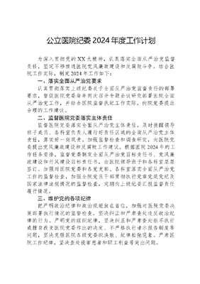 公立医院纪委2024年度工作计划为深入贯彻党的XX大精神,认真落实全面从严治党监督责任,坚定不移推进医院党风廉政建设和反腐败斗争,结合医院工作实际,制定2024年工作如下:一、落实全面从严治党要求认真贯彻落实上级纪委关于全面从严治党监督责任的部署要求,督促医院党委每年两次召开专题会议研究部署医院全面从严治党工作,并结合医院监督执纪工作实际,向院党委提出合理的工作建议。二、监督医院党委落实主体责任监督医院党委落实全面从严治党主体责任,及时提醒领导班子成员、各科室负责人履行好责任区域的全面从严治党主体责任,落实好一岗双责。加强监督检查和调查研究,向医院党委提出党风廉政建设和反腐败工作建议。根据医院2024年的工作任务安排,监督党委制定全面从严治党目标责任书、党风廉政建设和行风建设目标责任书,由医院领导班子和各科室层层签订。加强对医院党委和各党支部、各科室落实全面从严治党工作的监督检查,加强全院党员干部贯彻执行党章党规党纪及国家法律法规情况的监督检查,定期向上级纪委汇报监督责任履行情况。三、维护党的各项纪律把严明政治纪律和政治规矩放在首位,加强对医院党委决策部署执行情况的监督检查,坚决纠正和严肃查处违反政治纪律的行为。严明党的组织纪律,坚决纠正和严肃查处拒不执行或擅自改变医院党委作出的决定、不严格执行请示报告制度等问题,坚决克服医院各级党委织涣散、纪律松弛现象。严肃医院工作纪律,坚决查处侵害患者和职工利益等突出问题。四、加强对医院全面从严治党工作的监督检查加强对医院全面从严治党和党风廉政建设工作年中督导和年底考核工作,对各科室落实全面从严治党工作任务进行监督检查,切实把全面从严治党检查考核结果作为对党员干部民主评价、评优评先、职称晋升、选拔任用等的重要依据。强化考核结果运用并对未完成工作任务的科室和主要负责人严肃问责。五、深化医院行业作风建设持之以恒推进中央八项规定精神,围绕医院的重点岗位、重点环节,重点人员开展监督检查,从严查处违纪违规行为,通报曝光典型事件。针对四风方面存在的突出问题,深入开展突出问题系列专项治理。加强惩治和预防腐败体系建设,完善医院廉洁风险防控机制,重点查找风险点,制订防控措施,筑牢制度防线。六、加大对违规违纪行为的处置力度结合全国医药领域腐败问题集中整治总体要求,继续保持严的基调,进一步加大问题线索的处置力度,对发现的问题线索该查处的查处,该报告的报告。坚持依纪、依法、依规处理,严格按照监督执纪规则的要求处置反映领导干部问题的线索,及时向医院党委和市纪委报告问题线索的查办情况。健全投诉举报件调查处理机制,认真调查处理举报和投诉的问题。严格落实一案双查和一案双究机制,既严肃查处当事人责任,又要追究有关科室相关领导的责任。七、加强党内监督,严格履行监督职责协助医院党委抓好全面从严治党任务分解,督促医院党委落实好民主生活会和组织生活会、个人重大事项报告、述责述廉报告等党内政治生活制度;督促党委书记、院长落实不直接分管、三重一大事项集体决策等制度,并实行向同级党委成员提醒告知制度,加强对干部选拔任用工作的监督,共同营造良好的医院发展环境。医院纪委严格履行监督责任,及时了解全院党员干部的思想、工作、作风、生活状况,及时纠正发现的问题,切实提升履行监督责任的工作成效。八、聚集主责主业,严肃执纪问责切实落实三转要求。采取有力措施推动纪检干部转职能、转方式、转作风,把全面从严治党主体责任的落实情况作为监督的重点,主动履职尽责不懈怠,把监督责任落实、落小、落细,推动解决党内政治生活中存在的突出问题,坚决杜绝侵害人民群众的医疗不正之风。加强对领导干部的日常管理监督,用纪律管住大多数,用严肃问责警示教育全院党员干部。九、综合运用好监督执纪的四种形态把践行监督执纪四种形态的第一种形态作为常态性工作,加强对医院党员干部的日常管理,对发现的党员干部的苗头性、倾向性问题,早发现、早提醒、早纠正、早查处,对苗头性问题及时约谈,加强诫勉谈话工作,防止小问题变成大问题。十、突出监督重点,持续纠正四风持之以恒落实中央八项规定精神及省、市、县委实施意见的监督检查。为把八项规定精神落细、落小、落实在服务患者的实践中。围绕关键岗位和重点环节,突出元旦、春节、五一等重要时间节点开展廉政提醒和监督检查,加大惩戒问责和通报曝光力度,形成有力震慑。十一、开展专项治理,整治群众身边的不正之风和腐败问题积极落实市纪委和市卫健委开展的各种专项治理活动,针对医疗服务行业中存在的损害群众利益的不正之风和腐败问题开展专题督导检查,对问题反映比较集中、比较典型的重点开展调查,进行集中治理,对存在严重违规违纪行为的,严肃问责。十二、加强医院的廉政文化建设,增强党员的党性修养加强对中央、省委、市纪委反腐倡廉决策部署和实践成果的宣传,加强对党章党规党纪的宣传教育,创新性打造廉