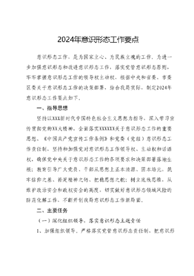 2024年意识形态工作要点意识形态工作,是为国家立心、为民族立魂的工作。为进一步加强意识形态和改进意识形态工作,落实党管意识形态原则,牢牢掌握意识形态工作的领导权主动权,根据中央和省委、市委区委关于意识形态工作的决策部署,结合我局实际,制定2024年意识形态工作要点如下。一、指导思想坚持以XXX新时代中国特色社会主义思想为指导,深入学习宣传贯彻党的XX大精神,全面落实XXXXXX关于意识形态工作的重要思想、《中国共产党宣传工作条例》和党委(党组)意识形态工作责任制,坚持和加强党对意识形态工作领导权、主动权和话语权,确保党中央关于意识形态工作的各项要求和决策部署落地生根;教育引导广大党员、干部从思想上正本清源、固本培元,筑牢信仰之基、补足精神之钙、把稳思想之舵;树立底线思维,从维护政治安全和政权安全的高度,切实做好意识形态领域风险的防范化解工作,不断开创我局意识形态工作新局面。二、主要任务(一)深化组织领导,落实意识形态主题责任1、加强组织领导。严格落实党管意识形态责任制,把意识形态工作与党建工作、精神文明建设工作紧密结合,与中心工作同部署、同落实、同检查、同考核。要把做好意识形态工作摆在极端重要位置,树牢底线意识,时刻绷紧意识形态安全这根弦,加强组织领导,强化风险意识,把工作做在前面、把问题解决在萌芽状态。2、加强理论学习。结合党委理论学习中心组学习计划、各党支部学习计划,通过中心组学习、三会一课学等形式,常态化开展政治理论学习。充分运用学习强国、共产党员网等平台,组织开展网络自学、线下宣讲学引导党员干部自觉增强四个意识、坚定四个自信、做到两个维护。把意识形态工作作为理论学习中心组必学内容,每年安排学习不少于2次。3、加强督导考核。坚持把意识形态工作作为党的建设的重要内容,列入党建年度工作要点,纳入重要议事日程,纳入党建工作责任制,纳入领导班子、领导干部目标管理,纳入领导班子及班子成员民主生活会和领导干部述职述廉报告重要内容,与党建等其它工作一同部署、一同落实、一同检查、一同考核。局党组各支部全年专题研究意识形态工作,分析研判意识形态领域的风险点不少于2次,开展本系统、本单位意识形态领域督查不少于1次。每半年向上级部门专题汇报意识形态工作。(二)深化宣传教育,营造良好向上舆论氛围4、强化理论武装。充分发挥理论学习中心组示范带头作用,严格落实第一议题制度,总结学习经验。严格执行《中国共产党党委(党组)理论学习中心组学习规则》,按照中心组年度学习安排,全年至少安排12次以上集中学习。做好做强马克思主义宣传教育工作,特别是要在学懂弄通做实深入学习XXXXXX关于意识形态工作的重要论述精神及XXX新时代中国特色社会主义思想上下功夫,讲清楚辉煌成就背后的理论逻辑、制度原因,更好统一党员干部思想和行动,增强信心和底气。5、加强舆论宣传。引导党员干部坚定理想信念,把握好正确的立场方向,主动了解意识形态领域的热点前沿问题,并认清和辨识各种社会思潮利害。不断提升理论宣传的能力水平,在把握正确政治方向和舆论导向的基础上不断提升新闻舆论的传播力、引导力、影响力、公信力,为新时代改革发展新营造良好的舆论氛围。密切联系群众,发挥引领群众自觉认同主流意识形态的感召力和引领力,并且善于运用大众化、口语化、形象化的群众语言进行沟通交流。6、强化阵地建设。强化新闻宣传,弘扬正能量,围绕服务中心大局,做好业务成效宣传。强化舆情管控,完善应对机制,严格24小时值班制度,定期开展分析研判,畅通网络应急处置机制妥善处置舆情;健全社会舆情信息员队伍建设,做好舆论引导。重视外宣工作,强化队伍建设,打造一支政治坚定、工作负责、业务精通的宣传思想文化工作队伍。(三)加大管控力度,坚决维护好网络阵地安全7、强化意识形态领域风险防范化解。建立健全舆情会商研判工作机制,定期分析研判意识形态领域情况,每年至少形成1份意识形态分析研判报告。围绕重要时间节点和重大活动,分析研判本单位本系统舆情和意识形态,作出工作安排。建立重大舆情和突发事件舆论引导机制,对重大事件、重要情况、重要社情民意中的倾向性苗头性问题有针对性地进行引导,每年至少在党内通报1次意识形态领域情况,每年向上级党委专题汇报1次意识形态工作。8、维护网络意识形态安全。严格落实中央办公厅印发的《党委(党组)网络意识形态工作责任制实施细则》,明确网络意识形态工作分管领导和责任人员,对涉及重大舆情事件做到第一时间发现、第一时间研判、第一时间报送、第一时间处置。对本部门本系统本领域官方网站、公众号、短视频等重点平台开展自查,针对造谣传谣、炮制有害信息、恶意炒作等突出问题,坚决打击,从严处置。要进一步加强互联网内容和渠道建设,建立网络评论员队伍,提高网络宣传、舆论引导和舆情处置能力。9、着力营造清朗网络空间。坚