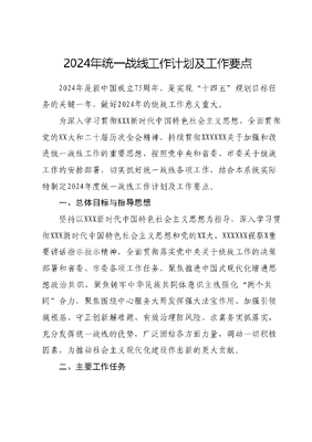 2024年统一战线工作计划及工作要点2024年是新中国成立75周年,是实现十四五规划目标任务的关键一年,做好2024年的统战工作意义重大。为深入学习贯彻XXX新时代中国特色社会主义思想,全面贯彻党的XX大和二十届历次全会精神,持续贯彻XXXXXX关于加强和改进统一战线工作的重要思想,按照党中央和省委、市委关于统战工作的安排部署,切实抓好统一战线各项工作,结合本系统实际特制定2024年度统一战线工作计划及工作要点。一、总体目标与指导思想坚持以XXX新时代中国特色社会主义思想为指导,深入学习贯彻XXX新时代中国特色社会主义思想和党的XX大、XXXXXX视察X重要讲话指示批示精神,全面贯彻落实党中央关于统战工作的决策部署和省委、市委各项工作任务,聚焦推进中国式现代化增进思想政治共识,聚焦铸牢中华民族共同体意识主线强化两个共同合力,聚焦围绕中心服务大局发挥强大法宝作用,加强引领筑根基、守正创新解难题、有效治理防风险、求真务实抓落实,充分发挥统一战线的优势,广泛团结各方面力量,调动一切积极因素,为推动社会主义现代化建设作出新的更大贡献。二、主要工作任务(一)坚持用党的创新理论凝心铸魂,始终把牢正确政治方向。坚持把统战工作纳入局党组议事日程,将统战工作与业务工作、党建工作同研究同部署,严格做到年初有安排、年中有落实年终有总结。把统战理论学习列入党组中心组理论学习内容和党员干部日常学习计划,学习宣传贯彻《中国共产党统一战线工作条例》,学习《XXX关于统一战线工作论述摘编》和《XXXXXX关于加强和改进统一战线工作的重要思想学习辅导读本》,将理论学习和业务工作深度融合,不断提高政治素质和统战理论政策水平推动综合能力同步提升。(二)巩固拓展主题教育成果,持续夯实统一战线共同团结奋斗的思想政治基础。严格持续巩固拓展主题教育成果,建立健全常态化、长效化理论学习制度,加强对重大理论创新、重要理论问题的学习领会,切实将XXXXXX重要指示精神落实到统战工作各方面全过程。聚焦思想政治引领主责主业,结合新中国成立75周年、中国共产党领导的多党合作和政治协商制度确立75周年,开展统一战线各类主题教育和政治培训,强化理想信念教育和政治共识教育,建立健全党外人士思想政治工作体系和长效机制,不断增进统战成员的政治认同、思想认同、理论认同、情感认同准确掌握党外人士的思想动态,有针对性地做好理顺情绪、化解矛盾、解疑释惑、凝聚共识的工作,引导广大统战成员忠诚捍卫两个确立、坚决做到两个维护。(三)务实高效服务中心大局,在经济社会高质量发展中彰显统战作为。深刻把握推进中国式现代化这一最大的政治,找准围绕中心、服务大局的切入点、发力点,汇聚起一起来想、一起来干的磅礴力量。坚持好发展好完善好中国新型政党制度,提升多党合作制度效能,推动新时代多党合作更加规范有序、生动活泼。围绕促进两个健康,积极构建亲清统一的新型政商关系,大力促进民营经济发展壮大。坚持团结引导和发挥作用并重,创新开展党外知识分子和新的社会阶层人士统战工作。加强党外代表人士队伍建设,健全完善党外代表人士业绩统计报告制度。树立互联网思维,走好网上群众路线,着力防范化解风险隐患,牢牢守住意识形态安全底线。(四)切实加强党的全面领导,推动统战工作深度融入基层党建和社会治理体系。完善大统战工作格局,压实统战工作主体责任,细化党委(党组)以及领导干部的统战工作责任内容、履责方式、重点任务,增强把统战工作纳入巡视巡察、监督执纪问责的工作力度,探索把党中央关于多党合作重要决策部署贯彻落实情况等纳入考核内容,构建覆盖全面、奖惩分明、环环相扣的责任体系。健全完善专项工作协调机制和成员单位年度述职制度把统战工作方针政策有机嵌入其他领域的政策法规和工作实践,推动各方加强工作协同、形成工作合力。加强基层统战工作,着力推动统战工作融入基层党建和社会治理体系,更好发挥基层统战组织团结引导、服务发展等作用,通过党建引领打通基层统战工作最后一公里。三、重点工作任务(一)加强民主党派建设方面。支持各民主党派加强自身建设。协助各民主党派制定发展规划和工作计划,支持开展各项参政议政活动,提高参政议政能力和水平。加强与各民主党派的沟通联系,及时了解掌握他们的工作动态和意见建议。推动多党合作事业发展。积极搭建平台载体,支持各民主党派就经济社会发展中的重大问题开展联合调研和协商议政活动。同时,加强对多党合作事业的宣传力度,提高社会各界对多党合作制度的认知度和认同感。(二)做好民族宗教工作方面。贯彻落实党的民族政策和宗教政策。加强民族团结进步创建活动,促进各民族之间的交流交往交融。同时,依法管理宗教事务,维护宗教和谐稳定。加强涉民族宗教因素矛盾纠纷排查化解工作。建立健全矛盾纠纷排查化解机制,及时发现并妥善处理涉及民族宗教因素的矛盾纠
