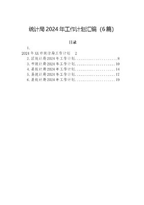 统计局2024年工作计划汇编(6篇)目录1.2024年XX市统计局工作计划22.区统计局2024年工作计划.83.市统计局2024年工作计划104.县统计局2024年工作计划145.县统计局2024年工作计划176.县统计局2024年工作计划192024年XX市统计局工作计划2024年,全市统计工作总体思路是:以习近平新时代中国特色社会主义思想为指导,全面贯彻落实党的二十大和中央经济工作会议精神,深入贯彻落实习近平总书记视察广东重要讲话、重要指示精神和关于统计工作重要讲话指示批示精神,深入贯彻落实全国、全省统计工作会议和全省、全市高质量发展大会精神,细化落实省委1310具体部署及市委1312思路举措,锚定排头兵、领头羊、火车头标高追求,以再出发的拼劲干劲闯劲全力以赴推动二次创业,坚守统计数据质量生命线,抓实抓细五经普工作,摸清摸准XX经济家底,扎实推进三个服务提质效,持续深化改革创新强活力,凝心聚力服务大局出实绩,在推进中国式现代化的XX实践中谱写统计新篇章。重点落实以下工作:(一)进一步发挥专业优势,推动统计三服务实现新跃升一是为中心工作提供专业服务。充分发挥统计的预测预判预警作用,持续提高统计数据质量,加强经济运行监测分析,密切关注经济运行中苗头性、趋势性、倾向性问题,为市委、市政府开展经济稳增长工作提供优质高效统计服务。二是为各区、行业部门提供精准服务。密切关注行业政策措施效应,聚焦重点问题、重点项目和企业清单式列表;及时提供翔实数据,深入分析行业、产业和区域经济发展的长短板,助力各区发挥经济稳增长主阵地作用,助推各部门管行业就要管经济发展。三是为持续改善民生提供贴心服务。不断完善城市环境、人口就业、健康养老、文化体育、妇女儿童等社会民生统计,围绕民生热点问题开展万户居民调查,积极反映人民群众的实际感受,助力增添幸福城市底色。(二)进一步融入中心大局,推动统计抓落实能力实现新跃升围绕谋深做实市委1312思路举措,紧盯重点领域,充分发挥统计职能作用,以推动工作大落实助力XX高质量发展开创新局面。一是围绕助力纵深推进新阶段粤港澳大湾区建设,继续完善南沙先行区统计监测机制,积极支持南沙开展各项统计改革创新试点工作。二是围绕助力加快构建以实体经济为支撑的现代化产业体系,加大对新型工业化的探讨,探索研究建立反映两业融合发展情况的统计指标体系和评价体系。三是围绕助力深入实施百千万工程,做好市、区两级统计数据整理提供和测算服务,着力完善镇(街)、村(居)级统计规范化建设,利用统计智库平台实现农业联网直报,提高农业农村统计数据质量和填报管理效率。四是围绕助力着力加强城市规划建设治理,不断完善城市更新投资统计。五是围绕助力持续强化中心城市门户枢纽功能,密切联动市交通运输局、港务局等职能部门,不断提升交通运输统计监测工作水平。六是围绕助力深入推进绿美XX生态建设,扎实开展能耗核算和碳排放统计核算工作,加强对全市电力供需形势的统计监测,积极开展新型储能、绿电交易等相关领域的分析研究。(三)进一步抓细抓实五经普,推动统计盯重点能力实现新跃升围绕普查登记核心环节,抓好全市超两百万市场主体的数据填报尤其是重点指标的填报质量,摸清摸准XX经济家底。一是凝聚各方合力,着力在普查宣传、查找单位、协调入户、跟踪催报等方面发挥成员单位的积极作用。二是压实区、镇街一把手职责,做好各项物资供应和普查程序培训。三是广泛开展宣传告知,营造支持配合普查的良好氛围。四是稳定两员队伍,及时了解基层情况,加强业务指导和现场督导。五是坚持质量导向,坚持做到经普数据真实、质量有保证。(四)进一步开拓创新,推动统计解难题能力实现新跃升一是继续开展数据生产要素统计试点。进一步深化数据生产要素统计核算理论研究,为反映数据生产要素在高质量发展阶段的贡献提供XX经验。二是持续纵深推进统会融通企业电子统计台账建设工作。密切关注国家统计局有关企业电子统计台账工作要求的变化,做好已在库企业使用维护和新入库企业推广使用。三是探索开展服务零售额测算。结合上级安排,探索利用部门行政记录、第三方大数据等,完善服务消费市场发展变化情况的统计监测。四是探索建设劳资数据电子台账。针对劳资报表口径繁杂、数据填报汇总多源头、指标计算复杂的特点,研究制定我市劳资统计标准电子台账。(五)进一步做好年定报工作,推动统计数据提质量实现新跃升筑牢统计数据质量生命线,扎实组织做好全部调查单位年定报及各项调查工作,强化数据质量全过程管理,严格落实统计数