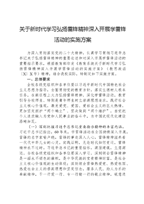 关于新时代学习弘扬雷锋精神深入开展学雷锋活动的实施方案为深入贯彻落实党的二十大精神,认真学习贯彻习近平总书记关于弘扬雷锋精神的重要论述和对深入开展学雷锋活动的重要指示要求,根据教育部印发《教育系统关于新时代学习弘扬雷锋精神深入开展学雷锋活动的实施方案》(教思政函〔X〕X号)精神,结合我校实际,特制定如下实施方案。一、总体要求全校各级党组织和各单位要以习近平新时代中国特色社会主义思想为指导,全面贯彻党的教育方针,落实立德树人根本任务,在新征程上大力弘扬雷锋精神,深化学雷锋活动,教育引导全校师生、特别是青年师生树立崇高理想追求,践行社会主义核心价值观,激发爱党、爱国、爱社会主义的巨大热情,更加坚定拥护两个确立、坚决做到两个维护,自觉把个人追求融入为党和人民事业的奋斗中,为中国式现代化建设添砖加瓦。(一)深刻把握习近平总书记重要指示精神的丰富内涵。习近平总书记指出,60年来,学雷锋活动在全国持续深入开展,雷锋的名字家喻户晓,雷锋的事迹深入人心,雷锋精神滋养着一代代中华儿女的心灵。实践证明,无论时代如何变迁,雷锋精神永不过时。习近平总书记的重要指示,高屋建瓴,立意高远。全校各级党组织和各单位要深入学习,深刻领会雷锋精神是一面永不褪色的旗帜,是中华民族的宝贵精神财富,是社会主义核心价值观的生动体现;深刻领会雷锋热爱党、热爱祖国、热爱社会主义的崇高理想和坚定信念,服务人民、助人为乐的奉献精神,干一行爱一行、专一行精一行的敬业精神,锐意进取、自强不息的创新精神,艰苦奋斗、勤俭节约的创业精神的思想内涵。(二)全面落实习近平总书记提出的明确要求。习近平总书记强调,要深刻把握雷锋精神的时代内涵,更好发挥党员、干部模范带头作用,加强志愿服务保障和支持,不断发展壮大学雷锋志愿服务队伍,让学雷锋在人民群众特别是青少年中蔚然成风,让学雷锋活动融入日常、化作经常,让雷锋精神在新时代绽放更加璀璨的光芒。全校各级党组织和各单位要在深化雷锋精神研究阐释、加强思想政治引领上下功夫,持之以恒引导广大师生传承雷锋精神,为在全社会弘扬雷锋精神、凝聚中华民族伟大复兴的精神力量作出更多实质性贡献;要发挥师生党员、干部和先进典型的示范带动作用,丰富拓展学雷锋活动的平台载体,推动形成齐抓共管的长效机制,使学雷锋活动更有时代感吸引力、做到常态化长效化。(三)有机融入立德树人全过程各方面。全校各级党组织和各单位要坚持把传承雷锋精神作为立德树人的重要内容,立足战线特点和优势,坚持知信行统一,将雷锋精神深度融入教学和人才培养的全过程、各方面,统筹用好各类教育资源,着力培养造就担当民族复兴大任的时代新人,为把雷锋精神代代传承下去提供薪火相传的生动实践和基础性、战略性支撑。二、工作安排(一)发挥课堂主渠道作用全校教师要把雷锋精神的时代价值融入对学生的思想政治教育。结合教育教学实际,充分利用体现雷锋精神的丰富素材和教育资源,有针对性地把雷锋精神融入课堂教学,让全体青年学子对雷锋精神应知尽知、深刻理解,充分感悟雷锋精神的时代内涵。(责任单位:各教学单位)(二)深化雷锋精神研究阐释深入学习研究习近平总书记关于弘扬雷锋精神的重要论述进一步阐释新时代雷锋精神的时代内涵、文化内涵和实践传承,深入挖掘雷锋精神与培育时代新人之间的内在关系和融合方式,力争推出一批有分量的研究成果,为传承弘扬雷锋精神提供扎实学理支撑。(责任单位:党委宣传部、学生工作部、通识教育学院、马克思主义学院)(三)全面融入校园文化建设将传承弘扬雷锋精神融入文明校园建设工作,把传承弘扬雷锋精神等中国共产党人的精神谱系,作为学校校园文化建设的重要内容。突出校园文化活动春风化雨作用,系统开展学雷锋主题团日、团课等活动,发挥朋辈育人作用,鼓励支持各类学生社团开展形式多样、健康向上、格调高雅的学雷锋文化活动和艺术实践活动。(责任单位:党委宣传部、学生工作部、校团委、各团总支)(四)大力选树宣传先进典型发挥先进典型的示范带动作用,开展学雷锋标兵评选和学雷锋先进事迹的宣传学习,大力宣传学校创先争优先进典型,在校园掀起学模范、见行动的热潮,推动广大师生争当新时代雷锋精神的传人。(责任单位:学生工作部)(五)召开主题班会做好统筹安排,组织各学院辅导员召开新时代学习弘扬雷锋精神主题班会。通过主题班会,让雷锋精神在全校青年学子中入脑入心。(责任单位:学生工作部,各二级学院党总支)(六)广泛开展学雷锋志愿服务活动结合学校各级党组织、团组织实际,积极拓展学雷锋活动的平台载体,丰富志愿服务活动的形式内容。持续推动大学生志愿服务西部计划、三下乡等品牌工作,组织在校学生开展力所能及的志愿服务活动,激发青年学子通过实际行动参与志愿服务的热情。(责任单位:党委宣传部,各二级学院党总支,校团委及各团总支)三、工作要求(一)加强统筹领导。全校各级党组