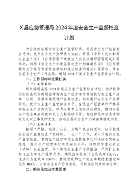X县应急管理局2024年度安全生产监督检查计划为全面依法履行安全生产监管职责,规范安全生产监督检查行为,提升安全生产监管执法效能,根据《中华人民共和国安全生产法》《应急管理行政执法人员依法履职管理规定》等规定,对照《安全生产年度监督检查计划编制办法》《应急管理部关于规范督查检查考核和执法检查的意见》等要求,结合全县安全生产工作实际,编制2024年度安全生产监督检查计划。一、工作目标和主要任务(一)工作目标通过编制实施2024年度安全生产监督检查计划,指导我局承担执法职责的股室对有关生产经营单位贯彻执行安全生产法律、法规、规章等情况进行监督检查,切实履行安全生产监管职责,提升安全生产监管执法水平,督促生产经营单位严格落实安全生产主体责任,努力从根本上消除风险隐患,推动全县生产安全事故起数和死亡人数继续下降,有效防范和坚决遏制较大及以上事故的发生,推动全县安全生产形势持续稳定向好。(二)主要任务按照严格、规范、公正、文明执法的要求,结合推进安全生产监督检查双随机、一公开工作,深入开展安全生产监督检查,督促生产经营单位全面排查和及时消除各类安全隐患,提升生产经营单位本质安全水平;持续抓好重点行业(领域)安全监管,深入推进安全生产专项整治,严厉打击各类违法违章生产经营行为;确保监督检查计划完成率100%;违法行为查处率100%;督促发现的生产安全事故隐患整改率达到100%,力争安全生产行政复议、行政诉讼的败诉率为零。二、编制依据及考量因素(一)编制依据《中华人民共和国安全生产法》《中共中央国务院关于推进安全生产领域改革发展的意见》《关于深化应急管理综合行政执法改革的意见》《生产安全事故应急条例》《危险化学品安全管理条例》《金属非金属矿山安全规程》《应急管理行政执法人员依法履职管理规定》《安全生产年度监督检查计划编制办法》《应急管理部关于规范督查检查考核和执法检查的意见》《应急管理部关于加强安全生产执法工作的意见》《安全生产执法手册(2020年版)》以及《X省安全生产条例》《X省人民政府办公厅关于推广随机抽查规范事中事后监管的通知》《X省提升行政执法质量三年行动计划实施方案(2023-2025年)》《X省应急管理厅关于推进安全生产分类分级执法的指导意见(试行)》等有关法律、法规、规章、规定和政策。(二)考量因素1.行政执法人员的数量和能力。2.本部门监管检查职责范围内生产经营单位的数量、分布、生产规模及其安全生产状况。3.重点检查的行业领域及生产经营单位状况。4.道路交通状况以及执法车辆、技术装备配备和执法经费情况。5.影响年度监督检查计划执行的其他因素。(三)编制原则按照统筹兼顾、分类分级、突出重点、提高效能、守牢底线的原则,编制年度监督检查计划。三、行政执法工作人员数量和执法工作日测算(一)行政执法人员数量根据《中共X县委办公室X县人民政府办公室关于印发〈X县人民政府办公室职能配置、内设机构和人员编制规定〉等14个部门三定规定的通知》(X〔2019〕X号)和《中共X县委机构编制委员会〈关于设立县应急管理综合行政执法大队等事项的通知》(X〔2022〕X号)等规定,我局共有行政编制10名,事业编制19名,实际在册人员25人(其中,局领导5人),实际纳入2024年度行政执法人员数量为17名,占在册人数的68%。其中:从事工矿商贸(非煤矿山行业和冶金、有色、建材、机械轻工、纺织、烟草、商贸等行业)安全监管执法工作人员2名;从事危险化学品、烟花爆竹和非药品类易制毒化学品安全监管执法工作人员2名;从事应急管理监管执法工作人员2名。从事政策法规、综合协调、执法监督、调查统计、办公室行政审批等工作人员11名。(二)执法工作日测算1.总法定工作日。总法定工作日是指国家规定的法定工作日和本部门行政执法人员总数的乘积。2024年全年366日,共53周,双休日104日,国家法定节假日11日.总法定工作日=国家法定工作日(全年天数-全年公休日数-国家法定节假日数)×执法人员数量=(366-104-11)×17=4267个工作日。2.其他执法工作日。其他执法工作日包括开展安全生产综合监管;实施行政许可;组织生产安全事故调查和处理;调查核实安全生产投诉举报;参加有关部门联合执法;办理有关法律法规、规章规定的登记、备案;开展安全生产宣传教育培训;办理行政复议、行政应诉;完成上级及县委、县政府安排的执法工作任务预计所占用的工作日等。参照前3个年度的统计平均数,结合执法工作实际,测算2024年度其他执法工作日为2057个工作日。3.非执法工作日。非执法工作日包括参加机关值班、学习、培训、考核、会议、检查指导下级应急管理部门工作、参加党群活动、病假、事假、法定年休假、探亲假、婚(丧)假等工作预计所占用的工作日等。参照前3个年度的统计平均数,结合机构改革后工作