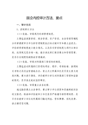 国企内控审计方法、要点一、审计方法1、控制审计方法(1)收集、审阅现行的部管理制度。主要包括预算管理、财务管理、资产管理、业务管理等制度分析掌握被审计单位部管理制度执行的关键环节和重点监控点,评价部管理制度建立健全情况,以及各项管理制度与现行法律法规、政策规定是否相一致,能否满足部门职责要求和管理需要,是否存在制度性缺陷或管理漏洞。(2)收集、审阅对所属部门管理的控制度。主要包括对所属部门管理的项目、程序、考核标准,查阅相关考核记录及监管措施办法,重点关注所属单位是否发生重大违规问题、重大责任事故。评价被审计单位对所属部门管理和监督的情况,是否真正起到监管职责。(3)收集、审阅重点业务流程。通过抽查重点业务事项,重点审计单位预算和其他财政财务收支情况,检查和评价被审计单位是否严格遵守部管理制度,是否存在被审计单位向所属部门输送利益、营私舞弊、损失浪费、挤占挪用等问题。2、控制审计测试符合性测试是对部控制制度的遵循情况进行检查评审的活动其目的是测试执行情况符合制度要求的程度。它所采用的方法主要有:审阅证据、跟踪重做、以及实地观察等;实质性测试是对被审单位的经济信息,各种数据进行审核检查的活动,其目的在于验证、评估信息本身的合法性、真实性。测试中常用的方法有盘存法、询证法、账户分析法、调节法、鉴定法等。二、审计要点1、管理制度的完善情况包括部管理制度是否健全,执行是否有效。不相容岗位相互分离制度是否健全、部授权审批控制制度,重大事项集体决策和会签制度,是否根据本单位实际情况,按照权责对等的原则,成立联合工作小组并确定牵头部门或牵头人员等方式,对有关经济活动实行统一管理。是否强化对经济活动的预算约束,使预算管理贯穿于经济活动的全过程。是否建立资产日常管理制度和定期清查机制,采取资产记录、实物保管、定期盘点、账实核对等措施,确保资产安全完整。是否建立健全本单位财会管理制度,加强会计机构建设,提高会计人员业务水平,强化会计人员岗位责任制,规会计基础工作,加强会计档案管理,明确会计凭证、会计账簿和财务会计报告处理程序。是否根据国家有关规定和单位的经济活动业务流程,在部管理制度中明确界定各项经济活动所涉及的表单和票据,要求相关工作人员按照规定填制、审核、归档、保管单据。是否建立健全经济活动相关信息部公开制度,根据国家有关规定和单位的实际情况,确定信息部公开的容、围、方式和程序。2、关键岗位工作人员的管理情况包括是否建立工作人员的培训、评价、轮岗等机制;工作人员是否具备相应的资质和能力,特别是部控制关键岗位工作人员是否具备与其工作岗位的相适应的资格和能力。是否根据《会计法》的规定建立会计机构,配备具有相应资质和能力的会计人员是否加强部控制关键岗位工作人员业务培训和职业道德教育,不断提升其业务水平和综合素质。3、预算管理情况主要包括单位部各部门之间在预算编制过程中是否充分沟通协调,是否将预算编制与资产配置相结合,预算编制与具体工作是否相对应;是否按照批复的额度和开支围执行预算,进度是否合理,是否存在无预算、超预算支出等情况;决算编报是否真实完整、准确、及时。4、收支管理情况主要包括是否实现收入归口管理,是否按照规定及时向财会部门提供收入的有关凭据,是否按照规定保管和使用印章和票据等;是否按照规定审核各类支出凭据的真实性、合法性,是否有使用虚假票据套取资金的情形。5、政府采购管理情况主要包括是否按照预算、计划和政府采购规定组织实施政府采购业务,是否按照政府采购规定执行验收程序,是否按照规定保存政府采购相关档案。6、资产管理情况主要包括是否实现资产归口管理并明确使用责任,是否定期对资产进行清查盘点,及时处理账实不符的情况,是否按照规定处置资产。7、建设项目管理情况主要包括是否按概算投资,严格履行审核审批程序,建立有效的招投标控制机制;是否有截留、挤占、挪用、套取建设项目资金的情形;是否按照规定保存建设项目相关档案并及时办理移交手续。8、合同管理情况主要包括是否实现合同归口管理,明确应签订合同的经济活动围和条件;是否有效监控合同履行情况,建立合同纠纷协调机制。三、内部控制关键点主要查看单位预决算业务控制、收支业务控制、政府采购业务控制、资产控制、建设项目控制、合同控制以及部监督等经济活动的部控制关键环节。1.预决算业务关键控制点。主要包括是否建立健全预算编制、审批、执行、决算与评价等预决算部管理制度。(1)预算管理。是否合理设置岗位,明确相关岗位的职责权限,预算编制、审批、执行、评价等不相容岗位是否相互分离。预算编制是否做到程序规、方法科学、编制及时、容完整、项目细化、数据准确。是否建立部预算编制、预算执行、资产管理、基建管理、人事管理等部门或岗位的沟通协调机制,并按照规定进行项目评审,根据工作计划细化预算编制。是否根据设部门的职责和分工,对按照法定