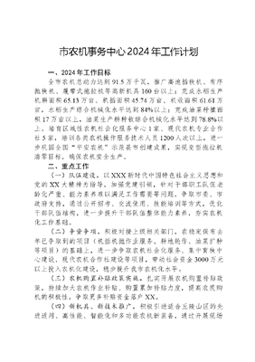 市农机事务中心2024年工作计划一、2024年工作目标全市农机总动力达到91.5万千瓦,推广高速插秧机、有序抛秧机、履带式拖拉机等高新机具160台以上;完成水稻生产机耕面积65.13万亩、机插面积45.74万亩、机收面积61.61万亩,水稻生产综合机械化水平达到84%以上;完成油菜种植面积17万亩以上,油菜生产耕种收综合机械化水平达到78.8%以上。培育区域性农机社会化服务中心1家、现代农机专业合作社5家,培训各类农机操作服务技术人员1200人次以上,进一步巩固全国平安农机示范县市创建成果,实现变型拖拉机清零目标,确保农机安全生产。二、重点工作(一)队伍建设。以XXX新时代中国特色社会主义思想和党的XX大精神为指导,加强党建引领,针对干部职工队伍老龄化严重、能力素养难以满足工作需要等问题,争取市委、市政府支持,通过公开招考、交流使用、技能培训等方式,优化干部队伍结构,进一步提升干部队伍整体能力素养,夯实农机化工作基础。(二)争资争项。积极对接上级相关部门,在稳定保有去年已争取到的项目(机插机抛作业服务、耕地轮作、油菜扩种等项目)的基础上,进一步争取农机社会化服务、集中育秧中心建设、现代农机合作社建设等项目,带动社会资金3000万元以上投入农机化建设,稳步提升我市农机化水平。(三)农机购置补贴政策实施。扎实开展农机购置补贴政策,持续加大农机作业补贴、购置累加补贴力度,提高农民购机的积极性,争取更多补贴资金落户XX。(四)新机具、新技术推广。积极引进适合丘陵山区的先进适用、高性能、智能化和多功能农机新装备,通过开展现场演示会、技术培训、农机比武等方式,全力推广新机具、新技术应用,加速全市农业机械化进程,补齐我市农机化短板。(五)农机安全监管。组织开展新春开工第一课讲安全、农机安全生产宣传月等活动,以送检下乡、拖拉机顽瘴痼疾专项整治行动为抓手,严格把守农机注册登记、年度检审和驾驶员培训考试关口,联合执法与日常巡查、隐患整改紧密结合,力争在2024年底全面完成变型拖拉机全面清零的目标,确保农机安全生产形势稳中向好。(六)农机人才培育培训。加大农村农机实用型人才培养力度,将农机大户、农机合作社负责人、农机操作手、返乡农民工纳入高素质农民、农村实用人才和职业技能培训等范围。(七)农机产业高质量发展。按照《娄底市持续提升农业机械化水平打造智慧智能农机高地十条措施》(娄政办发〔2023〕12号)、《娄底市2023年农机创新研发奖补方案》(娄农联〔2023〕19号)等文件精神,大力扶持农机企业、农机合作社进一步提质增效、做大做强。(八)补短板强弱项。争取市委、市政府重视支持,以育秧、机插(抛)秧、农机维修和机库棚建设等短板为重点,进一步加大政策支持力度,提升技术保障服务能力。