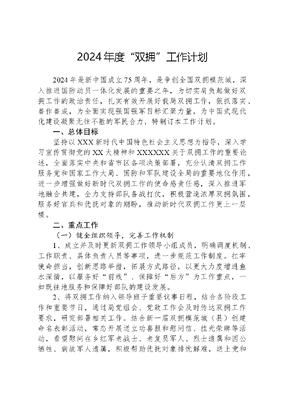 2024年度双拥工作计划2024年是新中国成立75周年,是争创全国双拥模范城,深入推进国防动员一体化发展的重要之年,为切实肩负起做好双拥工作的政治责任,扎实有效开展好我局双拥工作,狠抓落实、善作善成,为全面实现强国强军目标汇聚力量,为中国式现代化建设凝聚无往不胜的军民合力,特制订本工作计划。一、总体目标坚持以XXX新时代中国特色社会主义思想为指导,深入学习宣传贯彻党的XX大精神和XXXXXX关于双拥工作的重要论述,全面落实中央和省市区各项决策部署,充分认清双拥工作服务党和国家工作大局、国防和军队建设全局的重要地位作用,进一步增强做好新时代双拥工作的使命感责任感,深入推进军地融合共建,全力支持部队备战打仗,积极营造浓厚双拥氛围,服务好官兵和优抚对象的期盼,推动新时代双拥工作更上一层楼。二、重点工作(一)健全组织领导,完善工作机制1、成立并及时更新双拥工作领导小组成员,明确调度机制、工作职责、具体负责人员等事项,进一步规范工作制度。扛牢使命担当,创新思路举措,拓展方式路径,以更大力度增进鱼水深情,以服务好前线、保障好后方为工作重点,一如既往地服务和保障好部队的建设发展。2、将双拥工作纳入领导班子重要议事日程,结合各阶段工作和重要节日,通过局党组会、党政工作会及时传达双拥工作要求,研究部署相关工作。结合新一届双拥模范城(县)创建命名表彰活动,常态开展送立功喜报和慰问信、挂光荣牌等活动,看望慰问在乡红军老战士、老复员军人、烈士遗属和因公牺牲、病故军人遗属,积极帮助优抚对象排忧解难,送上党和政府的关怀温暖。3、按进度抓好双拥工作,及时拟定年度工作计划,做到年初有部署,年终有总结。巩固深化双拥工作机制,形成齐抓共管双拥工作格局。突出重点,凝聚合力推动双拥工作取得新成效,奋力谱写双拥工作新篇章。(二)深入学习教育,开展广泛宣传4、深入学习XXX强军思想和关于退役军人重要论述、《中华人民共和国退役军人保障法》、国家及省、市、区退役军人工作相关会议精神,把干部职工思想行动统一到关心、支持、参与双拥工作上来。认真贯彻《军人地位和权益保障法》《退役军人保障法》等法律法规,发挥双拥工作平台和机制优势,落实好军地互办实事双清单,依法维护军人军属合法权益,推动解决涉及官兵切身利益的实际问题。5、利用政府门户网站、宣传栏等媒介,做好双拥工作动态、国防教育和法律知识、拥军优属政策等宣传,在重大事件节点营造浓厚双拥氛围。发扬军民鱼水一家亲的优良传统,充分发挥自身优势,深入开展富有特色的军地联谊共建、主题国防教育等活动,切实为创建营造和谐浓厚氛围、培植双拥丰富载体。(三)强化拥军优属,确保政策落实6、主动履行本单位工作职责,做好双拥工作经费预算、资金拨付、绩效管理等工作。深入贯彻XXXXXX关于双拥工作重要论述,大力弘扬拥军优属、拥政爱民光荣传统,用心用情为做好服务,全力以赴为广大官兵办好事、做实事、解难事,不断巩固发展坚如磐石的军政军民关系。7、做好本单位聘用退役军人统计、教育引导工作,按要求落实好相关政策。积极落实军人子女入学优抚优待政策、把双拥宣传教育作为爱国主义教育的重要内容来开展,坚持推动政策拥军,深入开展国防教育活动,激发党员干部的爱国拥军热情。8、按照区委、区政府统一安排,配合做好八一、春节走访慰问部队,清明节或烈士纪念日祭扫活动。加大对退役军人的关心关爱,采取召开座谈会、恳谈会、茶话会等方式,面对面沟通交流,倾听退役军人意见建议,深入细致做好思想教育工作。要突出帮扶重点,对生活确有实际困难的,各级党委政府和相关单位要切实保障基本生活,确保他们过好冬过好节。三、相关要求(一)加强组织领导。进一步提高政治站位,切实增强做好双拥工作的责任感使命感,坚决扛牢党管武装政治责任,扎实抓好双拥各项工作落实,切实将同呼吸、共命运、心连心的军民鱼水情薪火相传,续写新时代双拥工作新篇章。(二)加强工作落实。严格落实家属随军就业、子女入学优待、医疗和生活保障等惠军政策,真心诚意为部队官兵排忧解难,坚持带着使命、带着感情、带着责任,落实好各项拥军优抚政策,安置好转业干部,为退役军人提供更加精准及时的就业创业服务和职业技能培训,确保他们就业有去处、创业有扶持、失业有帮扶。(三)加强工作对接。加强与主管部门对接,了解双拥相关工作最新工作要求、指标考核情况等,按要求做好工作安排布置,把工作做在平时,落实好上级下达的各项双拥工作任务。在强化组织领导、加强宣传教育、推进双拥创建等工作上下功夫,压紧压实工作责任,大力营造军爱民、民拥军、军民团结一家亲的浓厚氛围,持续推动双拥工作社会化常态化,巩固拓展军政军民团结良好局面。