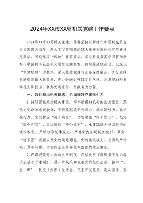 2024年XX市XX局机关党建工作要点2024年XX市XX局机关党建工作要坚持以新时代中国特色社会主义思想为指导,深入学习贯彻党的XX大精神和新时代党的建设总要求,围绕落实四敢重要要求,常态长效落实学习贯彻新时代中国特色社会主义思想主题教育,持续推进XX活动,以深化党建联建为载体,深入推进党建与业务深度融合,充分发挥党建引领最大化效能,着力锻造过硬XX党员队伍,为展现XX形象体现先锋担当、扛起发展重任、贡献有为力量。一、强化政治机关铸魂,全面提升党建牵引力1.持续深化政治机关建设。牢牢把握XX机关的政治属性,深化对党政治忠诚教育,不断提高政治判断力、政治领悟力、政治执行力,坚定捍卫两个确立,切实增强四个意识、坚定四个自信、坚决做到两个维护,永葆XX机关绝对纯洁的政治本色。严明政治纪律规矩,严格党内法规制度执行,聚焦灯下黑问题以及党的领导弱化、党的建设缺失、全面从严治党不力等问题,切实纠正全局各级党组织的政治偏差。2.严肃规范党内政治生活制度。严格执行《新形势下党内政治生活若干准则》,进一步规范和完善党的组织生活,推动三会一课、民主(组织)生活会、民主评议党员、谈心谈话、重大事项请示报告等各项制度落到实处。坚持和完善重温入党誓词党员过政治生日等政治仪式,创新组织生活形式、内容和载体,增强党内政治生活的政治性、时代性、原则性。认真落实请示报告、个人重大事项即报等规定,坚决抵制传播不良消息、妄议重大政治问题等不良习气,争做两个确立忠诚拥护者、两个维护示范引领者。3.全面落实意识形态工作责任。认真贯彻《中国共产党宣传工作条例》,全面落实意识形态工作责任制,将意识形态工作纳入年度目标任务和述职评议内容,纳入三会一课、主题党日等活动,纳入组织生活会重要内容,每年向党委专题汇报意识形态工作不少于2次。突出抓好网络意识形态管理,加强微信公众号网站等阵地建设和管理,落实主管主办责任,推动意识形态工作责任制向基层延伸。各级党组织完善谈心谈话制度,严格规范干部职工网上言行。二、强化队伍思想提质,全面提升党建向心力4.抓实党的XX大精神学习贯彻。把学习宣传贯彻党的XX大精神作为首要政治任务,坚持全面学、系统学、深入学,悟透精神实质,领会精髓要义,掌握践行新时代中国特色社会主义思想的立场、观点、方法;按照中央及省、市委统一部署,推动学习贯彻新时代中国特色社会主义思想主题教育常态长效化,组织开展先进宣讲、好故事大赛等系列活动;每月定期开展政治理论学习深化党委理论学习中心组示范引领和导向作用,全面落实各级党组织第一议题制度,加强全局政治理论学习,着力推动学习教育往平时走、往深里走、往心里走、往实里走。加强XX理论宣讲团建设,培养一批宣讲骨干。实施理论学习宣讲提升工程,组织开展青年干部讲坛、微党课评选等活动,增强青警理论学习宣传的主动性、持续性和有效性。5.做实做细思想政治工作。全局各级党组织要将解决思想问题与解决实际问题相结合,增强思想政治工作实效。党支部要做好日常一人一事的思想政治工作,每半年1次分析研判党员干部思想状况,并向局机关党委汇报,提出改进工作的意见和建议6.加强青年党员理论学习。通过成立青年理论学习小组、开展读书活动、评选青年学习标兵,着重抓好年轻干部理论武装,提升机关干部整体理论水平。三、强化基层基础夯实,全面提升党建组织力7.持续夯实基层组织基础。深入贯彻落实《中国共产党党支部工作条例(试行)》《中国共产党党和国家机关基层组织工作条例》,持续推进党支部标准化建设,以争创党建示范点、先锋党支部为目标和标准,通过抓两头带中间,以先进带后进,抓实基层、打牢基础,持续推动党支部全面进步、全面过硬。对标三会一课数量、质量、能量三量齐升要求,开展优秀主题党日案例评选,增强支部组织力、工作活力。8.抓实抓细党员干部教育培训。建立以全体党员为基础,以党委班子成员党组织书记党务工作者新发展党员党员重点群体五个层面为重点的1+5党员集中教育培训机制,深入开展示范学争先锋活动、打造四个课堂深化大练兵、大比武、大培训活动,全面提升做好新时代XX党员干部工作的能力和水平。严把入党积极分子政治关、品行关加强入党积极分子培养考察,抓好发展党员全程纪实,提升新发展党员质量。四、强化干部队伍提能,全面提升党建指向力9.强化党内激励关怀帮扶。以深化机关党建品牌、创先机关党建机制、争当先进标杆为重点,通过佩戴党徽、创建党员先锋岗、设立党员责任区、争当服务标兵等方式,引导党员增强在党意识、彰显先进性。发挥局党委在选人用人中的监督作用,认真落实党员干部选拔任用、评先评优应听取局党组意见的要求。七一前夕,通过为党员过政治生日、组织慰问困难党员看望老党员等,让党员们