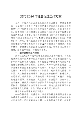 某市2024年社会治理工作方案为进一步推进社会治理体系和治理能力建设,贯彻落实党的十九届四中全会关于坚持和完善共建共治共享的社会治理制度和加快推进社会治理现代化的要求,根据《中共中央、国务院关于加快推进社会治理现代化开创平安中国建设新局面的意见》《省委、省人民政府印发《关于加快推进社会治理现代化开创更高水平平安X建设新局面的若干意见》的通知》和《市委、市人民政府印发《关于争创全国市域社会治理现代化示范市建设更高水平平安X的实施意见》的通知》等文件精神,加快建设社会治理现代化新模式,确保各项工作有序推进,结合我市实际,特制定本方案。一、指导思想和工作原则坚持以XXX新时代中国特色社会主义思想为指导,认真贯彻落实党的十九大和十九届历次全会精神,紧紧围绕坚持和完善中国特色社会主义制度,牢牢把握坚持和完善共建共治共享的社会治理格局的总要求,坚持以人民为中心的发展思想,以防范化解社会治理重大风险为突破口,打造具有人文特色、时代特征、X点的社会治理创新工作体系。充分运用大数据、云计算、人工智能等前沿科技,着力打造特色鲜明、基础扎实、应用全面、成效显著、人民满意的七位一体X模式,加快构建党委领导、政府负责、民主协商、社会协同、公众参与、法治保障、科技支撑的社会治理体系和共建共治共享的社会治理格局,创新提升社会治理能力水平,塑造大数据背景下的社会治理现代化标杆,推动平安X建设迈上新台阶。辖市内社会治理遵循以下原则——加强领导,总揽全局。以全面加强党委领导完善社会治理体系为前提和核心,把党的领导落实到社会治理各领域各方面各环节。不断完善体制机制,加速集聚各方资源,全面贯彻落实中央和省、市、市的决策部署,创新X治理模式。——统筹协调,上下联动。坚持系统治理、依法治理、综合治理、源头治理,动员组织社会力量共同参与,不断优化社会治理六联,即矛盾联调、治安联防、问题联治、平安联创、服务联供、应急联动,形成共建共治共享治理格局。——以用带建,以建促用。以实现社会治理现代化为目标,以防范化解风险为着力点,加大社会治理信息化、智能化建设力度,深入探索智能化应用场景,加快补齐基础短板,配套优化工作机制,推进高质量发展,实现可持续发展。——智治驱动,数字赋能。坚持需求导向和问题导向,推进平台、中心、网格三大基础模块的整合建设,加速大数据运用赋能,横向实现全市政务信息无缝对接,纵向实现市、市、镇(街)、村(社市)各级平台大数据资源共享互用,强化智治基础。——统一指挥,流程重塑。坚持标准先行,完善市级平台基础数据采集标准、平台工作职能要求、中心运转部门协同流程、网格操作规范、任务权责清单等标准规范,向上充分对接市级各指挥平台,重塑辖市内指挥协同体系,健全考评监督机制,不断夯实辖市现代化社会治理基础。——分层分级,确保安全。按照分层授权、分级保护的原则,建立信息安全管理责任与监督检查、数据管理运维等机制,充分利用现有的信息安全保护手段,形成信息产生、传输、交换、使用的全生命周期社会治理安全保障机制。二、总体架构以提升社会治理能力水平为目标,市级社会治理责任单位全数纳入体系,构建一统揽一平台一中心一网格一揽子方案一套机制一支队伍和N+应用的整体布局。(一)一统揽坚持党委领导,统揽全市社会治理各项工作,成立市社会治理工作委员会,加挂市城市综合管理委员会,全面推进社会治理现代化、市域社会治理现代化示范创建、城市综合管理等方面各项工作,研究相关领域的重要问题,协调推动有关政策措施的制定和实施,全力提升辖市社会治理能力现代化水平。(二)一平台坚持多平台合一,在现有公共安全管理平台基础上升级搭建市、镇(街)、村(社市)三级社会治理工作平台,构建数据中台,运用先进算法,实施数据治理,建设跨部门应用场景解决社会治理领域堵点、难点问题,解决现有平台未能统筹、信息统计重复填报、资源利用效率低下等问题。(三)一中心坚持一中心多用,按照平急结合的一体化工作思路,构建完善日常全域覆盖、重大活动加强和突发应急响应三级指挥体系。全面整合市公共安全管理指挥中心、分局情报指挥中心、分局反诈中心、110联动指挥中心、市网格化指挥中心、市12345平台指挥中心和市数字城管指挥中心、诉非联动中心、12309检察服务中心,形成市级指挥中枢——X市社会治理指挥中心,负责平台业务统一指挥调度。(四)一网格坚持多网合一,构建社会治理综合网格,统筹网格内党的建设、综合治理、应急管理、城市综合管理、社会保障服务、矛盾纠纷多元化解、重点人群管控、群众来信来访等工作。合理确定网格监管任务和事项,科学配置网格员力量,实行定人、定岗、定责。推进网格化服务管理标准化建设,提高网格管理规范化精细化水平。(五)一揽子方案组织各部门围绕打造社会