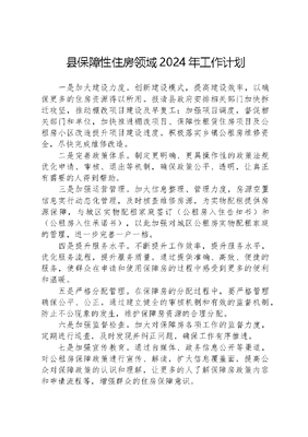 县保障性住房领域2024年工作计划一是加大建设力度。创新建设模式,提高建设效率,以确保更多的住房资源得以所用。报请县政府安排相关部门加快拆迁攻坚,推动棚改项目建设及早复工;加强项目调度,督促相关部门和单位,加快推进棚改项目、保障性租赁住房项目及公租房小区改造提升项目建设进度。积极落实乡镇公租房维修资金,尽快完成维修改造。二是完善政策体系。制定更明确、更具操作性的政策法规优化申请、审核、退出等机制,确保政策公平、透明,让真正有需要的人得到帮助。三是加强运营管理。加大信息整理、管理力度,房源空置信息实行动态化管理,及时核查维修房源,为实物配租提供房源保障,与城区实物配租家庭签订(公租房入住告知书)和(公租房入住承诺书),以此加强对城区公租房实物配租家庭的管理,进一步完善一户一档。四是提升服务水平。不断提升工作效率,提升服务水平,优化服务流程,提升服务质量。通过提供准确、高效、便捷的服务,使群众在申请和使用保障房的过程中感受到更多的便利和温暖。五是严格分配管理。在保障房的分配过程中,要严格管理确保公平、公正。通过建立健全的审核机制和有效的监督机制,防止不公现象的发生,维护保障房资源的合理分配。六是加强监督检查。加大对保障房各项工作的监督力度,定期进行巡查,及时发现并纠正问题,确保工作有序推进。七是加强宣传教育。通过自媒体、政务信息公开等渠道,对公租房保障政策进行宣传、解读,扩大信息覆盖面,提高公众对保障政策的认识和理解,让更多的人了解保障房政策内容和申请流程等,增强群众的住房保障意识。