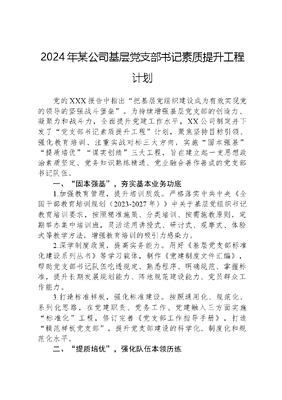 2024年某公司基层党支部书记素质提升工程计划党的XXX报告中指出把基层党组织建设成为有效实现党的领导的坚强战斗堡垒。为持续增强基层党支部的创造力、凝聚力和战斗力,全面提升党建工作水平,XX公司制定并下发了党支部书记素质提升工程计划,聚焦坚持目标引领、强化教育培训、注重实战对标三大方向,实施固本强基提质培优谋实创绩三大工程,旨在建立起一支思想政治素质坚定、党务知识熟练精通、党业融合善作善成的党支部书记队伍。一、固本强基,夯实基本业务功底1.加强教育管理,提升培训质效。严格落实中共中央《全国干部教育培训规划(2023-2027年)》中关于基层党组织书记教育培训要求,按照精准施策、分类培训、按需施教原则,定期举办集中培训班,灵活运用讲授式、研讨式、观摩式、体验式等教学方法,增强教育培训的吸引力感染力。2.深学制度政策,提高实务能力。用好《基层党支部标准化建设系列丛书》等学习载体,制作《党建制度文件汇编》,帮助党支部书记队伍吃透规定、熟悉程序、明确规范、掌握标准,提升长期发展规划能力、阵地规范建设能力、党员群众工作能力。3.打造标准样板,强化标准建设。按照通用化、规范化、系列化思路,在党建职责、党务工作、党建融入三方面实施标准化工程,修订完善《党支部工作指导手册》,打造模范样板党支部,提升党支部建设的科学化、制度化和规范化水平。二、提质培优,强化队伍本领历练4.常态考试检测,加强能力历练。组织开展基层党支部书记必知必会闭卷测验,充分利用党建分析例会等平台,做到逢会必培、逢会必考。增强试题的实用性,以工作中常见常用的党建业务知识与实务操作为重点,以考促用、以考墩行。5.开展业务比拼,引导争先创优。开展党支部书记学悟践大比武,以闭卷答题、现场答辩、模拟议事等形式,综合考察理论掌握程度、学习领悟能力、科学决策能力。6.强化文化育人,全面凝聚人心。提升党支部书记心理疏导、人文关怀、化解矛盾的能力,用好书记谈心谈话书记走进门等思政工作形式,提升党员、职工思想动态分析的针对性和时效性。主动关心关爱青年职工、困难职工,及时排解职工情绪问题,解决实际困难。三、谋实创绩,提升党建工作价值7.深化融合融入,迸发发展动能。加大党建+工程实施力度,邀请专家进行专项指导,围绕五个一选题立项法,进一步聚集各专业工作重难点,充分发挥党建优势,打造各支部品牌亮点。深化共产党员服务队、突击队、党员责任区、示范岗建设,以党员先锋模范作用带动生产经营价值提升。8.搭建展示平台,突出成果共享。持续开展一区一岗一队一日一工程创先争优活动,举办成果交流会和专题座谈会,打造支部书记说系列视频,邀请在各领域表现杰出的党支部书记分享思路经验、方法措施,以先进带后进,实现互帮互助、互促互进。9.强化联动党建,促进一体发展。打破专业壁垒,突出互通互融,开展党建知识联学、优质资源联享、党员队伍联建、实践活动联办。鼓励各党支部立足业务实际,跳出本系统看单位,与各机关事业党支部、社区党支部等进行联创共建,推动共同齐步登高。10.实施积分考评,强化激励导向。加大对党支部书记的考核力度,建立月检查、季考核、年评价机制,从基础党务、攻坚成效、品牌创建、培训成效等多维度进行评价,对党支部书记履责情况和工作成效进行公开化排名评价,进一步实现激励彰显先进、鞭策动员后进的目的。四、工作要求集团党委牵头抓总,抓好分类指导和专项督促检查,承担起督导指挥、汇总考核的职责。集团党委领导班子按照分片包干制度,加强对基层党支部活动开展情况的督导检查。各基层党支部要把开展活动列入基层党建总体工作部署,注意创新方式方法,灵活党员参与形式,结合实际制定切实可行的实施方案,务求活动实效。基层党组织书记是第一责任人,要亲自抓、负总责,找准切入点和落脚点,推动工作落地落实。各基层党支部每季度末报送工作总结。