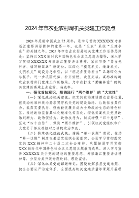 2024年市农业农村局机关党建工作要点2024年是新中国成立75周年,是学习贯彻XXXXXX考察浙江重要讲话精神的重要一年,也是三农系统三建争先的关键之年。2024年市农业农村局机关党建工作总体思路是:坚持以XXX新时代中国特色社会主义思想为指导,深入学习贯彻XXXXXX考察浙江重要讲话精神,紧扣市委勇当先行者、谱写新篇章新定位,以深化模范机关、清廉机关、文明机关建设为总牵引,以稻花香里话担当品牌深化为总抓手,进一步巩固优势、补齐短板、攻坚突破,高标准构建农业农村部门党建工作新格局,力争在打造勤廉并重的机关党建新高地上走在前、当表率。一、强化首位意识,熔铸践行两个维护的大党性(一)深化政治机关建设。把党的政治建设摆在首要位置,把政治标准和政治要求贯穿机关党的建设始终,让敢担当勇作为、抓落实重执行、强效能优服务成为全局政治生态的特色标签。推进政治监督具体化精准化常态化,深化提高机关党员政治判断力、政治领悟力、政治执行力,切实增强四个意识、坚定四个自信、做到两个维护,引领机关党组织和广大党员干部永葆绝对忠诚的政治本色。(二)持续强化理论武装。增强第一议题意识,推动第一议题制度在基层党组织全面落实。全面学习贯彻落实党的XXX精神和二十届二次全会精神,巩固拓展学习贯彻XXX新时代中国特色社会主义思想主题教育成果,深入学习宣传XXXXXX关于党的建设的重要思想、考察浙江重要讲话精神等,分层分类开展专题轮训、理论宣讲。(三)深化机关党建课题研究。围绕破解基层党建难题、健全全面从严治党体系、全面提高机关党建质量等课题开展理论学习和调查研究,9月前形成有分量、有价值的机关党建课题研究成果。开展机关党建创新案例、主题党日+、思想政治工作案例等征集展示活动。(四)严格落实意识形态工作责任制。守牢机关意识形态主阵地,抓好所属刊物、网站、两微等意识形态阵地的建设和管理。将解决思想问题与解决实际问题相结合,增强思想政治工作实效,每半年1次分析研判党员干部思想状况,做好一人一事思想政治工作。加强对党员干部特别是年轻干部的政治引领和思想引导,做好解疑释惑、舆论引导工作,精准开展主题宣传、形势政策宣传。二、强化基层基础,推动支部建设质量的大提升(五)严肃党内政治生活。严格执行《关于新形势下党内政治生活的若干准则》,认真落实三会一课、民主生活会和组织生活会、主题党日、民主评议党员和谈心谈话等制度,做到按程序决策、按规矩办事、按制度落实。提高主题党日质量,用好循迹溯源学思想示范点位线路,深化循迹溯源学思想促践行活动,进一步激发循迹溯源、感恩追随的内生动力。注重党员过政治生日、重温入党誓词、回顾入党初心等政治仪式,开展经常性党性体检、民主评议,对机关党员参加组织生活情况定期进行检查、通报,不断提高党内政治生活质效。(六)推进支部建设全面过硬。鲜明树立党的一切领导到支部的理念,深化新一轮模范党支部创建活动,不断扩大先进支部增量,提升中间支部水平。以育盆景建花园的思路实质性推进一支部一特色创建工作,推动每个在职党支部至少有一项差异化特色工作。选树先进支部工作法,通过三会一课观摩、五星级党支部书记论坛等形式展示交流,以赛马效应推动支部全面加强全面过硬。(七)加强基层党组织标准化规范化建设。以立标、对标、达标、创标的思路推进党支部标准化规范化建设,重新文可居文库——海量学习资料,手机电脑均可下载www.wenkeju.com制订《市农业农村局支部考核实施细则》,整体重构党支部年度考核评分办法,实现从定性到定量评价的转变。机关党委每月发送工作提示单,明确阶段性党建任务,制定下发《党内组织生活记录参考样式》,每季度全覆盖检查党内组织生活记录,认真做好党内统计、党费收缴管理使用和红色根脉强基系统应用数据更新维护工作。9月完成直属机关党委(机关纪委)换届选举工作,落实机构改革工作部署要求,稳妥有序做好党组织调整和党员组织关系管理等工作。三、强化融合互促,谱写党建护航中心的大文章(八)推动党建与业务工作互融双强。全面聚焦创新实干奋进年主题,纵深推进模范机关、清廉机关、文明机关建设争先行动,充分发挥机关党建的政治功能、组织优势和引领作用。紧紧围绕局党组实施六大工程、打造五彩农业四美乡村的要求,按照三农工作出题、党建工作破题的思路,主动把三农工作中的热点难点作为党建工作的切入点,强化岗位建功、实干争先,进一步探索党建带动干部全面履职、变革重塑、能力提升的有效办法,用三农工作业绩彰显党建工作价值。(九)深化拓展党建品牌建设。持续擦亮和深化拓展稻花香里话担当党建品牌,高质量推进一单位一品牌创建工作,督