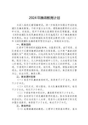 2024年廉政教育计划为深入推进反腐倡廉建设,进一步规范和加强全市消防救援队伍廉政教育,不断丰富方法内容,增强廉政教育的主动性、针对性、实效性,筑牢干部群众拒腐防变的思想根基。根据《消防救援队伍党风廉政建设工作实施意见》关于廉政教育的有关要求,结合《消防救援队伍思想政治教育大纲(试行)》和《消防救援队伍廉政教育暂行办法》,特制定本计划。一、教育目的认真学习贯彻党的XXX精神,全面落实局、省厅党委、总队党委关于反腐倡廉建设的重大决策部署,以开展廉政消防救援队伍建设为载体,以纯洁队伍风气和落实党风廉政建设责任制为着力点,紧紧围绕全市消防救援队伍政治工作总体思路,服务于防火、灭火和抢险救援中心工作,大力培育当代核心价值观,引导干部群众牢固树立马克思主义的世界观、人生观、价值观和正确的权力观、地位观、利益观,增强法制纪律观念,筑牢思想道德防线,提高拒腐防变能力,真正做到立警为公、执法为民、廉洁从警。二、教育课时安排(一)基层中队廉政教育时间,每季度不少于2次,每次不少于半天。(二)支队机关、培训基地、各大队廉政教育时间,每月不少于1次,每次不少于半天。(三)干部每年集中轮训中,廉政教育时间不少于1天。(四)各级领导干部是廉政教育的重点,除参加单位的教育活动外,还应当采取个人自学、党委中心组集体学习等方式加强自我教育,每季度不少于1次,每次不少于半天。三、教育内容(一)反腐倡廉理论教育。主要学习党的基本理论、基本路线、基本纲领、基本经验和国家的重大方针、政策,学习中国特色反腐倡廉理论体系,学习部党委关于反腐倡廉建设的重大理论观点、战略思想和决策部署,正确认识新时期反腐败斗争形势,增强反对腐败、战胜腐败的决心和信心。(二)理想信念教育。主要学习马克思主义世界观、人生观、价值观的基本内涵,学习社会发展史、中国现代史、中国革命史、中共党史等基本知识,坚信中国共产党的正确领导,坚定走中国特色社会主义道路的决心和信心。(三)执法为民教育。主要学习依法治国、依法行政的基本理论,学习社会主义法治理念的基本内容和部党委关于执法为民的基本要求,克服特权思想,增强群众观念,严格依法行使权力、履行职责。(四)法制纪律和道德规范教育。主要学习党纪条规、国家法律法规和队伍条令条例以及各项规章制度,增强遵纪守法的自觉性;学习公民道德规范、军人道德规范和消防救援队伍职业道德规范,树立和实践社会主义荣辱观。(五)廉洁从警教育。主要学习中央关于领导干部廉洁自律的有关规定,学习部党委关于廉洁从警的有关要求和《机关领导干部五个严禁》、《消防救援队伍四个严禁》等禁令,培养秉公执法、清正廉明的职业风范。其中,理想信念教育、执法为民教育列入思想政治教育计划,廉政教育计划不再重复安排。四、学习科目(一)支队机关,消防救援队伍大队、培训基地:一月份:《关于进一步加强当前队伍管理的紧急通知》、《部五条禁令》、《转发部消防救援队伍局纪委〈关于贯彻落实全国机关贯彻执行禁令电视电话会议精神的通知〉的通知》二月份:《部党委关于改进工作作风的十项规定》、总队《六个一律》文可居文库——海量学习资料,手机电脑均可下载www.wenkeju.com三月份:《全市消防救援队伍党风廉政建设工作实施意见》、《现役队伍领导机关和领导干部改进工作作风规定》、《全省消防救援队伍改进工作作风九项措施》四月份:《消防救援队伍支队加强和改进作风建设十二条措施》、《消防救援队伍支队队伍管理六条刚性措施》、《消防救援队伍四个严禁》、《部党风廉政建设责任制实施办法》、《队伍党风廉政建设责任制考核评价办法(试行)》七月份:《机关领导干部五个严禁》、《消防救援队伍总队督察队工作规定》、《消防救援队伍部门信访工作细则》、《消防救援队伍审计规定(试行)》八月份:《中国共产党纪律处分条例》、《军队贯彻执行〈中国共产党纪律处分条例〉的补充规定》、《全省机关领导干部反腐倡廉建设一岗双责实施办法》九月份:《中国共产党党员领导干部廉洁从政若干准则》《〈中国共产党党员领导干部廉洁从政若干准则》实施办法》、《关于加强消防救援队伍监督执法廉政建设的若干规定(试行)》十月份:《消防救援队伍廉政教育暂行办法》十一月份:《消防救援队伍预防犯罪工作规定》、《甘肃省消防救援队伍招投标工作监督管理暂行规定》、《甘肃省消防救援队伍干部人事工作监督暂行办法》。十二月份:《机关消防救援队伍机构工作人员执法过错责任追究规定》、《消防救援队伍机构内部执法监督工作暂行规定》、《甘肃省消防救援队伍廉政谈话和函询实施办法(试行)》。(二)基层中队各基层中队廉政教育内容由各消防救援队伍大队根据基层中队廉政教育课时安排,结合支队廉政教育计划和各大队工作实际,统一自行安排。五、几点要求文可居文库——海量学习资料,手机电脑均可下载www.wenkeju
