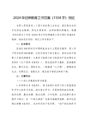 2024年纪律教育工作方案(1558字)党纪为深入贯彻落实二十届中央纪委三次全会、省纪委全会和市纪委全会精神,深化自我革命,全面加强纪律建设,根据《市纪委关于印发《2024年全市纪律教育工作方案》的通知》精神,结合我办实际,制定工作方案如下。一、总体要求坚持以XXX新时代中国特色社会主义思想为指导,深入学习贯彻党的XXX精神,以党员领导干部为重点,面向全体干部职工开展纪律教育,认真学习新修订的《中国共产党纪律处分条例》(以下简称《条例》),深化党纪学习教育,坚持教育在先、警示在先、预防在先,一体推进三不腐,增强政治定力、纪律定力、道德定力,做忠诚干净担当的好干部。二、主要内容(一)深入开展党纪学习教育。1.多种形式学《条例》。将《条例》的学习列入党组理论学习中心组学习内容,进行重点学习,并紧扣党的政治纪律、组织纪律、廉洁纪律、群众纪律、工作纪律、生活纪律开展专题学习研讨。在干部大讲堂安排专题辅导授课,请市纪委同志讲解《条例》。充分利用共产党员网、省干部在线学习中心等平台,学习《条例》解读,加深对《条例》的理解和认识。结合支部主题党日和党支部三会一课,组织全体党员认真学习《条例》。2.强化党规党纪教育。将党规党纪列入党组理论学习中心组学习内容,重点加强对关键少数的教育,通过集体学习和个人自学相结合的方式,交流学习体会,教育引导干部职工增强纪律意识、规矩意识,做到公正用权、依法用权、为民用权、廉洁用权。3.纪律教育进支部主题党日。将省纪律教育精品课程视频、《职务犯罪101个罪名解读读本》和市纪律教育双七课程纳入支部学习内容,进行集中学习,支部书记、纪检委员结合本系统典型案例讲解纪律教育专题党课。4.开展廉政谈话。对行政审批、工程建设、执法监督、干部人事、财务管理等关键岗位干部及负责人开展全覆盖一对一廉政谈话,组织全体干部职工开展全覆盖廉政风险自查,预防风险发生。5.组织纪法知识测试。结合领导干部应知应会党内法规和应掌握的《条例》内容,在全体干部职工中开展纪法知识普测普考。党纪学习教育安排在4月到7月期间进行,集中教育学习文可居文库——海量学习资料,手机电脑均可下载www.wenkeju.com时间不少于3天。(二)深入开展警示教育6.召开警示教育大会。集中观看警示教育片,深刻剖析违纪典型案例,党组书记讲廉政党课,开展严守政治纪律和政治规矩培训。7.拓展警示教育形式。通过阅读教育读本、参观警示教育基地、旁听职务犯罪案件庭审等形式,深化以案说法、以案说纪,让干部职工知戒惧、存敬畏、守底线。8.认真查摆问题。查摆学习贯彻《条例》情况中存在的问题,深入剖析问题存在的原因,明确整改方向和措施。以上查摆在2024年度民主生活会、组织生活会中进行。(三)深入开展廉洁文化建设9.加强家庭家教家风建设。通过组织清廉家庭主题活动,教育引导干部职工及其家属增强家庭助廉意识,提高拒腐防变能力。10.发挥廉洁文化教育作用。依托廉洁文化教育基地、廉政长廊等廉洁教育阵地,组织干部职工开展纪律教育主题活动。与寒溪社区、新湾村等共建廉洁文化阵地,弘扬清廉文化,营造积极健康、干事创业的政治生态和良好环境。三、工作要求文可居文库——海量学习资料,手机电脑均可下载www.wenkeju.com(一)抓好组织落实。把开展纪律教育作为落实全面从严治党主体责任的重要抓手,成立纪律教育工作领导小组,党组承担起主体责任,党组书记担负起第一责任人责任,班子成员落实一岗双责,周密部署安排,加强督促推动,层层压实责任。(二)注重活动效果。用好用活廉政资源,创新活动载体,开展多种形式的纪律教育活动,充分调动干部职工参加教育学习的积极性。注重采取线上线下相结合的办法,依托新媒体平台,宣传我办纪律教育成果,营造浓厚氛围。切实把纪律教育学习成果转化为工作动力和实绩实效,在练好内功中实现争先进位。(三)总结特色做法。注重学思用贯通,细化工作举措,及时总结工作特色做法,积极报送先进事迹和优秀典型。文可居文库——海量学习资料,手机电脑均可下载www.wenkeju.com