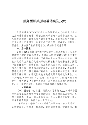服务型机关创建活动实施方案为贯彻落实XXXXXX在中央和国家机关党的建设工作会议上的重要讲话精神,根据上级关于创建让党中央放心、让人民群众满意的模范机关的部署要求,结合支队机关实际,经支队机关党委研究,决定开展学习型、实战型、创新型、服务型、廉洁型机关创建活动,提出如下实施意见。一、总体要求坚持以XXX新时代中国特色社会主义思想为指导,认真贯彻新时代党的建设总要求,持续深入学习XXXXXX系列重要讲话精神和授旗训词精神,坚决落实中央和国家机关工委、部机关党委及上级机关党委关于创建模范机关的部署安排,按照提质强能年总体要求,立足支队机关实际,坚持以上率下、以机关带队伍,坚持以创建促发展、以创建促转型,不断提升理论武装水平、强化实战打赢能力、加快改革创新发展、筑牢廉洁自律防线,永葆支队机关首先是政治机关的政治属性,进一步增强四个意识,坚定四个自信,做到两个维护,努力建设让党中央放心、让人民群众满意的模范机关,让上级党委信任、各级队伍信服的领导指挥机关。二、主要措施(一)创建学习型机关。把深入学习贯彻XXX新时代中国特色社会主义思想作为首要政治任务,按照政治上高标准、思想上高境界、能力上高水平的目标,大力加强学习教育,着力在学懂弄通做实、知信行合一上下功夫。1.学习内容。①学习XXX新时代中国特色社会主义思想,坚持读原文、学原著、悟原理,做到融会贯通、学以致用。②反复学习XXXXXX重要训词精神,深刻领会丰富内涵和核心要义;深入学习XXXXXX关于应急管理、安全生产、防灾减灾救灾工作重要论述,不断提升防范化解重大安全风险的能力水平。③学习党史、新中国史和消防史,做到知史爱党、知史爱国、知史爱队。④学习党章党规党纪,严格遵守执行党的各项规章制度规矩,紧绷纪律规矩这根弦。⑤学习了解形势政策,学习党中央、国务院和部党委、部局党委以及总队、支队党委的决策部署,坚定正确方向,坚决贯彻执行。⑥学习新条令纲要,以及掌握做好工作、履行职责所必备的各种知识,增强xx工作的科学性、预见性,争当岗位的行家里手。2.学习形式。用好第一议题学习、党委集中学习和党课学习等载体,开展系统深入的基础性学习,做到入脑入心、走实走深;跟进学习XXXXXX最新重要讲话和上级有关部署要求,自觉用新理论武装头脑;组织开展好书共分享主题读书活动,每季度开展读书会活动,积极营造读好书、好读书的浓厚学习氛围;机关党员干部按月列出学习计划开展个人自学,并结合个人思想和工作实际,开展讨论研究,深化认识、解决实际问题;充分利用红色教育资源,积极开展参观见学,在学习中重温革命历史,接受红色教育洗礼。3.学习检查考核。各支部书记要及时对学习情况进行点评总结,督促落实学习任务,提出针对性要求;机关党委定期调阅各支部和党员的学习记录,检查规定动作落实情况;不定期随机抽取党员开展应知应会测试,做到全员覆盖;采取随机访谈的形式,通过谈体会、谈收获,检验学习成效;建立述学制度,组织各支部在年底与述职述廉同步开展述学评学,并将学习情况作为评优评先的参考依据。(二)创建实战型机关。着眼全灾种、大应急任务需求,立足应急救援主力军、国家队职能定位,按照黄明书记提出的时刻以准备好了吗叩问自己,强化战备意识,锤炼过硬本领,不断规范机关执勤、训练、工作秩序,提升机关实战文可居文库——海量学习资料,手机电脑均可下载www.wenkeju.com能力。(三)创建创新型机关。着眼推动全市xx工作和队伍建设转型升级、快速发展,聚焦破解xx工作和队伍建设中的难点、堵点,在支队机关大力倡导创新之风,不断创新发展思路、创新工作机制。1.开展调查研究。对照总队确定的重点调研课题,结合实际开展调查研究,把眼睛和耳朵延伸到最基层,切实掌握第一手资料。每个党支部至少确定1-2个调研方向,找准问题症结,把握规律特点,研究对策措施,于11月底前上报调研成果报告,机关党委视情组织开展成果交流会和优秀调研成果评选。2.吸收先进做法。立足新形势、新任务、新挑战,注重培养机关指战员的创新观念、创新思维和创新意识,积极学习研究外省总队和其他兄弟支队在应急救援、战勤保障、装备建设、监督管理、信息化建设等各方面的优势特长,结合玉溪实际充分消化借鉴,不断为玉溪xx事业发展提出新思路,推出新举措,创出新亮点,不断推动本岗位工作创新发展。(四)创建服务型机关。突出抓好机关作风建设,教育引导机关党员由领导指挥向服务指导转变,确保一切为了基层、一切保障一线、一切围绕实战工作理念落实落地。三、有关要求(一)统一思想认识,提高政治站位。开展四型机关创建活动,是贯彻落实XXXXXX在中央和国家机关党的建设工作会议上的重要讲话精神,建设让党中央放心、让人民群众满意的模范机关的重要举措,是推动