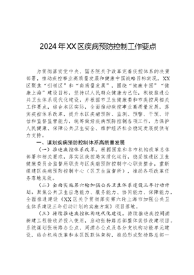 2024年XX区疾病预防控制工作要点为贯彻落实党中央、国务院关于改革完善疾控体系的决策部署,推动疾控事业高质量发展和健康中国战略目标实现,XX区聚焦引领区和高质量发展,围绕健康中国健康上海建设目标,坚持以人民群众健康为己任,积极推进公共卫生体系现代化建设,并根据市卫生健康委和市疾控局相关工作要点,结合本区实际,全面推动疾控事业高质量发展,落实疾控体系改革,提升本区疾病预防、监测、预警、干预、评估和监督监管能力,统筹做好疾病预防控制各项工作,为保护人民健康、保障公共卫生安全、维护经济社会稳定发展提供有力支持。一、谋划疾病预防控制体系高质量发展(一)推进疾控体系改革。根据国家和本市机构改革总体部署和相关要求,落实区疾控局实质化运行,稳妥推进区卫生健康委员会监督所职责与区疾病预防控制中心职责整合,重新组建区疾病预防控制中心(区卫生监督所),推动各项改革任务落地见效。(二)全面实施第六轮加强公共卫生体系建设三年行动计划。聚焦公共卫生应急能力、服务能力、协同能力、保障能力,全面推进建设《XX区关于贯彻落实第六轮上海市加强公共卫生体系建设三年行动计划的实施方案》项目落地。(三)持续推进疾控机构现代化建设。持续推进疾控周浦新建工程验收并投入使用,启动张杨路总部整体装修改建项目。系统谋划张杨路办公点、周浦办公点及各分支机构功能单元建设,结合机构改革和本区医联体架构,推动形成张杨路总部-周浦检验检测中心-若干分支机构的网格化布局,提升辖区疾病预防控制能力与应急响应速度。(四)平稳做好疾控中心实验室搬迁工作,强化实验室及能力建设。建立实验室生物安全管理体系。聚焦传染病监测预警和应急处置,建立医联体前置实验室,加强同质化建设,搭建数据高铁。构建医防协同区域网络实验室,及时共享有效数据信息。启动区域生物样本库建设,建立生物样本库标准化管理体系,提升疾控中心病原微生物检测实验室病原体快速检测及溯源能力。(五)稳步推进医疗机构疾控专员制度建设。征集各级各类医疗机构典型案例汇编,完成医疗机构传染病防控共性问题专题研究。细化《医疗机构传染病防控责任清单》,梳理医疗机构职责与实操流程、规范,落实医疗机构传染病防控主体责任。(六)提升公共卫生队伍能力。厘清辖区内专业机构、二三级医疗机构、社区卫生服务中心从事公共卫生工作人员基础信息的基础上,分类施策,持续推进人才队伍培养。通过高端人才引进、核心骨干扩容、基层网底强化等一系列举措,打造一支拉得出、打得响,高素质、高水平、专业化的公共卫生专业队伍。二、稳步提升传染病综合防控能力(一)全面增强本区传染病监测预警能力。在完成本市新冠、流感、呼吸道感染综合监测、霍乱、肠道等各类传染病监测哨点基础上,系统开展辖区传染病监测预警,扩容布局监测哨点、规范监测内容与要求,设置区域传染病监测网络实验室,平急结合优化传染病监测预警,定期开展辖区疫情风险评估,为疫情防控工作提供强有力的技术支撑。(二)加强重点传染病的分析研判与防控。动态跟踪国内外和本市重点传染病发生发展,以多病共防、多危共管策略开展防控工作。重点关注流感、新冠、猴痘、百日咳、艾滋病、文可居文库——海量学习资料,手机电脑均可下载www.wenkeju.com肺结核等热点疾病和重大疾病,及时开展有关舆情监测和风险研判。(三)不断提升传染病应急处置水平。优化联防联控机制,加强区-社区两级传染病应急队伍的标准化建设;开展《XX区突发公共卫生事件应急预案》等新一轮应急预案、应急指挥、应急处置流程等修订完善,结合不同季节和重大活动防病保障工作需求,定期组织应急队伍培训与演练,提升实战技能储备。(四)探索慢性传染病综合防控。卫生部门、街镇社区联防联控、协同推进,疾控专业机构、定点医院医疗机构以及社区卫生服务中心医防融合各司其职试点开展慢性传染病综合防治示范社区、艾滋病综合防治示范区、无结核社区创建,提升试点社区居民慢性传染病防控核心知识知晓率,加强重点人群筛查,提高慢性传染病随访管理质量,降低疾病传播风险,逐步实现终止慢性传染病流行的目标。三、不断加强慢性非传染性疾病防治(一)发挥慢病健康管理支持中心作用,强化慢病管理效能。完成支持中心应用、标准化监测技术视频的制作和推广,年内力争辖区各社区慢病健康管理支持中心全部完成市级验收。规范开展慢性病综合危险因素精准化采集和早发现监测,提升慢性病患者规范管理率,强化慢性病患者随访管理真实性质控。(二)持续开展慢性病综合防控示范区建设。不断总结慢性病综合防控工作经验,收集相关委办局、各街镇及医疗卫生单位典型案例,形成可复制可推广的工作经验。创新健康科普形式与载体,倡导健康生活方式、传递健康理念,稳步提高辖区居民健康素养水平。完成国家慢性病综合防控示范区复评审。四、统筹抓好卫生与免疫规划工作(一)落实五大卫