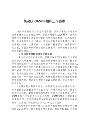 某高校2024年组织工作要点2024年学校组织工作总体思路是:坚持以XXX新时代中国特色社会主义思想为指导,全面贯彻党的XXX精神,深入落实新时代党的建设总要求和新时代党的组织路线,认真落实全国、全省组织部长会议精神,坚持和加强党的全面领导,深入推进凝心铸魂、选贤任能、人才赋能、强基固本、先锋引领五大工程,全面提升新形势下组织工作水平,为学校转型发展提供坚强的组织保证。一、坚持用党的科学理论武装头脑1.突出抓好党的政治建设。坚持不懈用XXX新时代中国特色社会主义思想凝心铸魂,把党的政治建设摆在首位,教育引导各级党组织和广大党员深刻领悟两个确立的决定性意义,切实扛稳两个维护的重大政治责任。严格落实民主集中制,修订完善《X学院二级学院党政联席会议议事规则》和《X学院二级学院党组织会议议事规则》,确保科学决策、民主决策、依法决策。严明党的政治纪律,持续强化党员干部政治忠诚教育和纪律教育,推动提升党员干部政治判断力、政治领悟力、政治执行力。2.巩固拓展主题教育成效。持续深化党的创新理论武装,以巩固拓展主题教育和三抓三促行动成果为抓手,健全常态化学习机制,督促各级党组织和广大党员干部系统深入学习XXX新时代中国特色社会主义思想、XXXXXX关于党的建设的重要思想,及时跟进学习XXXXXX系列最新重要讲话精神,推动广大党员干部在深化、内化、转化上下功夫。3.强化党员干部教育培训。组织实施党的创新理论学习教育培训,按照省一级干部教育培训要求,制定学校2024年干部教育培训规划,采取线上+线下方式,重点抓好党的XXX、二十届历次全会精神培训工作,持续推动党的创新理论进教材、进课堂、进头脑。充分发挥学习强国甘肃党建平台作用,利用红色南梁区位优势,引导党员干部把个人自学和组织培训、线上教育结合起来,切实提高教育培训的针对性和实效性。二、全面增强基层党组织政治功能和组织功能4.抓实党支部标准化规范化建设。切实加强对基层党组织工作的监督指导,深入推进四抓两整治,紧紧围绕增强基层党组织政治功能和组织功能,认真在学标用标、支部工作规范、提升党组织组织力、典型引路示范带动上下足功夫,持续推进高校党建对标争先创建工作,加大样板院系和标杆支部的建设力度,努力提高党支部建设质量。5.推进党建与业务工作深度融合。全面聚焦学校重大项目建设、冲刺申硕、教学科研、高层次人才引进等重点工作,推进效能提升党建融合行动,以党建和学科建设双带头人培育为切入点,狠抓教师党支部双带头培育工程。将培育创新党建品牌作为基层党建+业务工作核心,依托自身特色资源,实施党建品牌建设年活动,制定《X学院党建品牌创建实施方案》,积极凝练培育创建1+2党建品牌示范党组织,初步形成一批拿得出、叫得响、立得住的陇院特色党建品牌,做到以品牌推动党建、以党建引领发展、以发展带动全局。6.做好党员发展及教育管理工作。坚持把政治标准放在首位,认真落实发展党员政治审查和预审联审制度,做好在优秀骨干教师、学科带头人等高层次人才中发展党员工作,不断吸收新鲜血液,建强党员队伍。强化相关党员教育管理与思想引导,建立党员档案组织部+基层党组织+党支部书记责任落实体系机制,健全流动党员管理制度,以党员示范岗等形式,激活党员能动性,激励党员发挥先锋模范作用。文可居文库——海量学习资料,手机电脑均可下载www.wenkeju.com7.推进党建信息化落实落细。充分发挥甘肃党建学习强国信息化平台作用,认真抓好督办提醒责任落实,发挥好信息平台综合效应,以基层党建信息化推动党支部建设标准化。及时完善维护全国党员信息管理系统、党内信息统计等各类信息,提高数据信息分析和运用能力。8.夯实基层党建工作保障。充分发挥党建指导员作用,开展基层党组织书记和党务工作者专题培训,着力解决基层党建工作者能力不足、本领恐慌的问题,确保党建工作始终有人抓、有人管。强化党费收缴、使用和管理,健全专人管、足额收,及时缴、定期查的工作机制。健全党内关怀帮扶机制,加大对困难党员、老党员、老干部的关心关爱力度,做好走访慰问暖心工程,不断提升党员干部自豪感与幸福感。三、着力建设高素质干部队伍和人才队伍9.持续规范干部选任工作。坚决贯彻省委组织部相关政策规范,严格把控干部选拔动议、民主推荐、考察等各个环节,确保选任工作的科学性和公正性。深入开展学校处级内设机构和科室设置工作调研,制定《X学院处科级机构定岗定编方案》,结合岗位空缺情况和调研研判结果,合理提出岗位人选动议和配备建议,着力优化领导班子和干部队伍结构,不断提升整体效能。10.加强干部日常管理监督。综合运用巡视巡察、经济责任审计等成果,发现苗头性问题及时批评教育,严格干部因私请假、因公外出、婚丧喜庆等个人事项报备审查