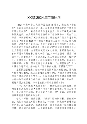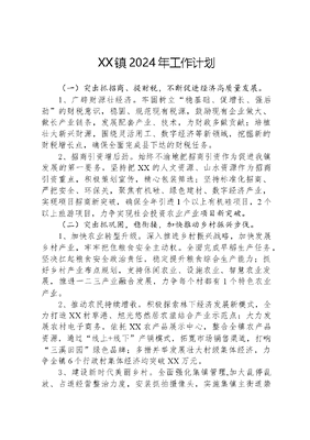 XX镇2024年工作计划(一)突出抓招商、提财税,不断促进经济高质量发展。1、广辟财源壮经济。牢固树立稳基础、促增长、强后劲的财税意识,稳固、规范现有税源,鼓励现有企业做大、做长产业链条,发展配套产业、技术,为财政多做贡献;培植壮大新兴财源,围绕灵活用工、数字经济等新领域,挖掘新的财税增长点,确保全面完成县下达的财税任务。2、招商引资增后劲。始终不渝地把招商引资作为促进我镇发展的第一要务,坚持把XX的人文资源、山水资源作为招商引资重点,积极策划宣传,精心包装筛选;坚持标准化招商、严把安全、环保关,聚焦有机硅、绿色建材、数字经济产业,实现项目招商新突破,确保全年引进1个以上有机硅项目,2个以上旅游项目,力争实现社会投资农业产业项目新突破。(二)突出抓巩固,稳衔接,加快推动乡村振兴步伐。1、加快农业转型升级。深入推进乡村振兴战略,加快发展乡村产业,牢牢把住粮食安全主动权。全面完成早稻生产任务,坚决扛起粮食安全政治责任,稳定提升粮食综合生产能力;抓好乡村产业布点规划,支持休闲农业、设施农业、智慧农业发展,推进一二三产业融合发展,力争每个村都有1个特色农业产业。2、推动农民持续增收。积极探索林下经济发展新模式,全力打造XX村草港、旭光悠然居农旅结合产业示范点;大力发展农村电子商务,依托XX农产品展示中心,整合全镇农产品资源,通过线上+线下产销模式,拓宽市场销售渠道,打响三溪田园绿色品牌;多措并举发展壮大村级集体经济,力争全镇6个行政村集体经济均突破XX万元。3、建设新时代美丽乡村。全面强化集镇管理,加大乱停乱放、占道经营整治力度,安装抓拍摄像头,实施集镇主街道禁止停车工作,让集镇更加有序、整洁;加大集镇农贸市场改造提升力度,合理空间布局,完善配套设施,彻底整治市场脏乱差现象;深化城乡综合环境整治,持续开展新农村建设,重点提升道路沿线、景区沿线村组的建设品位,因地制宜建成一批农村人居环境示范村;管理运行好集镇污水处理设施,强化城乡环卫一体化监督考核,不断深化农村人居环境管护长效机制;深入推进移风易俗,强化不良社会风气治理,倡导新时代文明新风。(三)突出抓民生、办实事,更全领域发展民生事业。1、全面强化民生保障,增强群众获得感。开展潘坊至刘家窝(横山村)约10公里的"四好路"建设;对横山村中田组等7条道路进行生命安防护栏安装建设;对横山村11个小型集中供水点的其中9个进行升级维护改造;申请移民项目对安置点进行改造,并对剩下的山塘水利设施维修。2、协调做优公共服务,增强群众幸福感。继续做好食品安全知识宣传及监督检查工作;深化文明创建,多种形式开展新时代文明实践系列志愿服务活动,培育文明新风;开展校园周边环境整治工作,优化教学环境,努力提升中、小学基础教育教学质量;扎实推进全民参保和全民医保工作,不断夯实社会保障基础;不断完善社会救助和社会福利体系,认真做好拥军优抚、慈善、残疾人事业等社会保障工作,切实保障困难群众的基本生活。3、夯实平安XX建设,增强群众安全感。完善信访矛盾纠纷多元预防调处化解综合机制,持续攻坚积案化解,严格落实信访工作重点管理制度,强化矛盾多发易发领域分析研判,推动信访总量有效下降;深入推进平安XX建设,严厉打击各类违法犯罪行为;筑牢安全生产防线,全面落实安全管理责任,坚持安全生产与社会发展、社会稳定等工作同部署、同推进。(四)突出抓引领、重实效,全面加强五型政府建设坚持以政治建设为统领,践行初心使命,忠诚履职尽责,持续改作风、转职能、提效能,全力打造五型政府;坚持依法行政,把法治精神和要求贯穿政府工作全过程、各领域;大力弘扬马上就办、真抓实干的优良作风,认真落实上级各项工作部署要求,时刻倾听人民群众的诉求与心声,做更多便民利民的实事、好事,让XX人民有更多的幸福感;认真抓好党风廉政建设工作,严格履行一岗双责,加强行政监察,强化对重点领域和关键环节的监督制约,厉行勤俭节约,反对铺张浪费,严控三公经费支出,把有限的财力用于发展经济、保障民生。