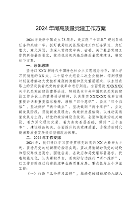 2024年局高质量党建工作方案2024年是新中国成立75周年,是实现十四五规划目标任务的关键一年。抓好我局机关基层党建工作任务紧迫、责任重大、意义深远。为深入贯彻党中央、省委、关于基层党建工作的新部署新要求,推动我局机关基层高质量党建建设,制定如下方案。一、总体思路坚持以XXX新时代中国特色社会主义思想为指导,深入学习贯彻党的XX大、二十届中央纪委二次全会精神,深刻领悟时刻保持解决大党独有难题的清醒和坚定重要要求,以永远在路上的坚定执着把党的自我革命进行到底。全面贯彻XXXXXX关于机关党的建设重要论述、特别是在中央和国家机关党的建设工作会议上的重要讲话精神,认真落实XXXXXX视察吉林重要讲话和重要指示精神,增强四个意识、坚定四个自信、坚决拥护两个确立、坚决做到两个维护,立足新发展阶段,贯彻新发展理念,构建新发展格局,以推动高质量发展为主题,以党的政治建设为统领,全面加强政治机关建设、着力深化理论武装、着力夯实基层基础,做好三个表率,建设模范机关,全面提升机关党建质量,为推动新时代能源高质量发展提供坚强政治保障。二、2024年工作安排2024年,我们将以学习宣传贯彻党的党的XX大精神为主线,坚持用党的创新理论指导实践,坚决贯彻新时代党的建设和组织路线总要求,围绕省委、省政府和局党组部署要求,找准职能定位,认真履职尽责,用实际行动践行两个维护,以工作实效推动我省能源事业高质量发展。重点抓好五个方面工作:(一)打造三个学习品牌,推动党的创新理论入脑入心坚持在学懂弄通做实XXX新时代中国特色社会主义思想上下功夫,强化政治引领,突出政治机关意识教育,引导系统党员干部坚决捍卫两个确立,坚决做到两个维护。重点抓好三个群体,打造三个学习品牌:一是抓龙头,打造政治品牌。发挥党组理论学习中心组示范引领作用,认真落实第一议题制度,总结经验亮点、推广先进典型,着力打造思想理论学习政治品牌,为系统各级党组织和党员干部树标杆、做表率。紧围绕学习宣传贯彻党的XX大精神这一主线,全面学习宣传贯彻党的XX大精神,掀起学习培训、宣讲活动和舆论宣传热潮。与做好全局意识形态工作紧密结合起来,坚持马克思主义在意识形态领域的指导地位,落实意识形态工作责任制,严格领导干部出版讲学活动管理,坚守网络等意识形态前沿阵地。认真开好2022年度组织生活会和开展民主评议党员,进一步对表对标,找准问题、纠正偏差,深入推进党的XX大精神落地落实。二是抓关键少数,打造支部书记讲党课特色品牌。发挥各党组织书记领头雁作用,激励支部书记带头学习党的创新理论,带头知行合一,围绕学习贯彻党的XX大精神,聚焦能源工作,7月1日前后,精心打磨一批支部书记精品党课,不断深化转化学习成果。三是抓青年群体,围绕党的XX大,开展各类品牌活动。积极参加省直机关工委组织的各类知识竞赛、主题征文,以及理论骨干秘书培训活动,持续做好铸魂赋能工作,鼓励青年干部创新理论学习的思路、途径、载体和形式,依托新时代e支部、吉林机关党建网、学习强国等平台加强理论学习,打造一批有特色、见成效的青年理论学习品牌,做好年轻干部的培养工作。扎实有效开展思想政治工作,及时了解掌握、分析全局党员干部思想动态和工作表现,有针对性地给予鼓励鞭策、提醒帮助。领导班子成员、支部书记要经常、主动同党员干部特别是年轻党员干部谈心谈话,尤其是要把握岗位变动、组织处理、发生家庭变故、发现苗头性问题等重要节点开展谈心谈话,坦诚相见、交流思想,既严格要求又关心关爱,把解决思想问题与解决实际困难结合起来,做到思想上解惑、精神上解忧、心理上解压、生活上解难,充分调动党员干部的积极性。适时组织集体观影活动,集中观看红色题材和爱国主义为主题的主旋律影片,进一步铭记历史、传承革命精神,汲取奋发图强、砥砺奋进的强大力量。(二)实施三项提升工程,推动基层战斗堡垒建实建强坚持在增强基层党组织政治功能和组织功能上下功夫,巩固星级达标取得成果,树立大抓基层鲜明导向,打牢基层党组织建设,推动机关党的建设高质量发展。重点实施三项提升工程:一是实施提质增效工程。着眼于解决基层党组织软弱涣散突出问题,以建设思想引领力强、安全保障力强、工作落实力强、组织凝聚力强的四强党支部为目标,以支部标准化规范化建设为抓手,持续推进质量提升工程,落实三会一课制度,在抓好干什么的基础上,重点解决干得怎么样的问题,切实提高各项制度执行力和标准化水平,选出典型、推出先进,评选一批优秀基层党支部。二是实施提亮增色工程。着眼于解决党建业务两张皮问题,以一支部一品牌党建品牌创建工作为抓手,找准结合点、发力点,充分发挥支部联系点的带动作用,推动党建业务真融合,实现党建强、业务强双强目标。通过典型引路、示