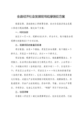 全县经济社会发展现场观摩镇街方案根据县委、县政府的工作部署安排,拟对全县经济社会发展工作进行现场观摩,制定如下方案:一、时间安排拟定于×月×日,观摩时间1天半,开会半天。每个镇街全程观摩时间控制在1个小时以内。二、观摩项目的数量及标准项目数量:全县×个镇街、开发区参与观摩。每个镇街×个停车点,开发区×个停车点,共计××个停车点。项目标准:观摩项目以工业项目为主,镇街兼顾服务业、乡村振兴、农业项目或以镇街为主的民生项目。其中,工业项目一个、乡村振兴项目(含衔接片区、美丽乡村)一个、自选项目一个;开发区工业项目×个。项目应为×××年以来的新建项目(含改扩建、技改项目),已完工或基本完工,对经济发展有重大引领性、对重大产业链有强链补链延链作用,规模体量大、形象进度好,符合产业政策规划、符合环保、节能、安全生产等要求、手续齐全。过去已交流项目、两高项目不参加交流。三、项目评审各镇街(开发区)确定拟观摩项目后,组织县发改局、行政审批局、生态环境局、应急管理局、住建局、招商服务中心、自然资源和规划局、行政执法局等,根据各自职能对拟观摩项目进行初审,对不符合要求的项目要求镇街重新上报。初审后,县督查考核服务中心组织县生态环境局、应急管理局、自然资源和规划局进行现场实地审核,最终确定观摩项目。四、观摩方式参加观摩的同志统一乘车,进行现场观摩。观摩使用导播车介绍情况。停车点由各镇街党政班子成员汇报情况。五、现场评议全部观摩完成后,根据观摩情况,对项目进行评议,××个项目的评议成绩为各镇街(开发区)现场交流成绩,并根据项目得分评出10个好项目。现场评议通过手机APP进行,与会人员微信扫码登陆评议网页,对观摩项目进行实名线上评议。(一)计分方法一:评议票分A、B两种票,县级领导为A票,其他人员为B票,A票分值占60%,B票分值占40%。项目评议分好、较好、一般、不了解4个选项,分别对应100分、80分、60分、不计分,其中好不超过项目总数的30%(13个)。各镇街(开发区)3个项目的平均得分为现场观摩成绩,根据项目得分评出10个好项目。(二)计分方法二:评议票分A、B两种票,县级领导为A票,其他人员为B票,A票分值占60%,B票分值占40%。与会人员对镇街(开发区)进行从1到15进行不重复排序,第1名得15分,第2名得14分,依次类推与会人员的平均分为该镇的观摩成绩得分。同时评出十佳优质好项目。会前发放项目简介以及镇街评议票草表和十佳优质好项目评议票草表,结束后采取电子投票。县委办督查室会同纪委监委机关、县府办督查室、督查考核服务中心等部门单位汇总计票成绩在会上宣布。六、主要议程会议分两个阶段进行,第一阶段:观摩评比镇街。第二阶段:集中开会。会议地点:会议拟请×××主持。共有三项议程。1.×××通报镇街现场观摩排名及十佳优质好项目名单2.表态发言(共计2个)现场观摩会第1名和最后1名党委书记发言;3.×××讲话。七、与会人员(一)参加现场观摩人员1、县级领导班子成员和副县级以上干部。2、县直部门主要负责人。县委办、县府办、发改局、科技局工信局、财政局、自然资源和规划局、住建局、交通局、农业农村局、商务局、应急管理局、统计局、生态环境局、水利局、文化和旅游局、市场监管局、综合执法局、扶贫办、招商服务中心3、各镇街(开发区)党政主要负责人。(二)参加集合会议人员1、参加观摩的全体人员。2、县直各部委办局、人民团体、科级以上事业单位、市以上直属单位主要负责人(81)。八、结果运用全县经济社会发展现场观摩会成绩纳入年度全县经济社会发展综合考核对镇街千分制考核中,具体考核分数见考核办法。九、工作纪律现场观摩坚持实事求是,反对形式主义,不得临时包装打造交流项目,不得刻意准备现场,不得刻意整修路线环境,交流期间严禁封路和警车开道,各镇街(开发区)车辆不得随行;交流现场不得摆放花草、插放旗帜、悬挂标语气球、铺设地毯,不得临时设置LED大屏幕、彩虹门,不得临时设置大型展板,不得临时搭建卫生间等设施;展示产品须放入展柜或设置隔离展区;严禁向交流人员递送任何物品。