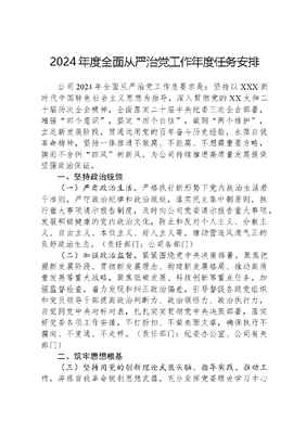 2024年度全面从严治党工作年度任务安排公司2024年全面从严治党工作总要求是:坚持以XXX新时代中国特色社会主义思想为指导,深入贯彻党的XX大和二十届历次全会精神,全面落实二十届中央纪委三次全会部署,增强四个意识,坚定四个自信,做到两个维护,立足新发展阶段,贯通运用党的百年奋斗历史经验,永葆自我革命精神,坚持一体推进不敢腐、不能腐、不想腐重要方略,锲而不舍纠四风树新风,为公司持续推进高质量发展提供坚强政治保证。一、坚持政治统领(一)严肃政治生活。严格执行新形势下党内政治生活若干准则,严守政治纪律和政治规矩,落实民主集中制原则,执行重大事项请示报告制度,及时向公司党委请示报告重大事项,发展积极健康的党内政治文化,防止和反对个人主义、分散主义、自由主义、本位主义、好人主义等,推动营造风清气正的良好政治生态。(责任部门:公司各部门)(二)加强政治监督。紧紧围绕党中央决策部署,聚焦把握新发展阶段、贯彻新发展理念、构建新发展格局、推动高质量发展等重大战略,聚焦低碳发展、科技创新等重点任务,加强监督检查,着力发现和纠正政治偏差,引导督促各级党组织和党员领导干部提高政治判断力、政治领悟力、政治执行力,自觉同党中央对标对表,扎扎实实贯彻党中央决策部署,落实好党委各项工作安排,不打折扣、不做表面文章,确保执行不偏向、不变通、不走样。(责任部门:纪委办公室、公司有关部门)二、筑牢思想根基(三)坚持用党的创新理论武装头脑、指导实践、推动工作。淬炼自我革命锐利思想武器,充分发挥党委理论学习中心组等作用,持续学习党的XX大精神,坚持不懈深入学习XXX新时代中国特色社会主义思想,坚持从党的创新理论中找根据、找办法、找遵循,为企业发展把脉问诊,为破解难题开方拿药,推动企业实现高质量发展。(责任部门:党建工作部、党委办公室、组织人事部)三、做实强基固本(四)深化对关键少数的监督。深入贯彻《关于加强对一把手和领导班子监督的意见》,按照集团党委加强对一把手和领导班子监督的有关要求,加强对一把手和领导班子落实全面从严治党主体责任、执行民主集中制、依规依法履行履职用权等情况的监督,实施领导干部特别是一把手定期交流制度。严格执行《集团公司领导干部配偶、子女及其配偶经商办企业禁业范围(试行)》规定,认真摸排检查领导干部个人有关事项报告中的配偶、子女移居国(境)外情况上报的家庭信息等个人事项,从严从实抓好裸官治理。(责任部门:组织人事部、纪委办公室)(五)加强对年轻干部的教育管理监督。党委书记亲自抓年轻干部教育管理监督,教育引导年轻干部对党忠诚老实,坚定理想信念,牢记初心使命,正确对待权力,时刻自重自省,严守纪法规矩,扣好廉洁的第一粒扣子。(责任部门:组织人事部、纪委办公室)四、推进党风廉政(六)严格落实中央八项规定精神。严格执行公司贯彻落实中央八项规定精神实施办法和正负面清单,紧盯具体问题、关键节点、重点人群,综合运用明察暗访、专项检查等方式开展监督检查,做到发现一起、查处一起。对仍不知止、胆大妄为的,从重处理、决不姑息;对集体违规违纪的,严肃问责一把手;对新选拔的年轻干部出现问题,一律一票否决。(责任部门:纪委办公室、党委办公室、组织人事部)(七)坚持三不一体推进。把查处、整改、治理贯通起来,把惩处、监督、教育融合起来,坚持惩治震慑、制度约束、提高觉悟一体发力,深化以案为鉴、以案促改、以案促治,加大通报曝光、警示教育力度,实现查处一案、警示一片、治理一域的综合效应。领导干部要带头落实关于加强新时代廉洁文化建设的意见,从思想中固本培元,提高党性觉悟,增强防腐拒变能力。(责任部门:纪委办公室)(八)巩固拓展靠企吃企专项整治。对专项整治发现的各类问题,建立整治措施清单,确保落实到位。保持高压态势,聚焦权力集中、资金密集的关键领域,持续深入推进靠企吃企专项整治,不断巩固深化专项整治效果。把当下改与长久立相结合,从政治上把握靠企吃企问题的深层次原因,用改革的方法切断靠企吃企的利益链条,建立标本兼治的长效机制,全面加强对权力的制约和监督。(责任部门:党委办公室、纪委办公室、组织人事部、财务部、企业管理与法律审计事务部)五、抓好责任落实(九)健全责任落实机制。积极推动落实全面从严治党年度任务,将落实全面从严治党责任情况作为年度民主生活会对照检查内容,深入查摆存在问题,开展批评和自我批评,提出整改措施。建立健全落实全面从严治党主体责任考核制度,将全面从严治党主体责任落实情况纳入党建责任制考核、党组织书记抓党建年度述职评议考核、领导班子和领导人员年度综合考核评价的重要内容,在一定范围内通报全面从严治党工作情况。(责任部门:党建工作部、公司有关部门)(十)强化各类监督贯通协同。党委和纪委健全工作沟通机制,将纪检和巡察、