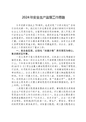 2024年安全生产监督工作思路今年是新中国成立75周年,也是实现十四五规划目标任务的关键一年,我们的工作总要求是:坚持以新时代中国特色社会主义思想为指导,全面贯彻落实党的精神,深入开展工贸行业安全生产治本攻坚三年行动,狠抓安全生产基础建设和执法质量提升,将防范化解重大风险和遏制重特大事故作为重中之重,以高水平安全服务高质量发展。各地区、各有关企业要认真研究制定实施方案,确保各项措施落实。在企业、监管、执法三个层面抓好以下重点工作:一、在企业层面,以强化关键少数责任落实为核心,重点抓好五件事。一是认真学习重大隐患判定标准。从执法小分队明查暗访情况来看,相当一部分企业负责人不清楚重大隐患判定标准是什么,不知道本单位有哪些重大风险。去年,应急管理部发布的10号令《工贸企业重大事故隐患判定标准》,明确了管理类、行业类、专项类共计64项具体判定情形,专家解读视频全都公布在网站上。企业主要负责人务必要把学习重大事故隐患判定标准,作为一项重大任务,逐项对号入座、逐条辨识排查。今年,各级执法小分队在检查企业时,要逢查必考,就是考核企业主要负责人对重大事故隐患判定标准的掌握情况,答不上来的,公开通报。二是强化重大隐患排查整改动态清零。事故隐患总是随着企业生产经营活动不断产生、动态存在,所以重大隐患动态清零是治本攻坚三年行动的核心任务之一。各企业务必要把重大隐患排查整改的责任扛在肩上、抓在手里,企业一把手要亲自带队,每季度(每月)检查一次,管生产、管安全、管技术的副职更要认真负起责任,消除重大隐患,建立重大隐患动态清零的常态化机制。要切记企业不消灭隐患,隐患将消灭企业,要认识到消除隐患就是提升企业人、机、环、管四个要素的质量,就是高水平安全和高质量发展的良性互动,相得益彰。如果企业不主动排查整改隐患,走过场、走形式,与监管部门躲猫猫,导致重大隐患长期存在,被执法检查发现就要一案双罚,涉及危险作业罪的,依法追究刑事责任。按照治本攻坚三年行动要求,2026年要形成重大隐患清零的常态化机制,我们工贸行业特别是钢铁、铝加工、粉尘涉爆企业要带头,今年年底前就要完成目标。三是抓好安全培训和逃生演练。要将本行业领域重大事故隐患排查整治要求作为培训的重点内容,按规定保障经费,组织员工进行教育培训,严格落实持证上岗和培训合格后上岗要求。工贸企业每年至少开展1次,金属冶炼、劳动密集型及厂中厂等类型企业至少每半年开展1次疏散逃生演练,让企业每一名员工都具备基本的应急常识和疏散逃生避险技能。四是发动企业员工报告隐患。发动群众、依靠群众是我们党的制度优势和优良传统,当前不少企业通过物质和精神奖励方式,激发广大员工主动排查问题隐患,有的企业主要负责人亲自给员工颁奖,取得了不错成效。XX、XX、XX等地已有机制办法,各企业主要负责人要积极借鉴这些经验做法,建立员工报告隐患内部奖励制度,鼓励员工发现隐患、反映问题,共同消除事故风险,建立起安全生产的人民防线五是提升企业本质安全水平。要依法落实建设项目安全设施三同时要求,新改扩建金属冶炼建设项目,主动向属地应急部门报备,依法履行三同时审查手续。要大力推广先进技术应用,淘汰落后的工艺技术设备,钢铁企业要加快推广煤气区域机器人巡检,铝加工(深井铸造)企业要禁止新改扩建项目使用固定式熔炼炉,粉尘涉爆企业采取自动打磨抛光、湿法除尘等减人降尘措施,要通过采用本质安全型工艺设备,加强风险监测预警系统建设应用,降低高危场所现场作业风险。各企业要积极参与标准化达标创建,提高企业基础管理水平。二、在工贸行业监管层面,要以开展治本攻坚为核心提高监管穿透力,重点抓好五件事。一是聚焦三高风险实施精准整治。工贸行业量大面广、风险因素复杂,我们的监管力量又十分薄弱,各地区一定要把遏制重特大事故作为重中之重,结合本地区实际情况,突出金属冶炼、粉尘涉爆、涉氨涉氯等高风险领域,高温熔融金属、煤气、喷涂等高风险场所,有限空间、筒仓清库、检维修等高风险作业,明确重点整治任务,突出重点企业,聚焦检查重点,在精准排查整治上持续发力,坚持小切口、抓关键,不搞大而全,避免眉毛胡子一把抓。二是大力推进安全生产标准化管理体系建设。今年应急部将进一步优化安全生产标准化定级制度,我们也要加大力度推进二、三级企业创建,严格创建评审、抽查、撤销全流程管控,实施重大事故隐患一票否决。对标准化达标企业落实减少安全执法检查频次、工伤保险和安责险费率下浮、信贷信用等级上浮等激励政策,增强企业安全管理的内生动力。三是着力抓好重点地区帮扶指导。今年应急部将选取15个左右重点县继续开展有限空间作业专家指导服务,大力宣贯《工贸企业有限空间作业安全规定》,落实有限空间作业监护人负责制。将选取钢铁铝加工、粉尘涉爆企业集中的若干重点地区,组织执