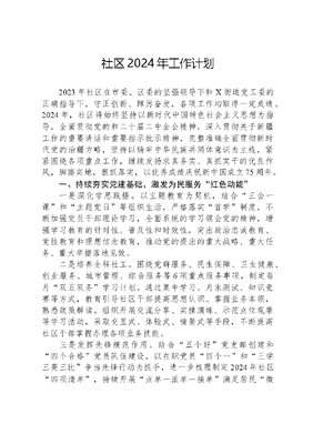 社区2024年工作计划2023年社区在市委、区委的坚强领导下和X街道党工委的正确指导下,守正创新、踔厉奋发,各项工作均取得一定成绩。2024年,社区将始终坚持以新时代中国特色社会主义思想为指导,全面贯彻党的和二十届二中全会精神,深入贯彻关于新疆工作的重要讲话和重要指示批示精神,完整准确全面贯彻新时代党的治疆方略,坚持以铸牢中华民族共同体意识为主线,紧紧围绕各项重点工作,继续发扬求真务实、真抓实干的优良作风,脚踏实地,狠抓落实,以优秀成绩庆祝新中国成立75周年。一、持续夯实党建基础,激发为民服务红色动能一是深化学思践悟。以主题教育为契机,结合三会一课和主题党日等组织生活,严格落实首学制度,不断加强党员干部理论学习,全面系统的学习领会党的精神,增强学习教育的针对性、普及性和时效性,突出政治忠诚教育、党性教育和理想信念教育,推动党的提出的重大战略、重大任务、重大举措落地见效。二是培养全科社工。围绕党群服务、民生保障、卫生健康、创业服务、城市管理、综合服务等6项重点服务事项,制定每月双五双务学习计划。通过集中学习、月末测试、知识竞赛等方式,教育引导社区干部提高思想认识、掌握业务本领,熟悉政策解读。组织开展交流分享、实操演练、示范点位观摩等学习活动,采取交互式、体验式、情景式等手段,不断提高社区干部掌握办理各项业务技能。三是发挥先锋模范作用。结合五个好党支部创建和四个合格党员队伍建设,以在职党员四个一和三学三亮三比争当先锋行动为抓手,进一步梳理制定2024年社区四项清单,持续开展点单-派单-接单满足居民微心愿活动,优化志愿服务激励机制,以清单化监督履职效果,推动各项工作有效落实。结合社区实际,谋深谋细2024工作,推动党建工作再上新台阶。二、持续突出党建引领,激活基层治理核心力量一是建强党员中心户。坚持因地制宜、居住相邻、易于集中、便于管理的原则,划分党员中心户。采取个人自荐、党组织推荐、党员居民联荐等方式,推选党性观念强、积极热心、乐于奉献的党员担任党员中心户,负责联系和组织社区内的党员和群众参与社区建设,构建以党员中心户为核心,党支部指导、党员靠前、群众参与共治的一核多元运行机制,实现一户带一片,多片带整体的效益。二是推进四位一体协调机制。在有物业小区和无物业小区分类施策,在党组织的领导下设立居民议事会,对重大事项进行民主协商、共同决策。积极推行小区党员和业主提议,居民小组和业主委员会审议,通过召开四位一体协调会议决议,物业公司、行业主管部门办理,解决问题、办理结果公开的议事办理机制,解决小区治理难题,提升社区居民的满意度。三是推动共驻共建。严格落实大党委会议制度,积极调动大党委成员单位参与社区工作重大决策和重要活动,商议决定社区建设、管理、服务方面的重大问题,推动辖区单位党组织与社区党组织结对共建。结合在职党员双报到活动,着力抓好平急转换能力建设和力量储备,将警格长、社区干部、在职党员、志愿者、网格员、物业服务人员、卫生服务站医务人员等分组编队,成立服务队、党员突击队,平时服务群众、战时应急处突。三、持续推进社会治理,构筑平安建设强力磁场一是夯实网格化管理。以网格化管理为抓手,推动警网深度融合,着力做优服务、做细管理,全力打造支部建在网格上、党员深入网格中、事务处理网格内的基层治理体系,切实把民生实事办理在基层、矛盾纠纷化解在基层、群众需求解决在基层,以网格化管理小支点撬动基层治理大能量,真正做到小事不出网格、大事不出社区。二是深化平安社区建设。坚持线下+线上宣传,加强对《民法典》、禁毒反邪、养老诈骗、扫黑除恶、食品安全等知识宣传,扩大普法宣传面。紧盯9类人,及时掌握重点人员的动态情况,持续开展关心关爱,确保重点人员情况稳定、安全可控。定期开展流动人口大清查、大排查工作,特别是空置房屋、半拆迁房屋的排查,消除安全隐患,全力以赴保障辖区群众的安全。三是强化安全生产排查整治。持续开展安全隐患大排查大整治工作。继续深入开展三合一场所专项整治行动、安全生产大检查。继续推进自建房消防隐患排查工作,加大对引线充电、燃煤取暖、一插多用等督查整改。继续推进小区公共安全设施建设,加大对高层建筑消防设施、地下室及楼道占用等督查整改。积极开展公共安全宣传工作,加强巡逻和宣传力度,提高社会风险防范水平和应急处置能力。四、持续推进民生建设,解锁融合共治幸福密码一是不断强化精神文明建设。结合学习精神,打造特色宣讲+主题活动,推动群众性精神文明创建活动纵深发展,激发、凝聚辖区群众向上向善向美的精神力量,打造更具美誉度和传播力的社区品牌。通过3.5雷锋日、文明实践日、我们的节日等引导居民积极参与志愿服务,广泛