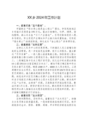 XX乡2024年工作计划一、着重打造五个基地。牢固树立绿水青山就是金山银山理念,争取民族地区乡村振兴发展资金150万元,重点打造楠竹、竹笋、烟草、腊肉腊鸭、高山冷水鱼五个产业基地,引导村集体投资入股、参与建设,努力实现产业帮扶和产业振兴的双重效益,切实把绿水青山的美丽颜值,转化成为金山银山的丰厚价值。二、着重推进五件实事。坚持以人民为中心的发展思想,不断满足人民日益增长的美好生活需要,进一步完备民生保障、提升公共服务,重点解决五件实事。一是八面山旅游集散公路。加快推进八面山旅游集散公路11.651公里建设任务,确保项目安全有序如期完工。二是镇区集中饮水工程扩容项目。拟从白沙村水源点新接10公里DN110水管至镇区自来水厂,解决节假日镇区集中供水系统水量不足问题,确保1300余户、6000余人用水稳定。三是周塘村安全水项目。拟从青腰村老青市组延伸DN75管道10公里至周塘村,着力解决周塘村茶果场、干垅等组用水量不够问题。四是连坪片区至天鹅山资源产业路建设项目。拟硬化田坪村庄子坑组至天鹅山林场3公里5米宽资源产业路,解决连坪片区出行难、出材难问题。五是陈家河河道治理项目。整治河道1.5公里、新修护坡及雨污沟,解决陈家河汛期泄洪不畅及河水渗入集镇污水处理系统削弱污水处理效率问题,进一步保障汛期陈家河行洪安全。三、着重攻坚五大项目。坚持问题导向、目标导向,着重攻坚五大项目,助推全乡各项事业高质量发展。一是桂新高速征地拆迁项目。有序高效推进仓田、团桥、青腰、周塘、坪田等村涉高速地段征地拆迁,为桂新高速公路建设提供良好施工环境。二是林光互补光伏发电项目。加速推进连坪成康林光互补光伏发电项目140MW光伏设备建设进度,力争尽快落地投产。该项目总投资5.32亿元,预计年平均发电12727.7万千瓦时。三是亿兴竹业竹制品综合开发利用项目。该项目计划改造3栋生产车间,建设竹炭生产线一条、凉席片生产线一条、竹筷竹板材生产线一条。项目建成后,年产竹板材3000吨、竹筷6000吨、竹席片4万吨、竹炭1万吨。四是八面山旅游开发项目。按照八面山旅游开发规划,依托自身自然风光、产业特色、民俗风情,完善相关配套基础设施,集中打造高山营地、珍稀植物观光园、精品民宿等体验项目。五是S344线道路扩宽项目。拟争取S344线(兴宁何家山-XX乡青腰村段)道路扩宽项目,对现有8米宽道路进行扩宽。