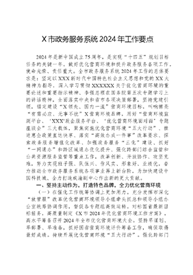 X市政务服务系统2024年工作要点2024年是新中国成立75周年,是实现十四五规划目标任务的关键一年。做好优化营商环境和提升政务服务各项工作,使命光荣、责任重大。全市政务服务系统2024年工作的总体要求是:坚定以XXX新时代中国特色社会主义思想和党的XX大精神为指导,深入学习贯彻XXXXXX关于优化营商环境的重要论述和重要指示精神、李强总理在国务院第五次专题学习上的讲话精神,全面落实中央和省市各项决策部署,坚持党建引领,锚定建设X领先、国内一流营商环境目标,叫响擦亮有需必应、无事不扰X营商环境品牌,用好营商环境监测平台、XXX政企服务平台、优化营商环境面对面专题座谈会三大载体,聚焦实施优化营商环境五大行动、推进惠企政策直达快享、落实高效办成一件事改革要求、探索政务服务增值化改革、加强政务服务三化建设、抓好一网通办和跨区域通办优化提升、强化跨部门综合监管和公共资源服务监管等重点工作,改革创新、开放协作、攻坚克难,努力实现班子强、队伍兴、作风实、形象好、业绩优,奋力推动全市政务服务系统各项事业再上新台阶,为加快建设中国科技城、全力打造成渝副中心作出新的更大贡献。一、坚持主动作为,打造特色品牌,全力优化营商环境(一)在强化工作统筹协调上更加用力。充分发挥市深化放管服改革优化营商环境领导小组牵头抓总和领导小组办公室统筹协调作用,督促各专题组高效运转。对标国省最新目标任务,高质量制定《X市2024年优化营商环境工作方案》,高水平筹备召开2024年全市优化营商环境大会。坚持早谋划、早部署、早准备,抓好国省营商环境评价筹备工作,确保取得最好成绩。持续开展优化营商环境五大行动。强化跨部门综合监管、互联网+监管。(二)在强力推进重点领域改革上更加用力。加强对各地各部门营商环境工作的协调、督促,推动《X市优化营商环境攻坚行动方案(2023-2025)》《X市打造有需必应、无事不扰营商环境19条措施》等重要文件落地落实。以成本控制为核心,加快行政审批流程再造、水电气接入零成本、深化工程建设项目审批制度、房产交易和不动产登记、涉企一类事增值服务等重点领域改革,实现成本更低、效率更高、服务更优。(三)在强化突出问题整治上更加用力。常态化开展招投标、工程建设项目审批、企业转供电加价、司法系统行政执法等营商环境突出问题整治行动。全力抓好国省营商环境评价反馈问题整改工作,实现以评促改、以评促建、以评促优。用好营商环境监测平台,以数字化手段提升监督监管的及时性、有效性和精准性。根据省发展改革委要求,做好营商环境指标日常监测,指导县市区参加全省营商环境日常监测,定期对我市数据开展分析,形成分析报告,做好结果运用。(四)在强化典型经验宣传推广上更加用力。加强对全市营商环境各个领域新经验、新成效的总结提炼和宣传力度,广泛宣传我市营商环境取得的成效,选树先进典型、发挥引领作用,叫响擦亮有需必应、无事不扰X营商环境品牌。二、坚持群众视角,强化区域协同,着力提升办事体验(五)扎实推进高效办成一件事集成化改革。把高效办成一件事作为优化政务服务、提升行政效能的重要抓手,聚焦个人、企业全生命周期涉及的一揽子事,主动发现问题、解决问题,认真落实国家13个一件事一次办服务场景,开展国家13个、省47个一件事综窗改革流程再造。全面落实《X市一件事一次办集成化改革实施方案》,加强相关业务培训,确保服务场景落地可办。按照职责分工,全力以赴做好无证明城市建设和高效X建设相关工作。文可居文库——海量学习资料,手机电脑均可下载www.wenkeju.com(六)启动政务服务增值化改革。整合涉企服务资源,优化园区企业(政务)服务中心,推动涉企服务从多头分散转变为一站集成。选取政务服务基础较好、市场主体较多的县(市、区)开展政务服务增值化改革试点,聚焦企业全生命周期、全产业链条需求,围绕重点产业,完善企业、项目全生命周期服务,建立政府、社会、市场协同推进机制,大力提升政务服务水平,不断优化企业发展环境。(七)持续推进政务服务三化建设。深化综窗改革,除医保、社保、不动产、公积金、公安(出入境和户政)、税务等六类外,依申请类政务服务事项纳入无差别综合窗口一窗受办率达到70%以上。做实企业服务中心和重大项目服务专区,健全重大项目全生命周期管理服务机制。持续优化镇村便民服务建设,推动更多高频事项下沉镇村,实现乡镇(街道)便民服务事项平均达到220项以上、村级代办事项平均达到60项以上。深化政务服务+,探索政务服务+供销、农村产权交易等,促进资源要素在城乡有序流动,创建一批便民服务+供销服务综合体和星级便民服务中心。对标一流,创建县级政务服务标杆大厅。(八)切实抓好
