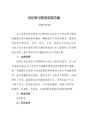 党纪学习教育实施方案 2024-04-14为认真贯彻落实党的XXX精神和XXXXXX关于党纪学习教育的重要讲话和重要指示精神,增强党员干部纪律意识,教育引导党员干部学纪、知纪、明纪、守纪,按照中共中央办公厅《关于在全党开展党纪学习教育的通知》和上级党委工作部署,结合实际,就开展党纪学习教育制定如下实施方案。一、指导思想坚持以XXX新时代中国特色社会主义思想为指导,深入学习贯彻XXXXXX关于党纪学习教育的重要讲话和重要指示精神,进一步增强企业党员干部对党章党规党纪的认知水平和敬畏意识,筑牢拒腐防变的堤坝,教育引导广大党员干部学纪、知纪、明纪、守纪,搞清楚党的纪律规矩是什么,弄明白能干什么、不能干什么,坚定信仰信念、严守纪律规矩、改进工作作风,知敬畏、存戒惧、守底线,为高质量发展提供坚强纪律保障。二、参加对象全体党员三、时间安排2024年4月至7月四、具体内容(一)进行工作动员部署1.召开专题会议,作出动员部署,研究具体措施。2.印发具体实施方案,作出总体学习安排。3.成立领导小组及相关指导机构,明确职责分工。(二)明确总体学习要求1.要准确把握党纪学习教育的目标要求,聚焦学党纪主线,以学习贯彻新修订的纪律处分条例为重点,逐章逐条学、联系实际学,用好理论学习机制、完善学习内容、提升学习质量。2.要加强警示教育,开展以案说德、以案说纪、以案说法、以案说责,发挥警示、震慑、教育作用,使党员干部受警醒、知敬畏、守底线。3.要做到一体推进,既抓好党员领导干部这个关键少数,又突出对新提拔干部、年轻干部、关键岗位干部等重点对象的纪律培训,把党纪学习教育各项工作安排贯通起来,注重融入日常、抓在经常。(三)细化具体工作安排1.明确学习重点。抓好《中国共产党章程》《中国共产党文可居文库——海量学习资料,手机电脑均可下载www.wenkeju.com纪律处分条例》《中国共产党问责条例》《中国共产党党内重要法规汇编》和《中华人民共和国监察法》等内容的集中学习教育,引导全体党员干部存戒惧、知敬畏、守底线 。用好学习强国等网络平台,开展好线上学随身学。2.举办专题读书班和辅导培训班。每个专题安排* 天时间进行集中学习。4月下旬、5月上旬,围绕重点学习内容,举办第一、第二专题读书班;5月下旬,举办第三专题读书班,6月中旬举办第四专题读书班。邀请上级单位领导专家或者市委党校教授进行专题授课,教育引导党员干部增强党性观念、纪律规矩意识。3.深化党委理论学习中心组学习。把《中国共产党纪律处分条例》等法律法规作为重要学习内容,纳入理论学习中心组学习计划,要求中心组成员联系思想和工作实际深入交流研讨,深入剖析问题,提出改进学习和工作的思路措施。4.讲好专题党课。党(工)委书记及班子成员结合学习体会和实际工作带头讲专题党课,各党支部书记结合所在单位实际情况,在学习调研的基础上为支部党员干部讲专题党课。5.过好主题党日。采取三会一课等方式,通过交流研讨提升学习效果,适时组织党员到红色教育资源和党性教育基地开展学习,砥砺理想信念和初心使命。指导各群团组织文可居文库——海量学习资料,手机电脑均可下载www.wenkeju.com采取座谈交流、青年学堂、主题征文、微课堂等形式,组织干部职工畅谈学习体会。6.加强警示教育。开展一次警示教育大会,通报违纪违法案件,使党员领导干部受警示、明纪法、促整改,进一步筑牢廉洁从政底线。要求每一位党员干部认真撰写心得体会,引导党员领导干部从典型案例中汲取深刻教训,深入开展交流讨论,引以为戒,严守党纪国法。7.开展反腐倡廉宣传教育月主题活动。组织开展清正廉洁好故事、漫画、微动漫或短视频征集评选活动,通过微信公众号、宣传展板、多媒体展示屏进行展示。有针对性地开展党纪知识竞赛、主题征文等活动,激发党员干部学习党纪的热情和积极性。8.召开专题组织生活会。领导干部率先垂范、身体力行,以普通党员身份参加所在党支部的组织生活会,全体党员干部要结合集体学习、个人自学和警示教育活动的收获,结合岗位职责和履职尽责等情况,谈认识、谈体会,对照严的要求和实的作风标准,深入查摆问题,深刻剖析原因,主动开展批评与自我批评,并就存在问题提出努力方向和改进措施。五、工作要求(一)提高政治站位,强化责任担当。各单位要高度重视文可居文库——海量学习资料,手机电脑均可下载www.wenkeju.com主要负责同志要站在两个维护的高度,主动承担起第一责任人责任,结合工作实际,对学习教育及时安排部署,精心组织实施,确保实现学习教育对象全覆盖。班子成员要率先垂范,先学一步、再学一遍、学深一层,切实发挥示范引领作用。(二)加大宣传力度,营造良好氛围。各单位要广泛宣传开展党纪学习教育年的重要意义、活动内容,调动全体党员