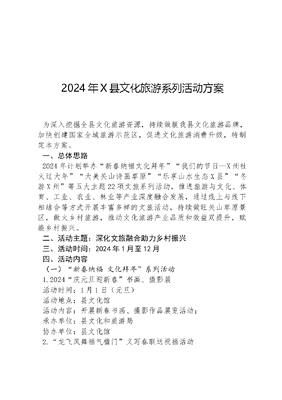 2024年X县文化旅游系列活动方案为深入挖掘全县文化旅游资源,持续做靓我县文化旅游品牌,加快创建国家全域旅游示范区,促进文化旅游消费升级,特制定本方案。一、总体思路2024年计划举办新春纳福文化拜年我们的节日—X州社火过大年大美关山诗画草原乐享山水生态X县冬游X州等五大主题22项文旅系列活动,推进旅游与文化、体育、工业、农业、林业等产业深度融合发展,通过线上与线下相结合等方式开展丰富多样的文旅活动,持续做旺关山草原景区,做火乡村旅游,推动文化旅游产业品质和效益双提升,赋能乡村振兴。二、活动主题:深化文旅融合助力乡村振兴三、活动时间:2024年1月至12月四、活动内容(一)新春纳福 文化拜年系列活动1.2024庆元旦迎新春书画、摄影展活动时间:1月1日(元旦)活动地点:县文化馆活动内容:开展新春书画、摄影作品展览活动;承办单位:县文化和旅游局协办单位:县文化馆 2.龙飞凤舞福气楹门义写春联送祝福活动活动时间:1月下旬—2月上旬活动地点:X州泰和广场活动内容:音乐快板、秦腔小戏、小品等文艺节目演出;县书协成员、书法爱好者义写春联送群众。承办单位:县文化和旅游局协办单位:县文化馆 3.龙腾盛世·欢乐X县2024年春节联欢晚会活动时间:1月31日-2月1日活动地点:县体育馆活动内容:通过舞蹈、歌曲、快板等主题鲜明、内容丰富、形式多样的表演节目,凸显团结、欢乐、喜庆、祥和的晚会氛围,为全县人民奉献一台匠心别具、异彩纷呈、特色鲜明、富有记忆、乡愁和年味浓厚的春节联欢晚会。承办单位:县委宣传部 县文化和旅游局协办单位:县文化馆 县融媒体中心(二)我们的节日—X州社火过大年系列活动4.2024年我们的节日—X州社火过大年暨全省民间社火大赛及展演活动时间:2月22日(农历正月十三)活动地点:X州社火广场活动内容:X州秦鼓《秦·启》、广场舞《中国社火》等文艺演出,举行X州社火过大年暨全省民间社火大赛开幕式,由陕西省文联在全省遴选15支优秀社火队举行民间社火大赛;组织全省各地市参赛队伍及X县各类社火方阵进行社火闹春 狂欢X州社火巡游。巡游线路:宝平路集中,经社火广场南口进入,经过主会场展演,社火广场北口出,沿迎宾大道—东大街—西门口—新建路—千邑桥头(解散)。承办单位:县委宣传部 县文化和旅游局县文化馆 县融媒体中心文可居文库——海量学习资料,手机电脑均可下载www.wenkeju.com协办单位:各镇人民政府 相关部门 5.民间社火传承保护大讲堂活动时间:2024年2月22日下午3:00(农历正月十三)活动内容:拟邀请民俗专家,围绕《陕西三大地域的社火文化特点与陕西地域文化》、《社火非物质文化遗产与乡村振兴》、《从民间社火的生存现状谈民间文化保护传承》等主题,讲授民间社火保护传承、非遗赋能乡村振兴路径等相关知识。 承办单位:县委宣传部 县文化和旅游局协办单位:县文化馆 县融媒体中心各镇人民政府 相关部门 6.多彩X州 魅力乡村民间社火展演活动时间:2月14日-2月23日(农历正月初五至正月十四)活动地点:各镇、村活动内容:特色社火民俗村开展民间社火展演、展示活动。承办单位:县委宣传部 县文化和旅游局协办单位:县文化馆 县融媒体中心各镇人民政府 相关部门7.X州民间工艺品制作展示展销活动时间:2月21日—2月23日(农历正月十二至正月十四)活动地点:X州社火广场活动内容:组织我县花灯、剪纸、皮影、脸谱绘制、刺绣等艺人进行现场制作展示展销。承办单位:县委宣传部 县文化和旅游局协办单位:县文化馆 县融媒体中心各镇人民政府 相关部门 8.迎新春·闹元宵灯谜竞猜活动时间:2月23日晚(农历正月十四)活动地点:大型广场或有关单位文可居文库——海量学习资料,手机电脑均可下载www.wenkeju.com活动内容:以我县手工艺人制作的花灯为主,开展有奖灯谜竞猜活动。承办单位:县政府办(金融办) 县人行协办单位:县域内相关金融机构9.正月十五元宵节社火游演活动时间:2月24日(农历正月十五)活动地点:X县县城活动内容:由县级有关部门及各镇组织社火队,进行大型社火游演活动。巡游线路:宝平路集中,经社火广场南口进入,经过主会场展演,社火广场北口出,沿迎宾大道—东大街—西门口—新建路—千邑桥头(解散)。承办单位:县委宣传部 县文化和旅游局 协办单位:县文化馆 县融媒体中心县公安局 各镇人民政府各部门及相关企事业单位