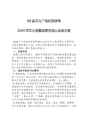XX县文化广电和旅游局2024年文化进基层惠民演出实施方案2024年文化进基层惠民演出工作已列入我县民生工程项目,为做好惠民演出工作,切实达到给基层送文化惠民生目的,结合我县实际,制订实施方案如下:一、主要任务按照上级工作要求,2024年我县全年开展120场惠民演出活动,将惠民演出活动贯穿全年、覆盖城乡,做到惠民便民、均等普惠,在内容和场次上,与优秀传统文化结合起来,与培育壮大文化艺术团体,特别是社会、民间文艺团体结合起来。安排一定比例购买社会文艺团体场次演出服务。二、演出主体和内容要求1.演出性质。文化进基层惠民演出性质为文艺团队到基层开展的送文化演出活动,形式为面向基层群众开展免费演出,群众无须付费。不包括营业性或商业性演出、线上演出。2.演出主体。各级各类艺术表演单位,包括国有文艺院团、文化馆等公共文化机构、艺术院校演出团队、优秀民营表演团体、优秀业余表演团体等。购买服务入选的文艺团体须有营业性演出资质,演出质量较好。不包括以群众为主体的展示展演类的村晚、群众合唱、广场舞、服装走秀等群众文化活动及公共文化机构开展的免费培训类活动。3.演出内容。戏曲、综艺演出、曲艺、杂技、舞蹈、歌舞剧、音乐会等类型。演出内容符合社会主义核心价值观要求,主题思想健康向上。三、实施时间2024年1月至12月,分为三个阶段。1.全面启动阶段(11月20日前):制定实施方案和演出计划,并将实施方案、演出计划和联系人上报市文广旅局艺术处。2.集中演出阶段(1月—12月):按照演出计划安排,组织当地相关演出团体开展演出活动,确保按时完成演出任务。3.总结验收阶段(2024年12月15日):县文广旅局对演出工作进行资料收集,撰写总结报告。四、相关要求1.坚持正确导向。坚持以人民为中心的工作导向,致力于传承和发展中华优秀传统文化。确保内容健康向上、形式丰富多样、艺术表现精湛。2.明确要求。每场演出时长不少于60分钟,综艺(综合)类演出节目数量不少于5个;综合类演出无论包括几个剧/节目一律按1场统计。3.确保质量。要坚持质量优先,确保按照时间节点完成演出任务。4.加强安全保障。要树立安全第一的思想,加强安全教育,完善管理制度。指导演出单位做好演出现场安全管理、疫情防控等工作,做好安全预案,加强宣传引导,确保活动顺利实施和观众安全观演。文可居文库——海量学习资料,手机电脑均可下载www.wenkeju.com