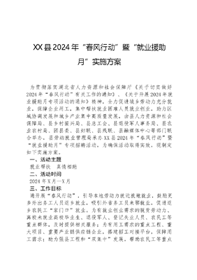 XX县2024年春风行动暨就业援助月实施方案为贯彻落实湖北省人力资源和社会保障厅《关于切实做好2024年春风行动有关工作的通知》、《关于开展2024年就业援助月专项活动的通知》精神,全力促进城乡劳动力充分就业,保障企业用工,集中帮扶就业困难人员就业创业,助力区域协调发展和城乡产业集中高质量发展,由县人力资源和社会保障局、县乡村振兴局、县总工会、县退役军人事务局、县农业农村局、团县委、县妇联、县残联、县融媒体中心等部门联合举办,县劳动就业管理局承办XX县2024年春风行动暨就业援助月专项招聘活动,为确保活动取得实效,现制定如下实施方案。一、活动主题就业帮扶 真情相助二、活动时间2024年X月—X月三、工作目标通开展春风行动,引导本地劳动力就近就地就业,鼓励更多外出务工人员返乡就业,吸引外省务工员来鄂就业,促进返乡农民工家门口就业。为有就业创业需求的脱贫劳动力、离校未就业高校毕业生、退役军人、登记失业人员、农民工等重点群体,及时提供相关服务;为有用工需求的重点工程、重大项目、重要产业链供应链企业,搭建招工对接平台,保障用工需求;助力强县工程和双集中发展。帮助农民工等重点群体尽快就业创业。四、活动内容及安排(一)调查摸底1.开展农民工返乡情况调查。充分利用农民工春节返乡时机,深入乡镇(街道)、村(社区)开展就业访民情活动,对春节前返乡的外出务工农民工进行调查摸底,重点摸清农民工春节前返乡情况和春节后返岗就业意向、就业创业需求,建立返乡农民工实名台账,并于2024年1月10日—2月8日期间,对2023年11月1日起的返乡农民工进行返乡返岗监测,数据信息实施动态更新。(牵头单位:县人社局,责任单位:各乡镇<区>)2.开展企业用工需求调查。深入本地重点企业、工业园开展访企问需活动,全面掌握企业当前用工情况和春节后用工需求,更新完善企业用工需求和岗位信息台账,制定县内企业用工需求清单。(牵头单位:县人社局,责任单位:各乡镇<区>)3.开展城乡劳动力就业培训情况调查。抓住务工人员集中返乡时机,对全县劳动力就业培训需求情况进行调查摸底,重点摸清脱贫劳动力、失业人员、退役军人、下岗职工等重点群体就业创业意愿、培训需求,有针对性的开设适合返乡人员的技能培训工种和创业培训课程,帮助返乡人员提升就业创业能力,完善本地重点产业职业培训需求指导目录,及时向社会发布,指导劳动者选择产业急需缺工种参训,促进就近就地就业。(牵头单位:县人社局,责任单位:各乡镇<区>、县乡村振兴局、县退役军人事务局、县农业农村局、县妇联、县残联、县总工会、团县委、县教育局)(二)政策宣传1.线上宣传。加强与新闻媒体的密切联系,充分利用广播电视台、抖音直播公众号、QQ、微信、手机短信平台、XXV讯、XX在线、湖北公共招聘网等媒体平台进行全方位、广泛持续开展文可居文库——海量学习资料,手机电脑均可下载www.wenkeju.com宣传活动,高频次发布就业惠民政策,使更多的劳动者知晓、熟悉、参与到春风行动中来,不断提高春风行动的品牌知名度、影响力。(牵头单位:县人社局,责任单位:县就业工作领导小组成员单位、县融媒体中心、各乡镇<区>)2.线下宣传。制定《致全县外出务工朋友们的一封信》、《人社惠民政策清单》、《春风卡》、《县内重点企业用工需求清单》。通过开展春风行动、就业援助月等专场招聘活动,开展政策进企业、政策进村(社区)等活动,现场发放人社惠民政策和企业用工信息;通过车站悬挂横幅(宣传牌、宣传标识)、室内外电子屏、广告车、大喇叭等形式,全方位持续宣传人社惠民政策和企业用工信息,为劳动者送政策、送信息、送服务,把政策、信息送到千家万户。(牵头单位:县人社局,责任单位:县就业工作领导小组成员单位、县融媒体中心、各乡镇<区>)(三)开展线上线下招聘活动1.活动时间及地点①线上招聘。通过XX县劳动就业管理局官方抖音公众号、XX电视台、湖北公共招聘网进行直播带岗,从2024年X月X日-2024年X月X日持续开展线上招聘活动。②线下招聘。计划10场次,具体时间地点如下:时间:2024年1月30日上午9:00 地点:XX镇时间:2024年1月31日上午9:00 地点:XX镇2.活动分工此次活动成立宣传报道、会场布置、人员组织、后勤保障四个工作组,具体分工如下:①宣传报道组。负责联系电视台记者进行宣传报道、现场采访。通过室内外电子屏、广告车以及抖音、微信、QQ、劳务经纪人、论坛等平台线上线下发布招聘会信息。活动现场全程抖音直播招聘活动。(牵头单位:县人社局,责任单位:县融媒体中心、文可居文库——海量学习资料,手机电脑均可下载www.wenkeju.com各乡镇<区>)②会场布置组。负责活